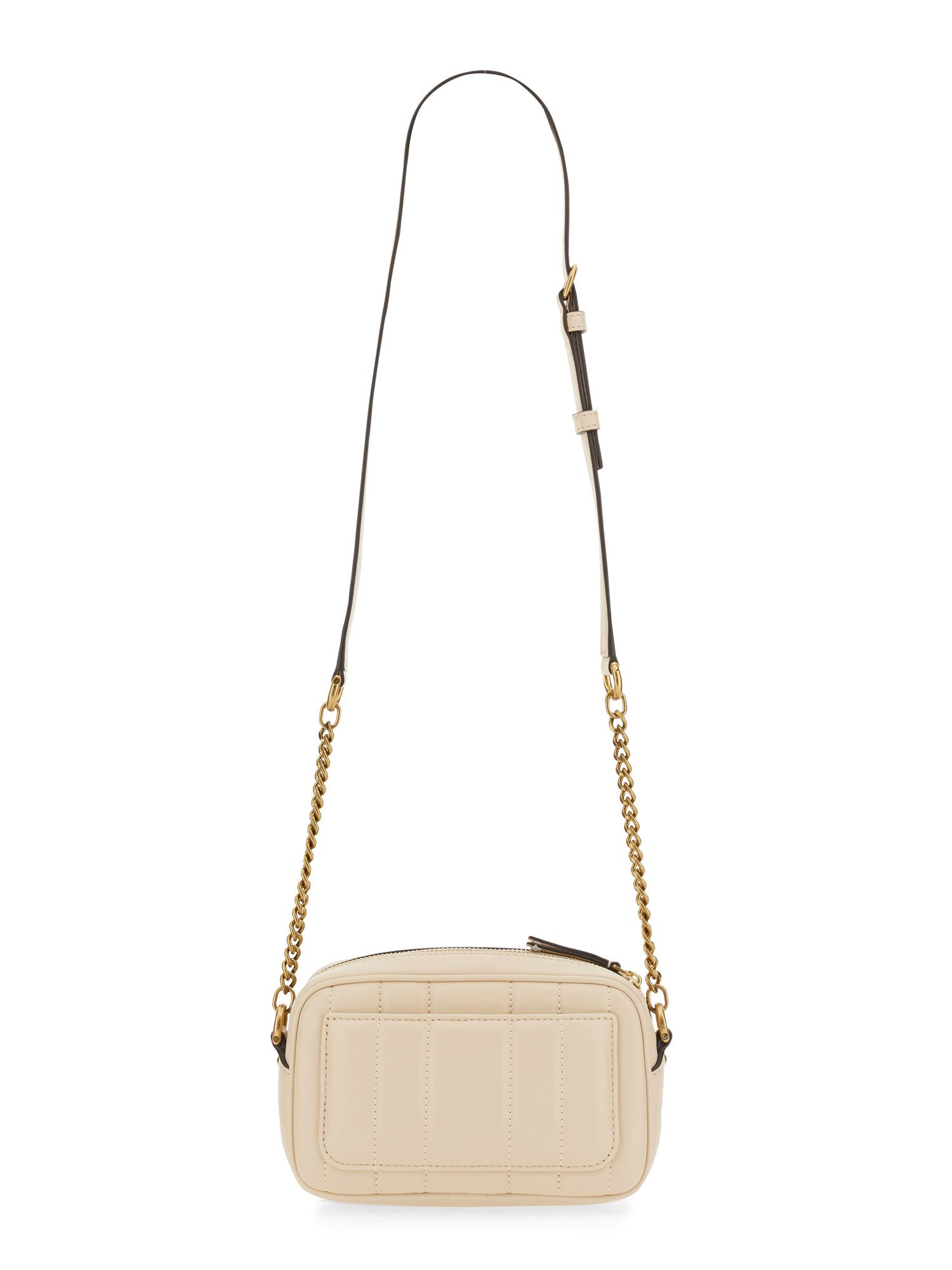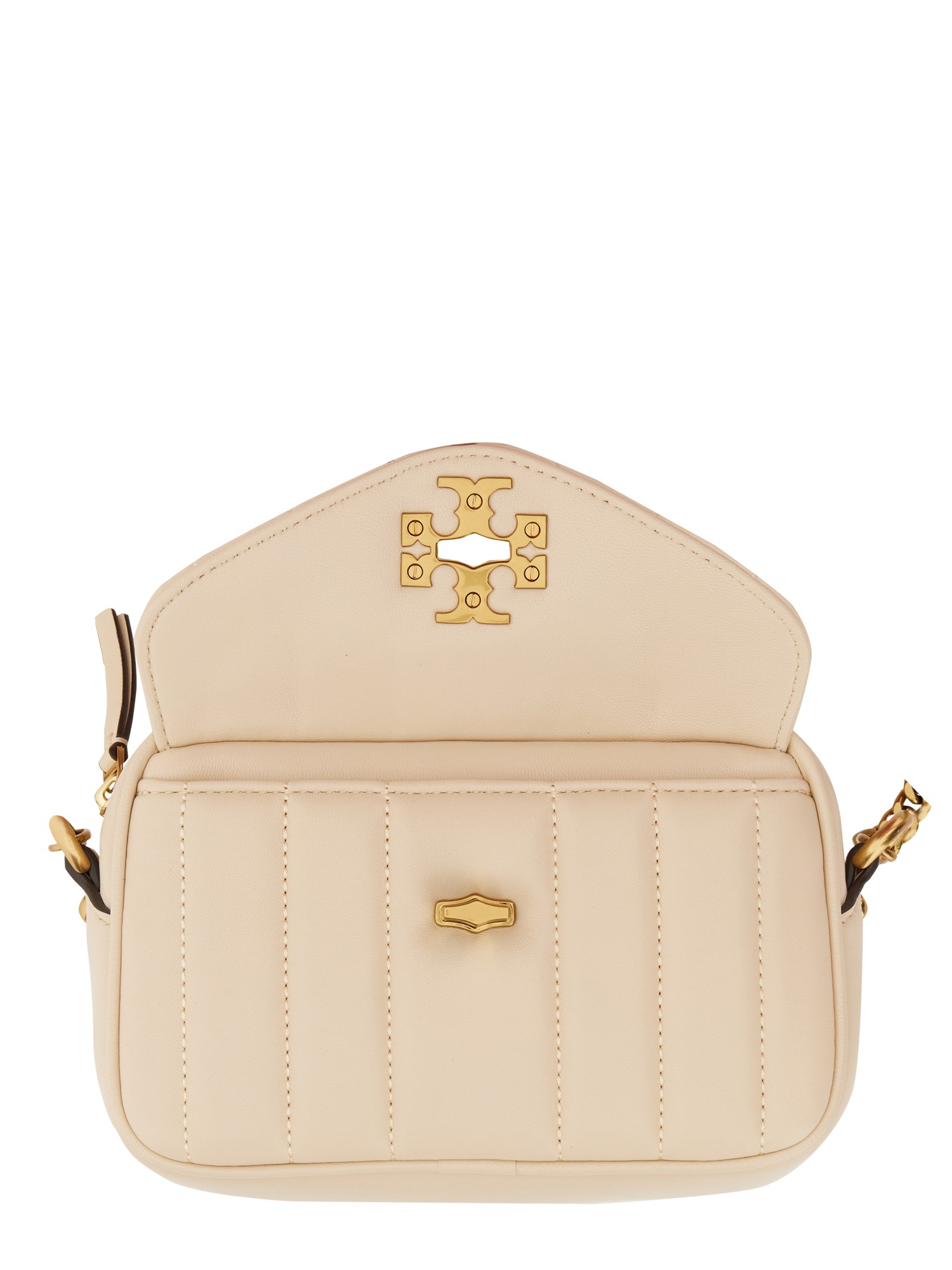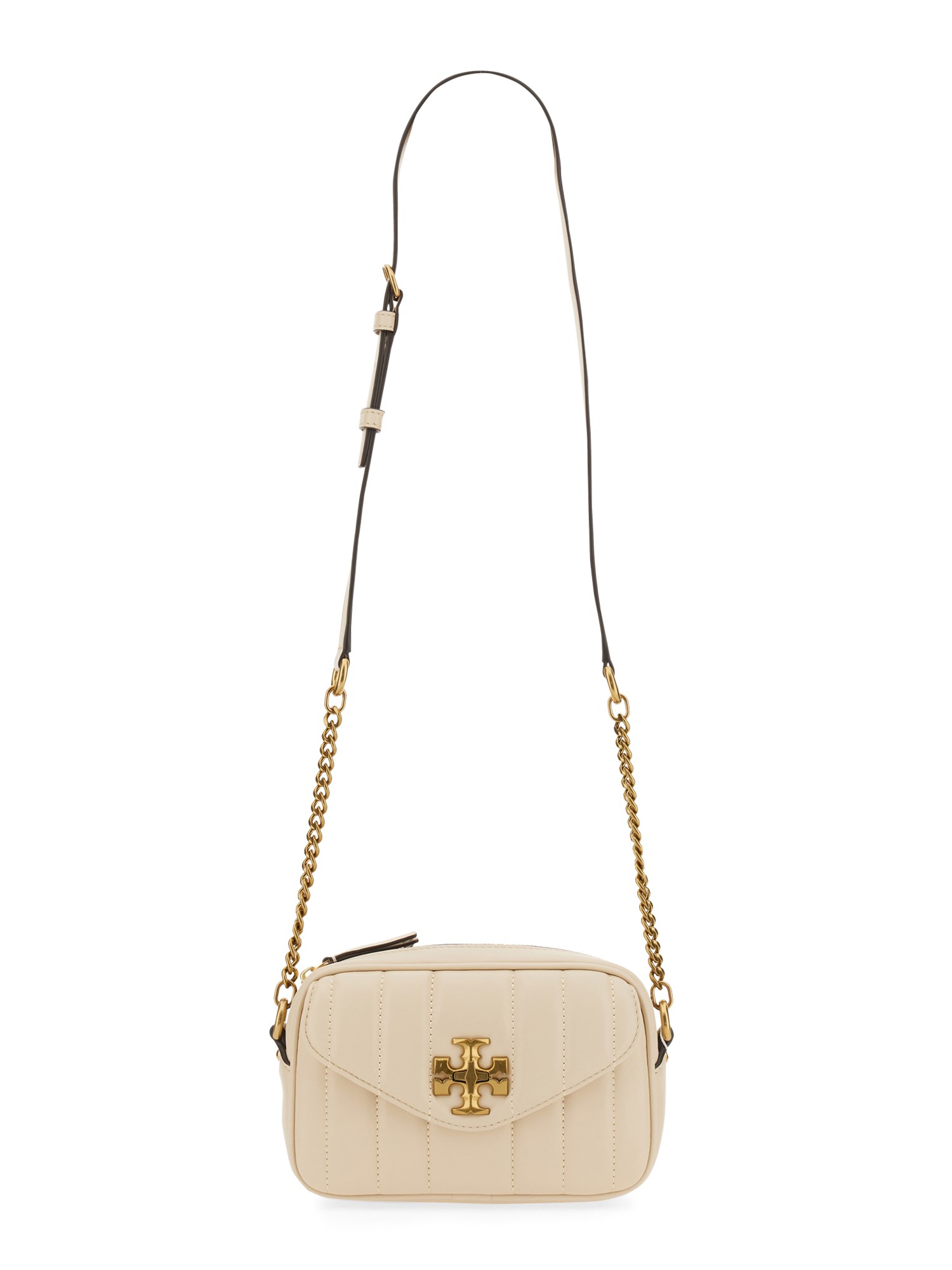 Ladies, this is the perfect bag for you! With a sleek and stylish design, this Kira bag by Tory Burch is sure to get you noticed. It's the perfect size for any occasion and features a top zip closure and the main compartment. The bag has a back pouch pocket, an inside zipper pocket, and front logo detail. With the adjustable leather and chain shoulder strap, you can carry the bag with ease.