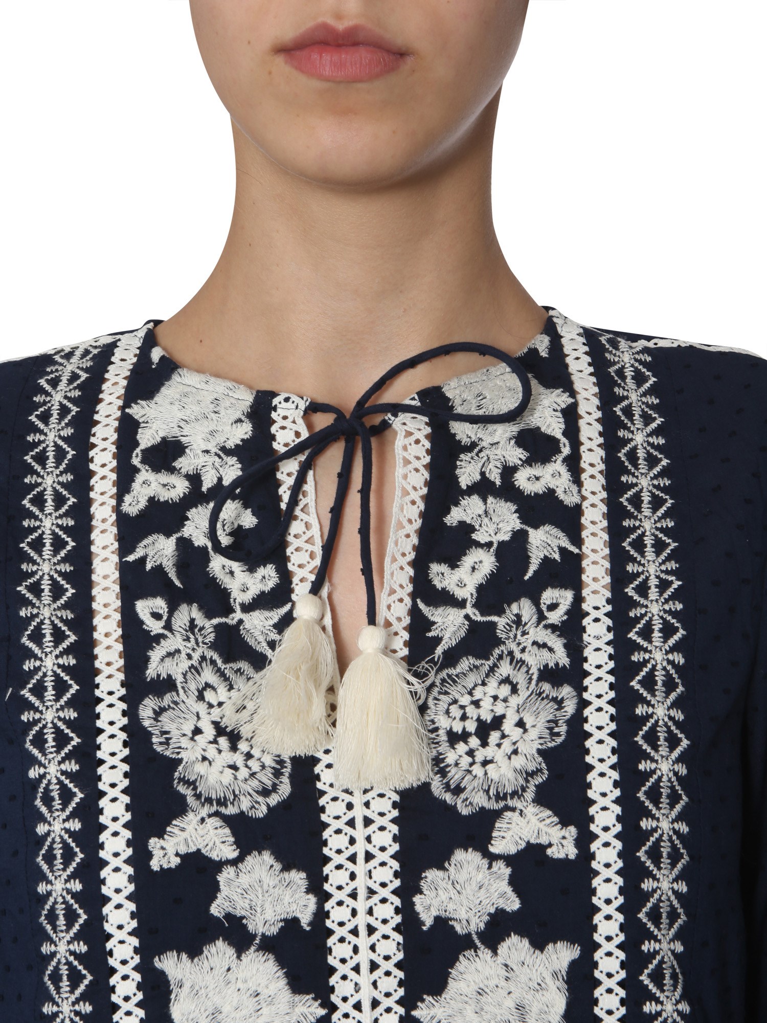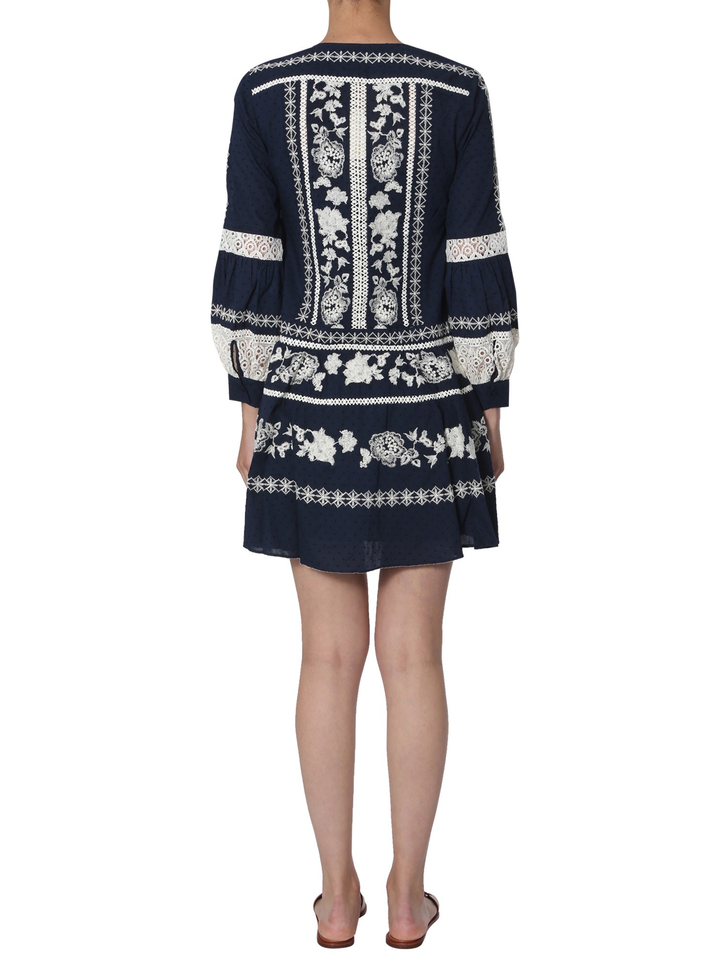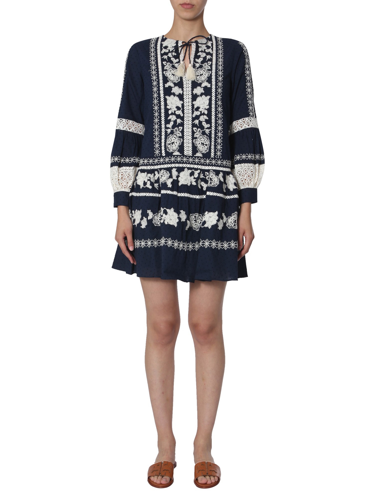Acquire a trendy summer look by wearing this boho dress brought to you by Tory Burch. The dress is fabricated from lightweight cotton that provides breathability. It features a round neck with ribbons to knot the bow with contrasting embroidery that combines to provide a classic street style fashion.