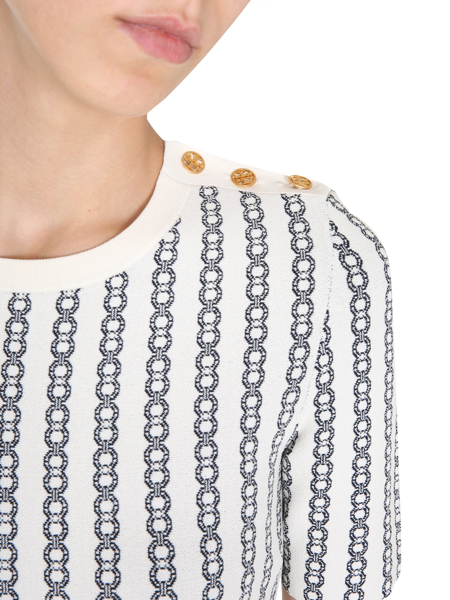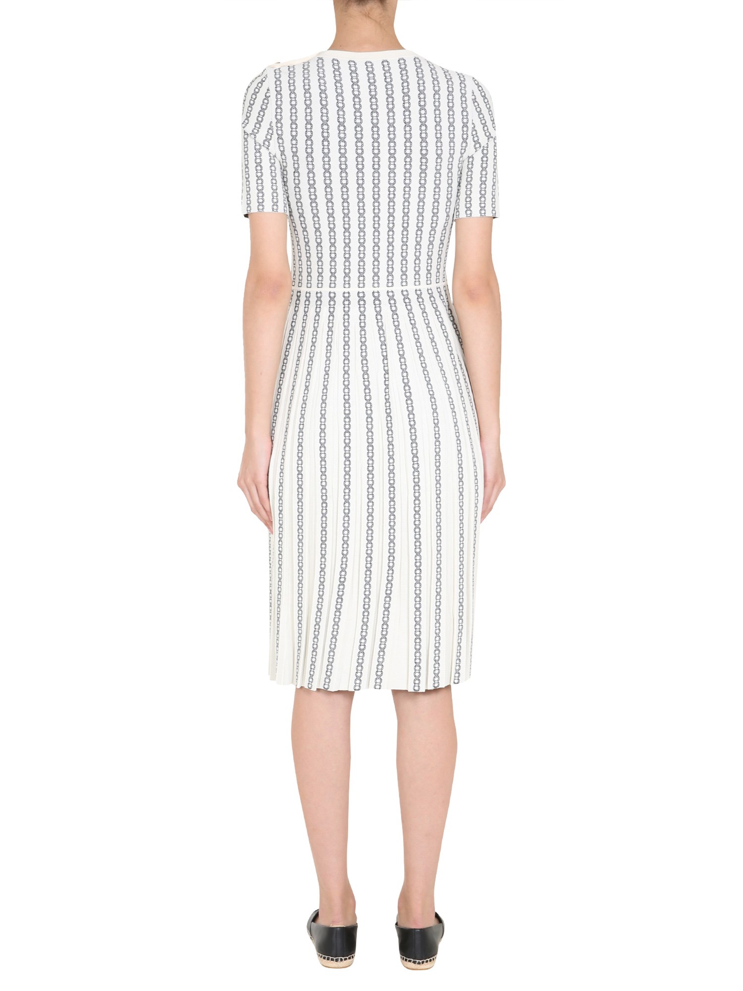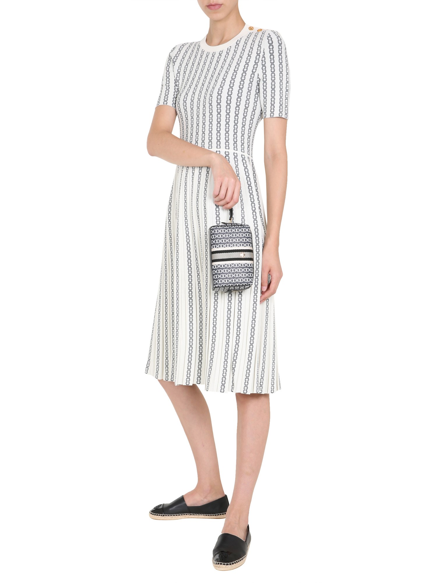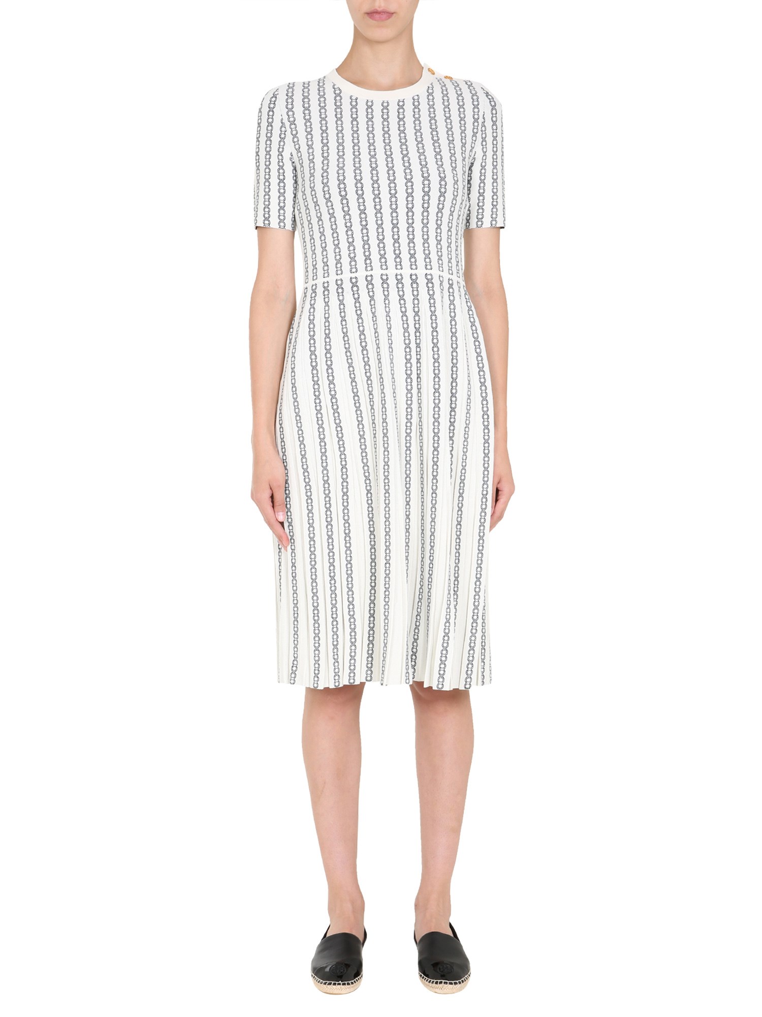 Made of a blend of viscose and polyester, thisTory Burch dressis lightweight and durable. The iconic logo buttonsalong shoulders look attractive. This round neck dress comes with a pleated bottom and has a cut on waist.Designed with an inner lining, this dress provides a secure and comfortable fit. You can pair them with high heels or casual sneakers to create a stunning ensemble.