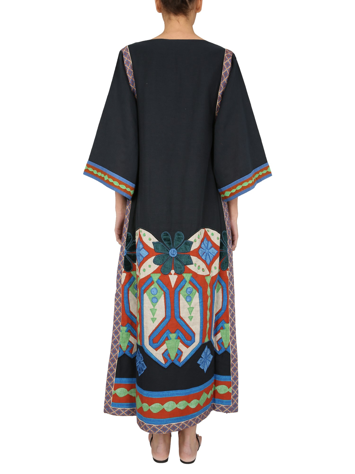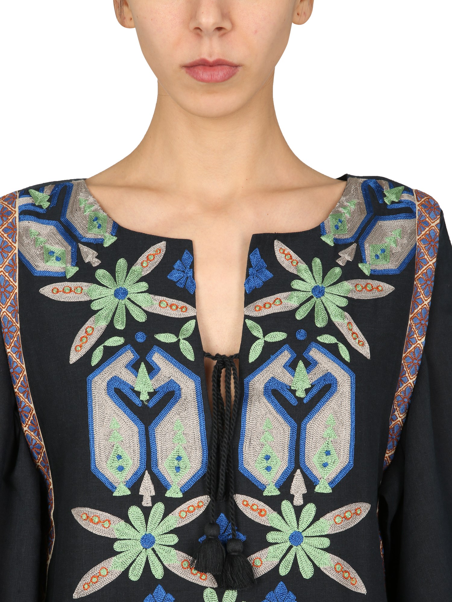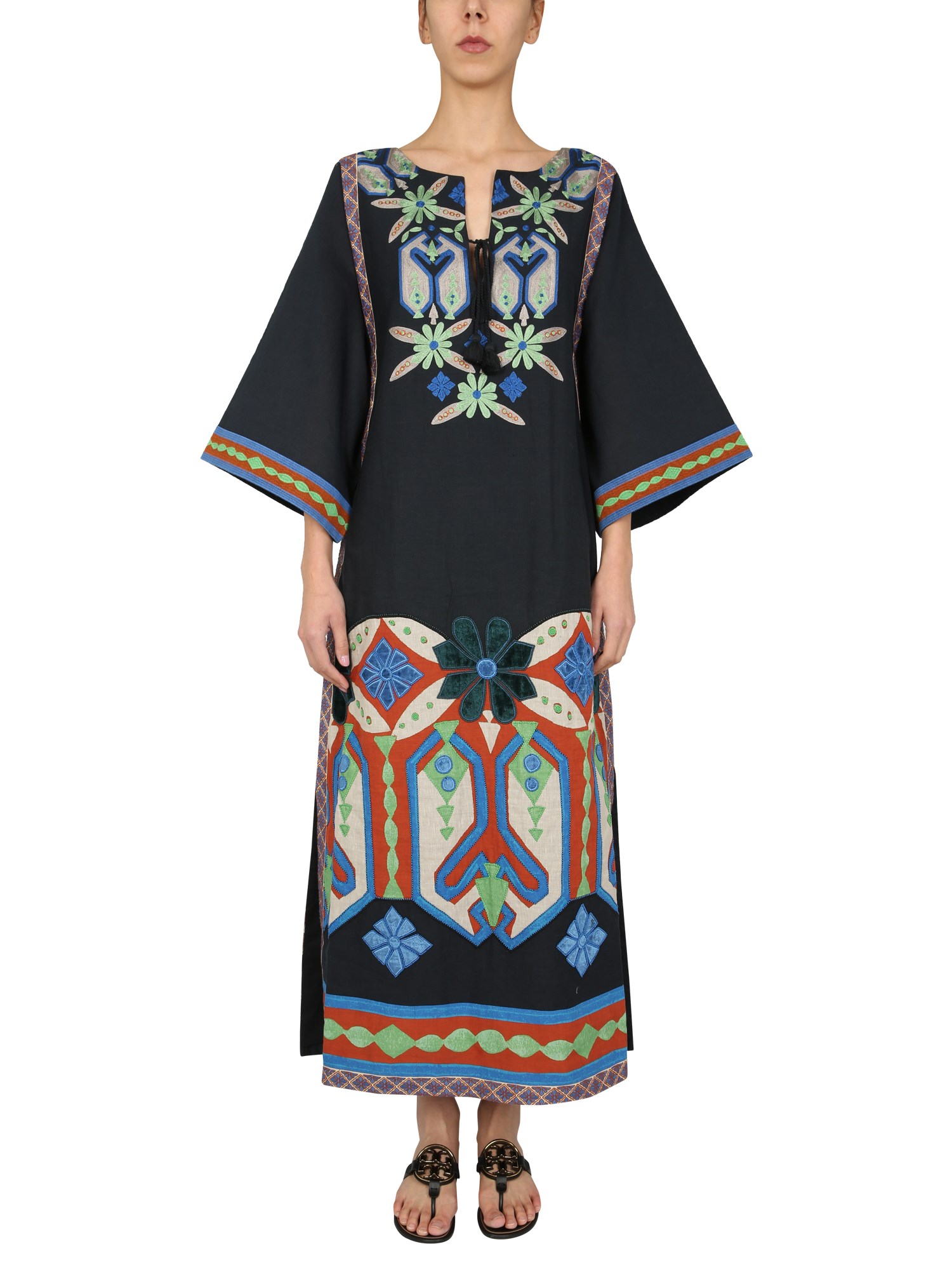 Bringing a modern twist to the traditional design, this beautiful Embroidered Caftan is brought to you by the brand Tory Burch. Its stylish V-neck with bow rope to knot with long sleeves gives you a sleek fitted look. Giving the Caftan an eye-catching look is its beautiful embroidery on the whole surface. It is made of 43% cotton and 57% linen fabric and has a lined inner.