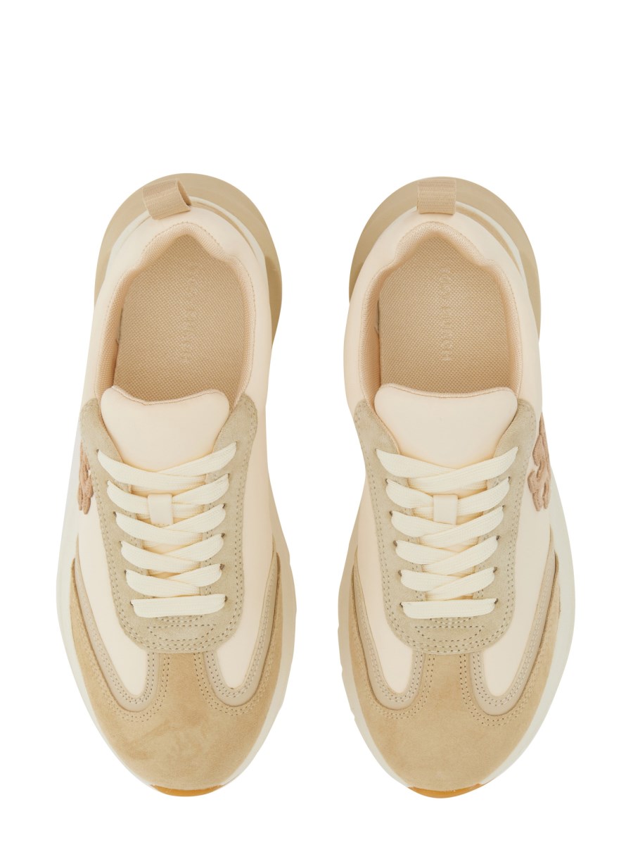 These trainers combine flattering lines and comfort: a deep groove at the ankle that elongates the leg, an oversized ergonomic sole for added lift, and the Double T logo positioned at an angle. Innovative construction balances support and softness. A structural spine within the cushioned midsole acts as a cambrion, strengthening the shoe's internal support system.
