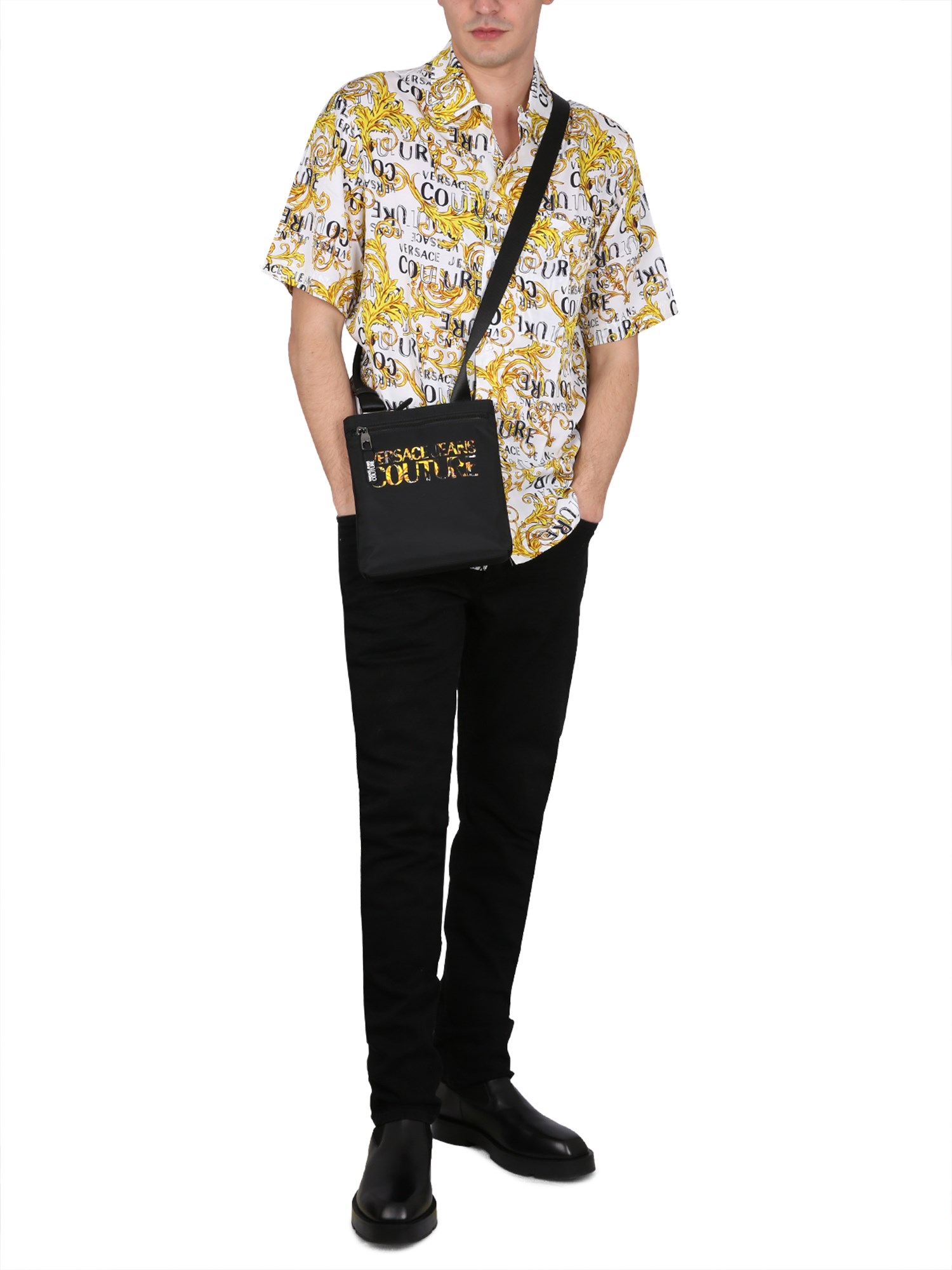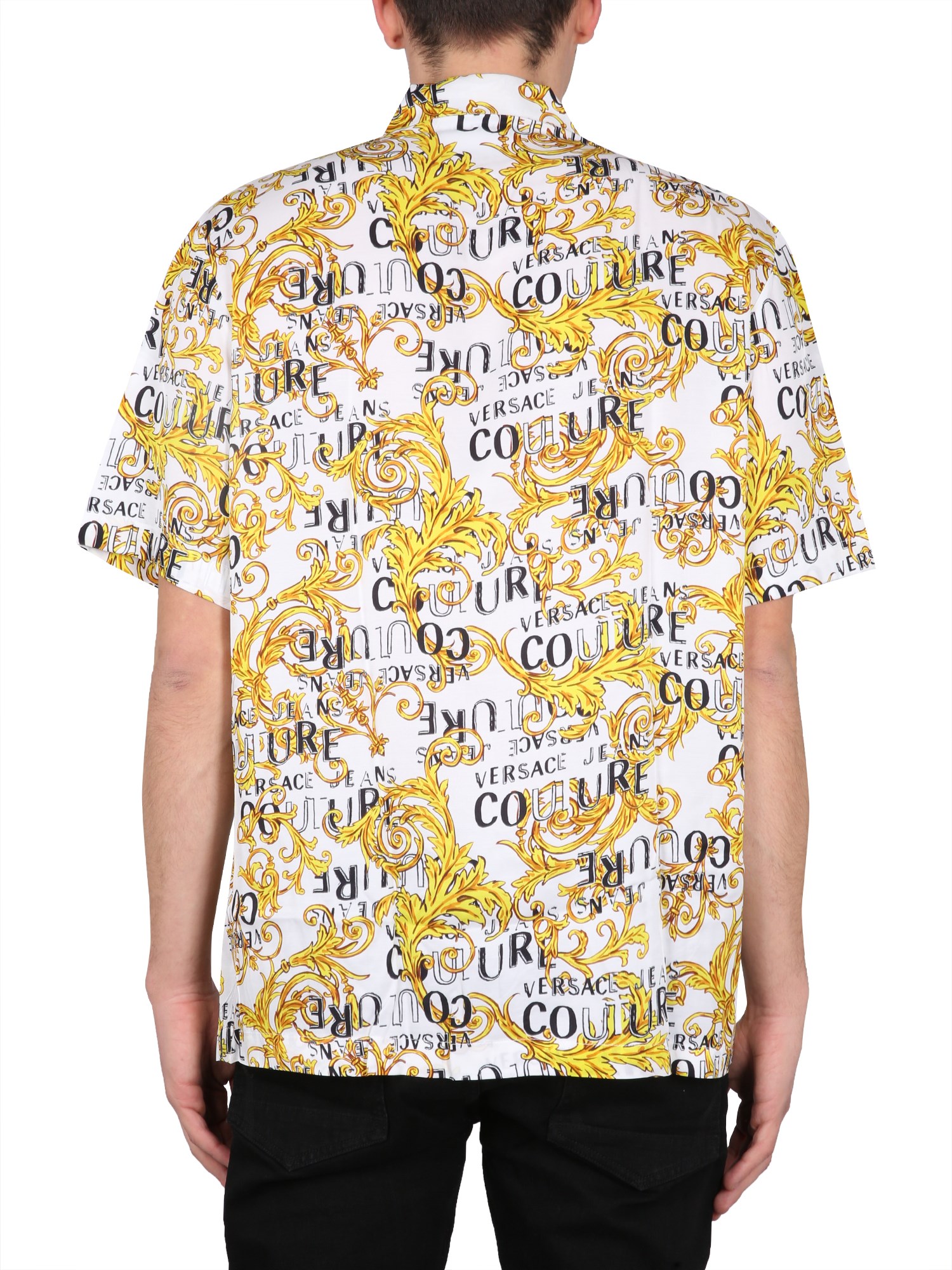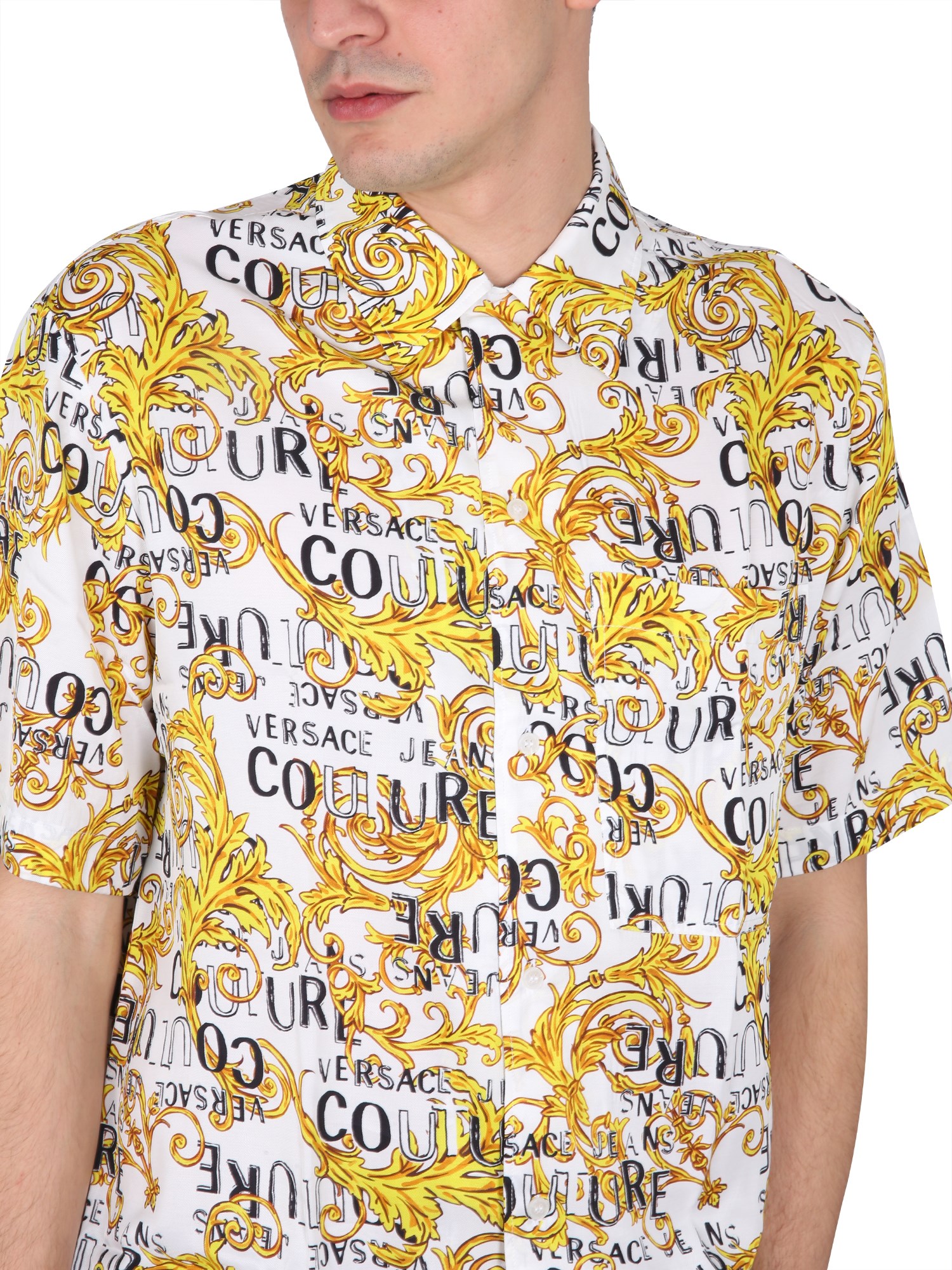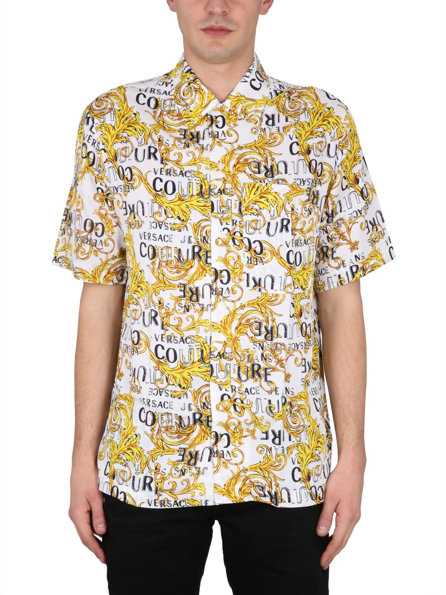 The viscose shirt from Versace Jeans Couture is a versatile piece that can be worn in a variety of settings. This men's shirt is made of viscose, a natural fibre made from cellulose. It is cool, breathable, and is soft to the touch. The fabric is wrinkle-resistant and doesn't fade. This shirt has a front button closure classic collar, all-over baroque logo print, and regular fit.