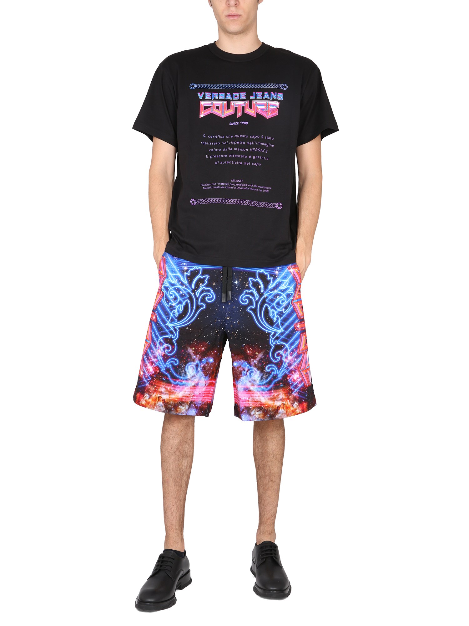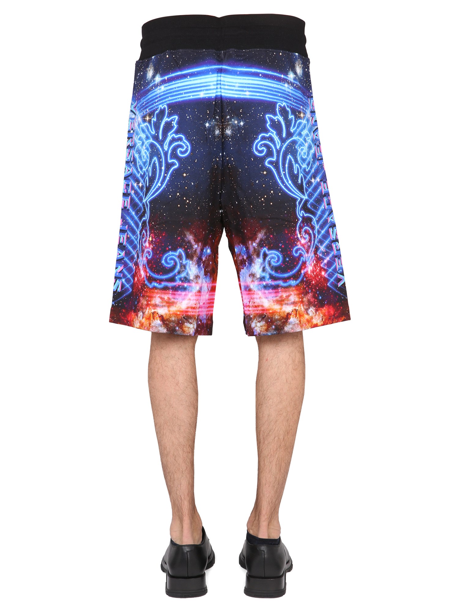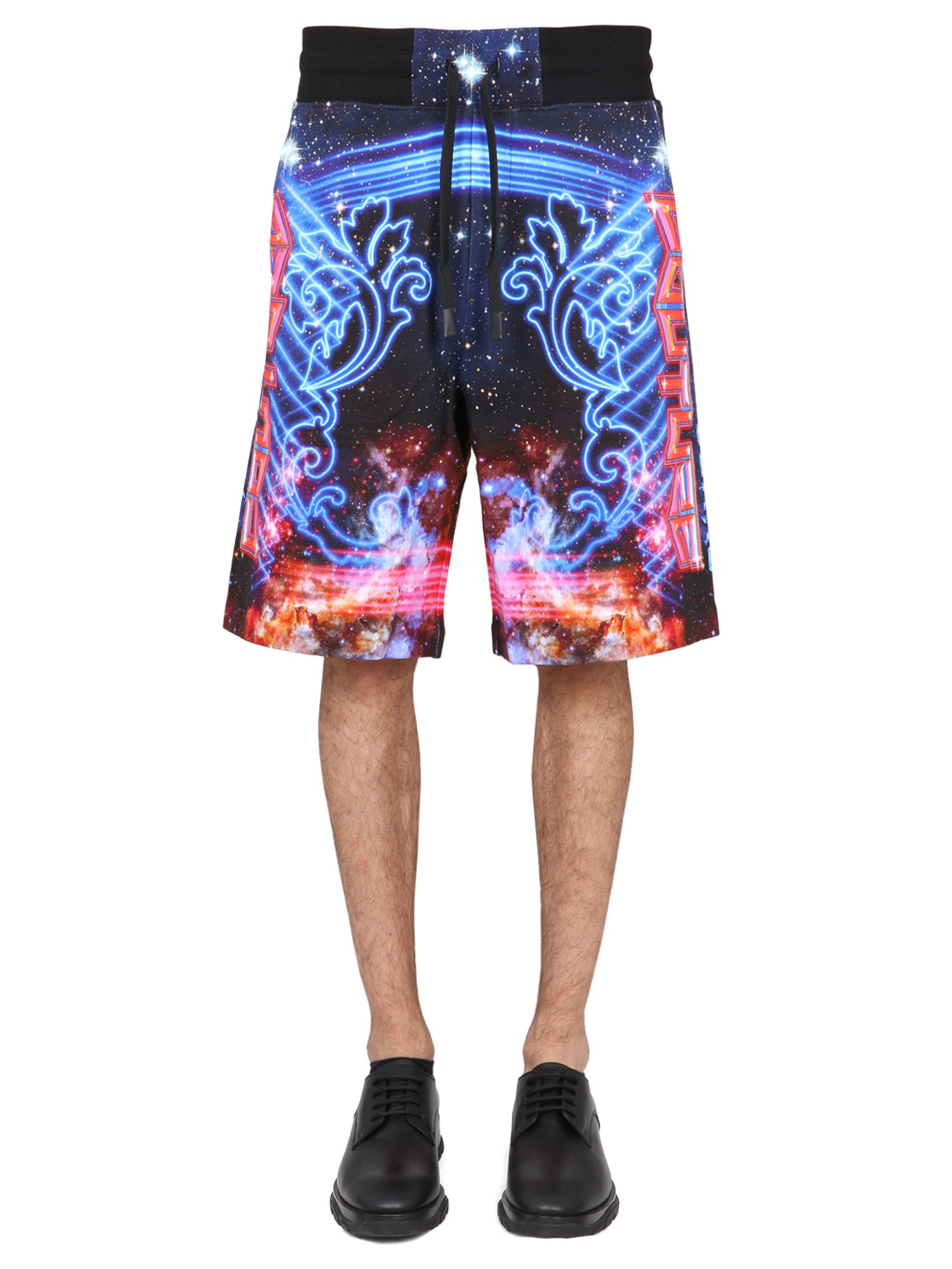 The Versace Jeans Couture galaxy print shorts are made of soft cotton and feature a comfortable elastic waistband. These shorts are perfect for the hot summer days and can be worn with any outfit. These pair of galaxy print cotton shorts are the perfect piece to throw on with a tee and sandals when you're headed out for a casual day with friends.