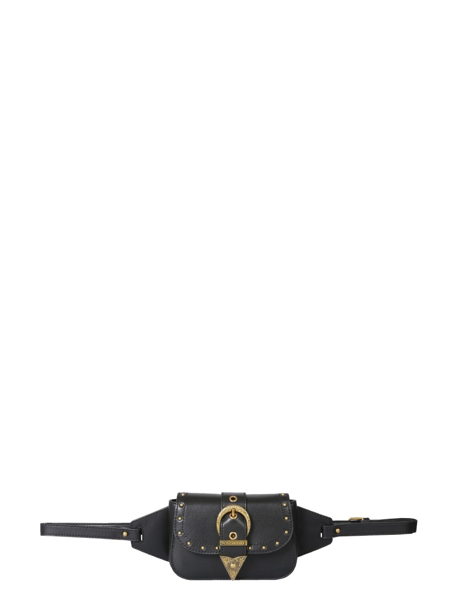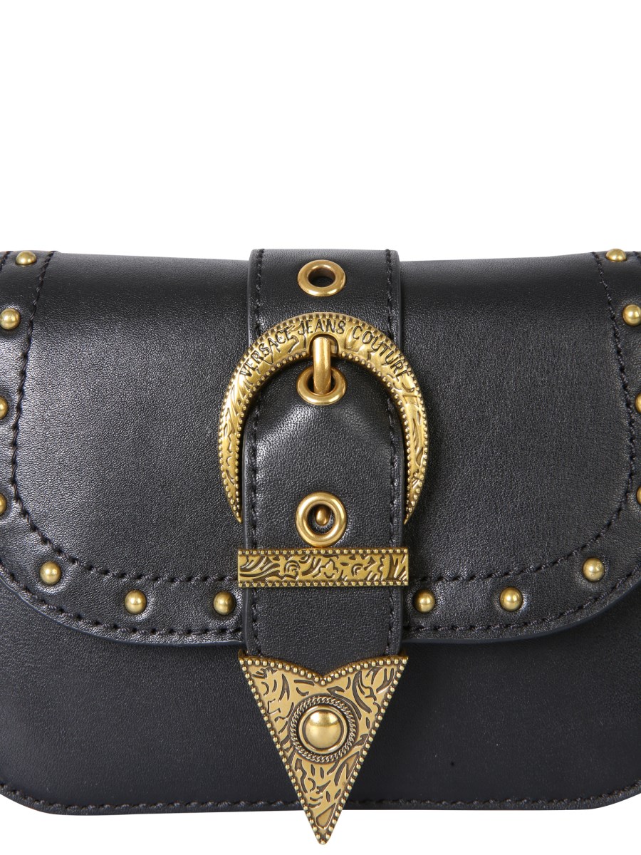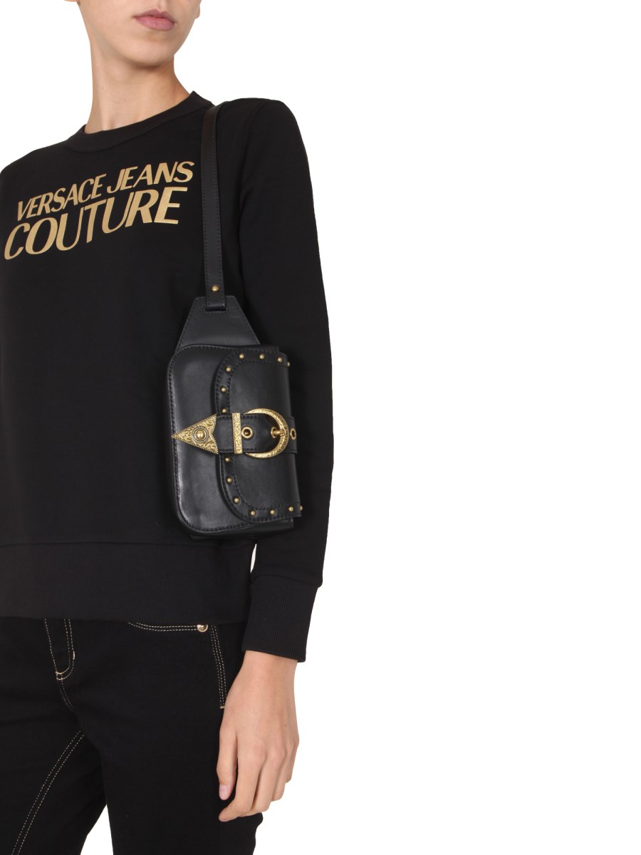 Make a bold impression on everyone you come across as you carry all your essentials in this sleek and stylish Western Style Belt Bag brought to you by the brand label of Versace Jeans Couture. This leather bag has an adjustable shoulder strap with a magnetic flap closure. It has a lining on the inside and a zip pocket with the iconic logo buckle on the outside with galvanized gold finish studs on the front.