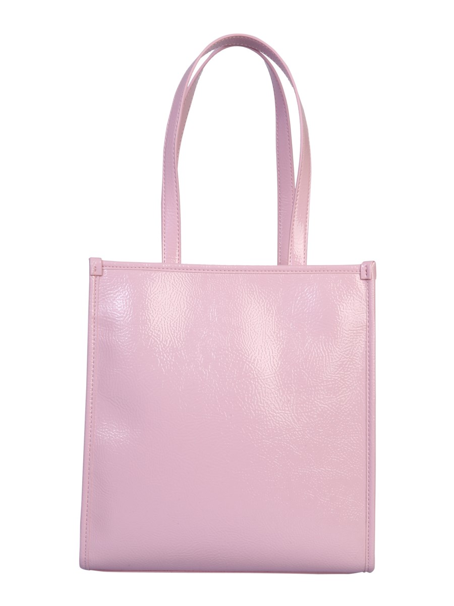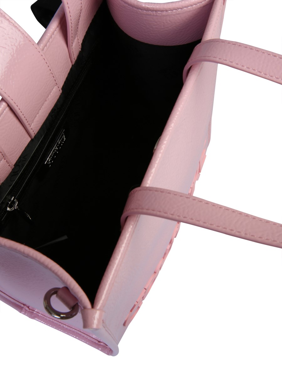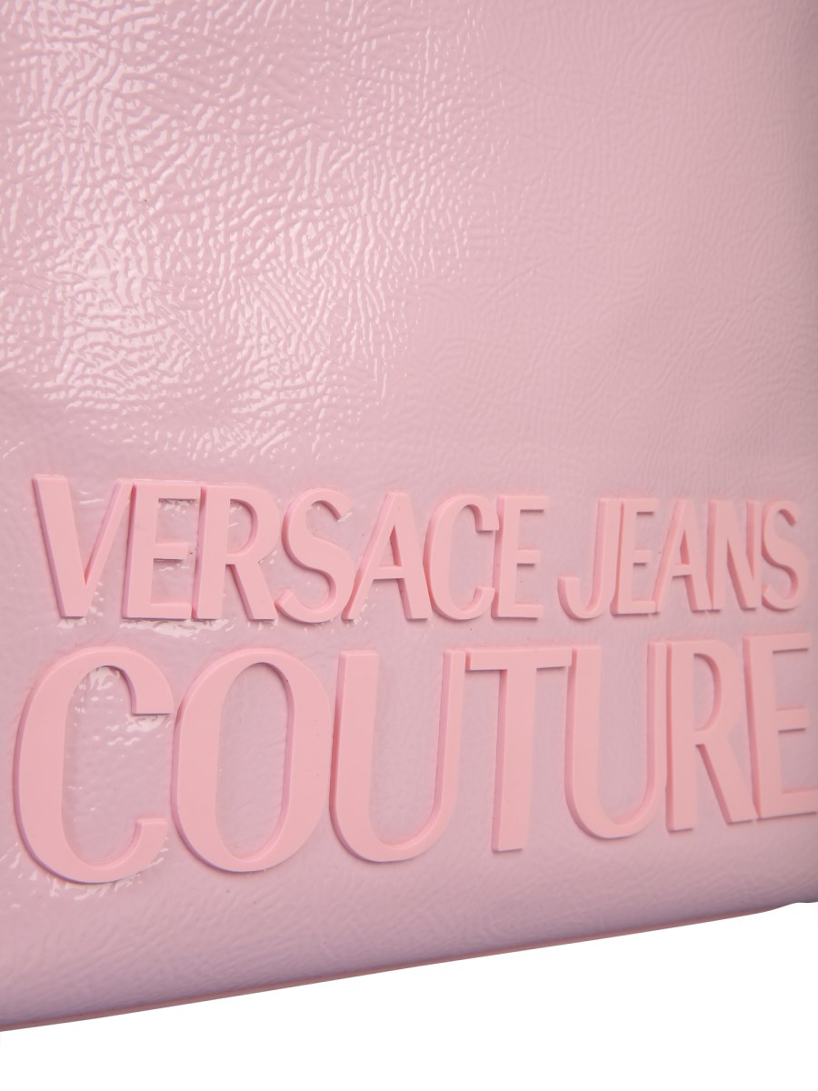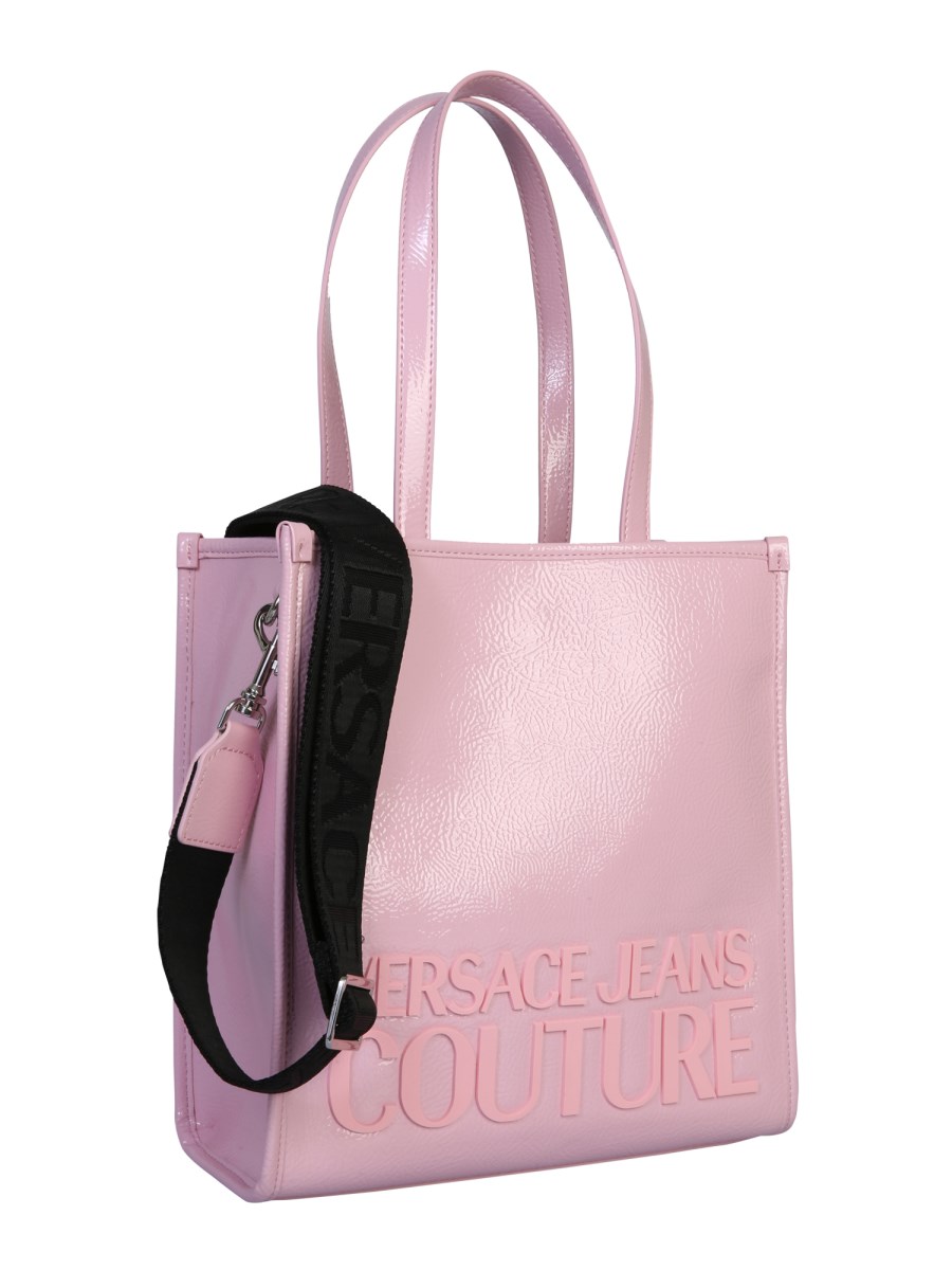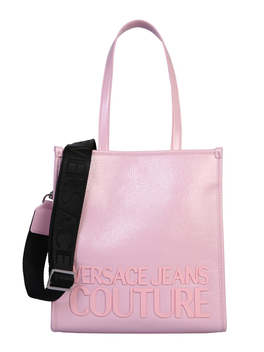 Tote your essentials with style by stuffing them in this small PVC tote bag designed by Versace Jeans Couture. It has a smooth leather surface that shines in a beautiful shade while the sturdy leather handles let you hold the bag firmly. This bag also has an adjustable and removable shoulder strap with an apparent logo branding.