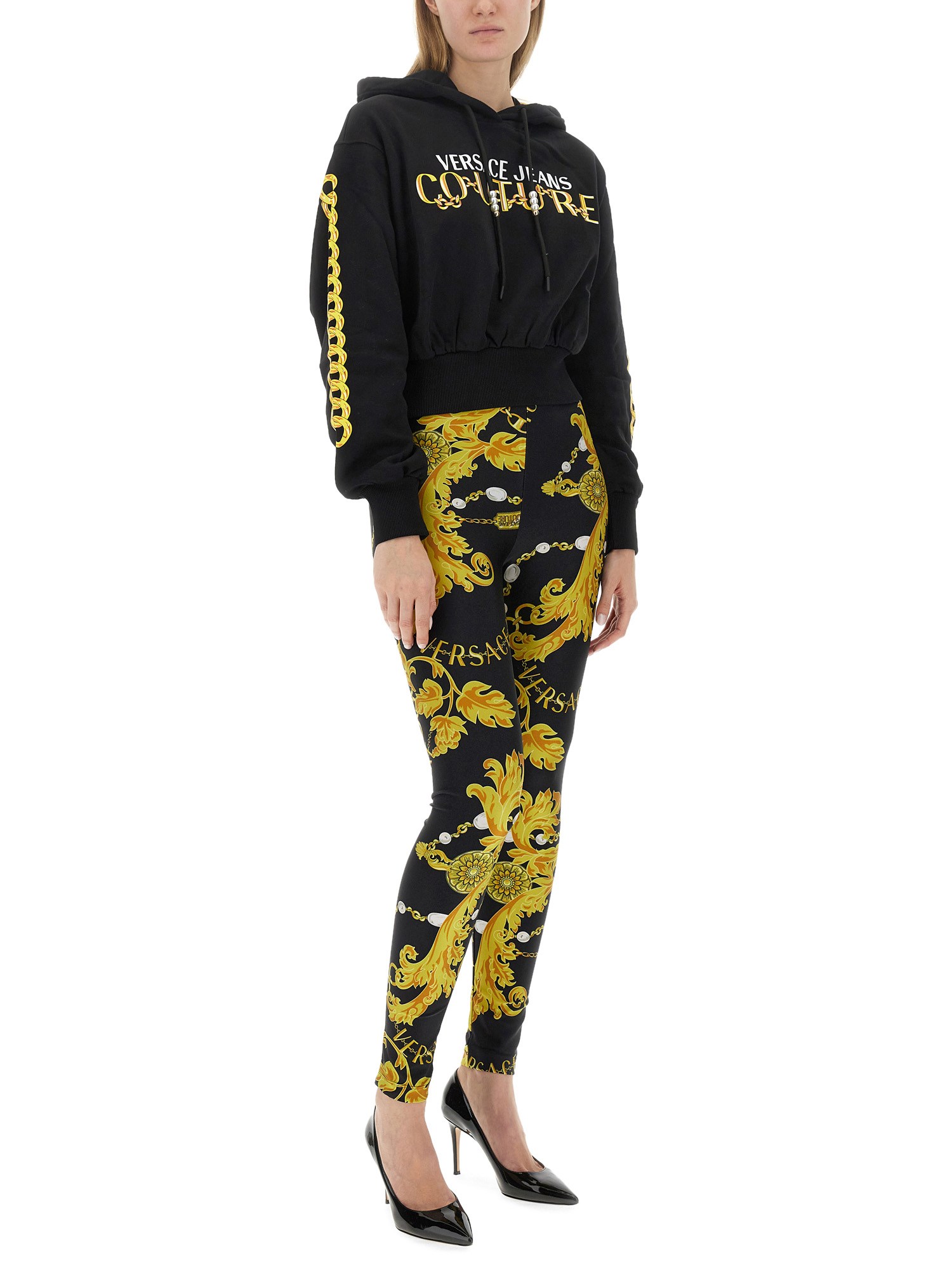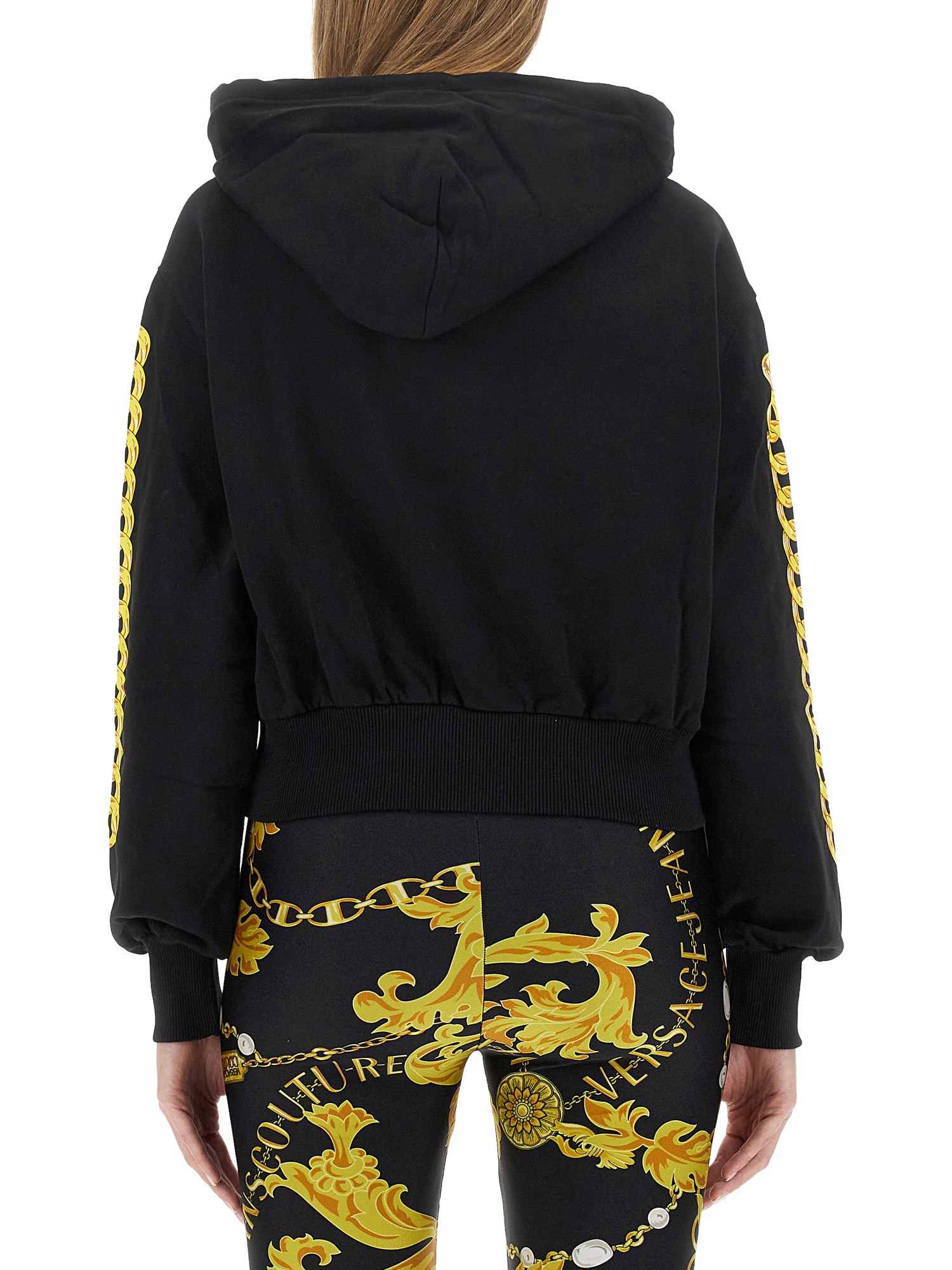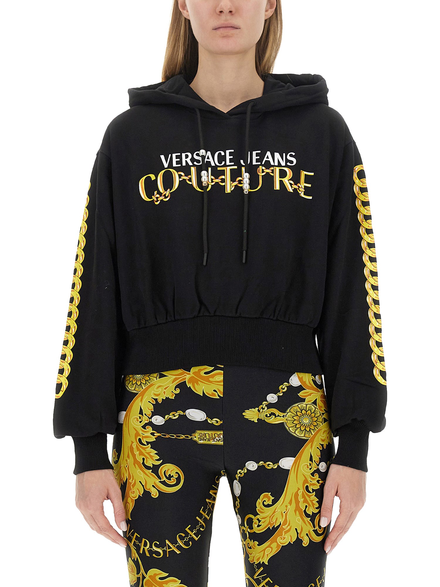 This sweatshirt from Versace Jeans Couture is designed to offer optimum warmth and cosiness on chilly days. The hooded feature adds an extra touch of versatility, allowing you to protect yourself against unpredictable weather conditions. The front logo print is a standout feature of this sweatshirt, adding a trendy and fashionable element to your wardrobe. The logo design is eye-catching and instantly elevates your overall look.