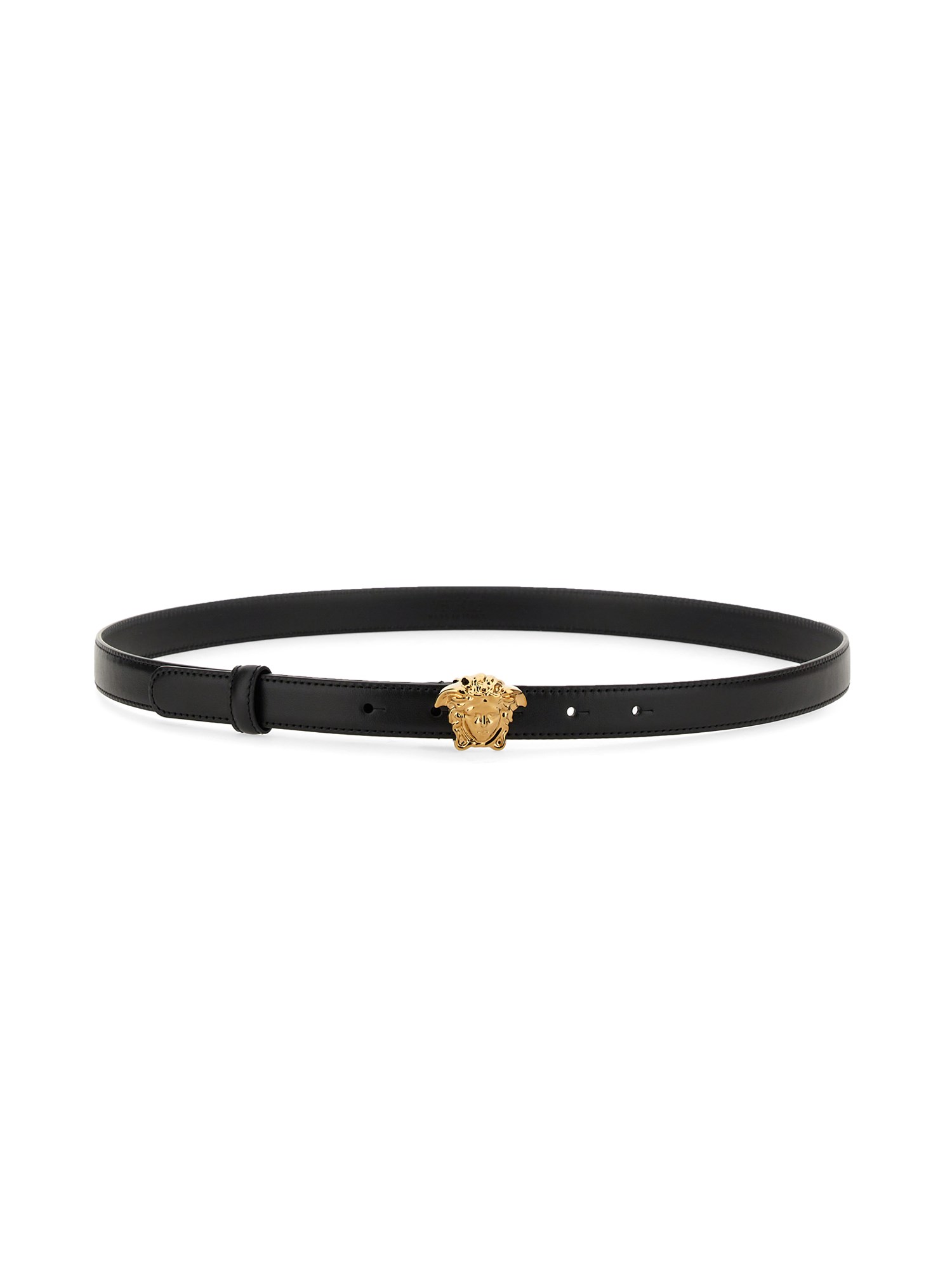 Questa attraente cintura di Versace è realizzata in pregiata pelle di vitello e presenta una splendida finitura dorata. Presenta una placca a forma di medusa, con disegno di serpente, e una chiusura a fungo con fibbia. La placca della medusa è un disegno che veniva utilizzato sulle ceramiche greche e rappresenta la gorgone Medusa.