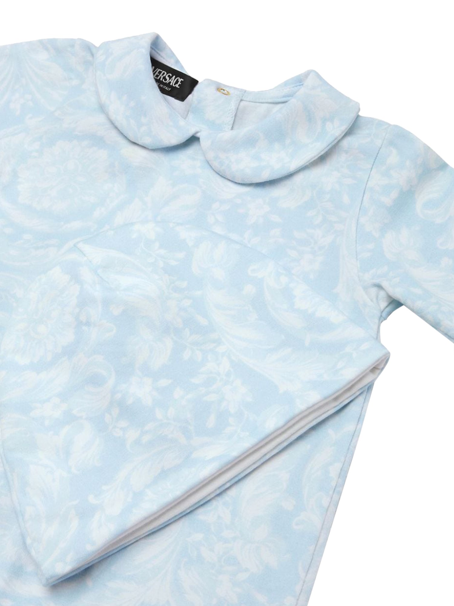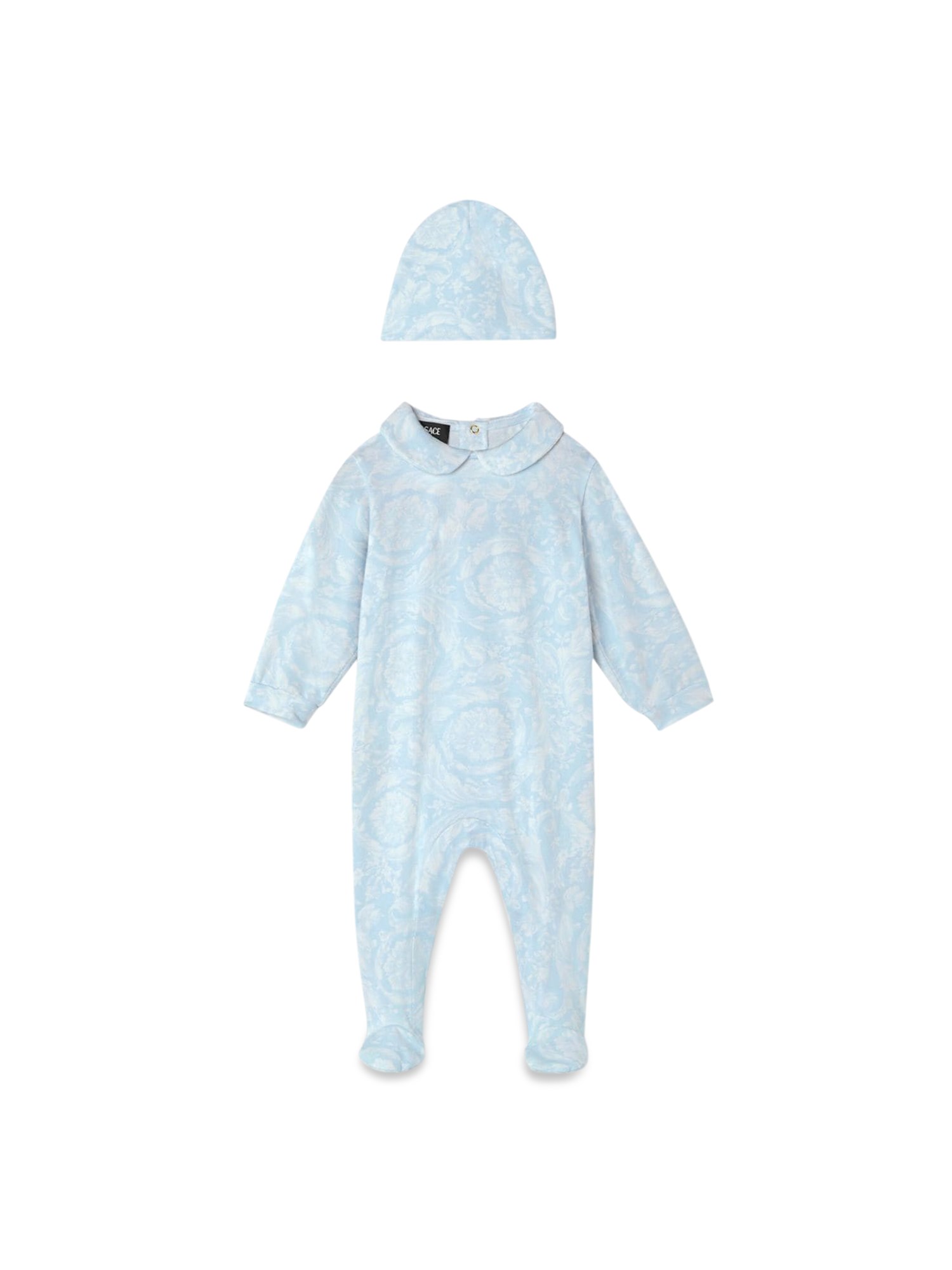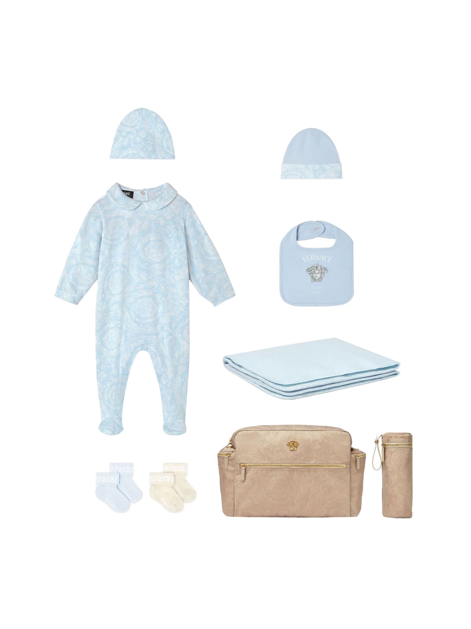 This exquisite gift set features two pieces of baroque newborn jersey from Versace, designed to envelop your little one in luxury and comfort. Crafted with the finest materials, the set showcases the iconic Versace baroque pattern, adding a touch of elegance to any newborn's wardrobe. Ideal for gifting, this set combines style and practicality, ensuring your baby looks chic while enjoying the softness of premium jersey fabric. Perfect for special occasions or as a delightful addition to everyday wear, this Versace gift set is a must-have for discerning parents.