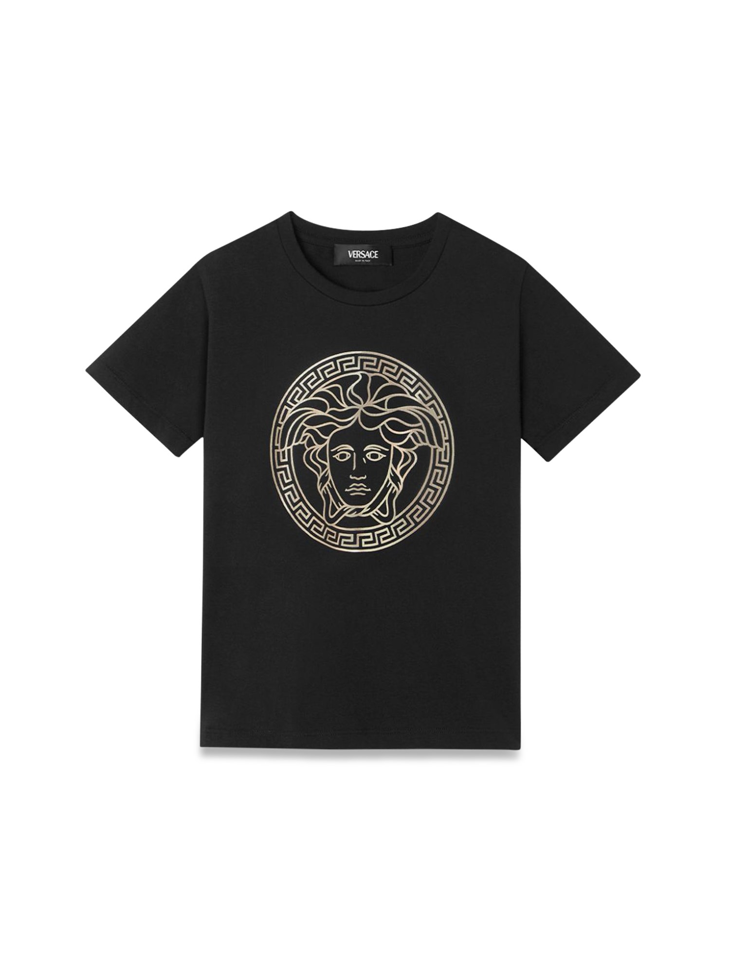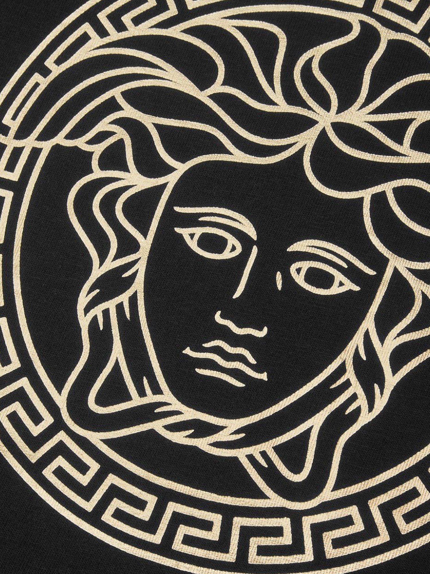 This Versace jersey T-shirt features a striking Laminate Medusa Greca print, embodying the brand's signature opulence and bold aesthetic. Crafted from high-quality materials, it offers both comfort and style, making it a versatile addition to any wardrobe. The iconic Medusa motif, combined with the intricate Greca pattern, showcases a perfect blend of contemporary design and classic luxury, ideal for making a statement in any casual or semi-formal setting.