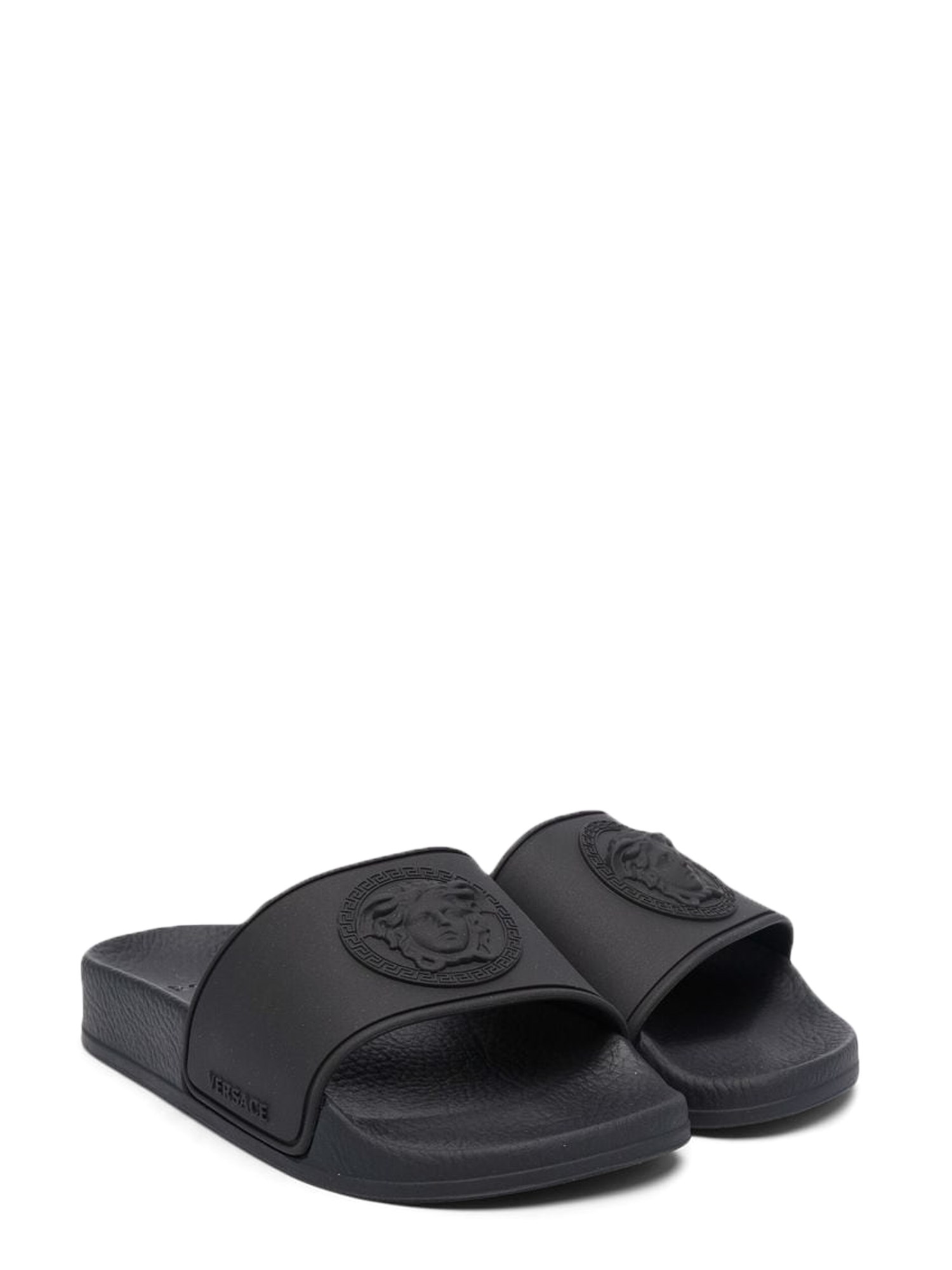These black rubber shoes from Versace are the perfect accessory for those who like a smart and casual look. They are made of smooth rubber material and come in different colors. They make a great sand shoe and are perfect for wearing on your feet to play in the sand.