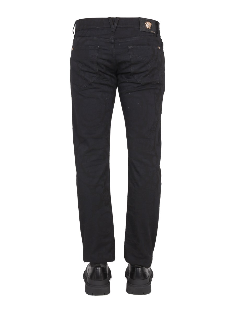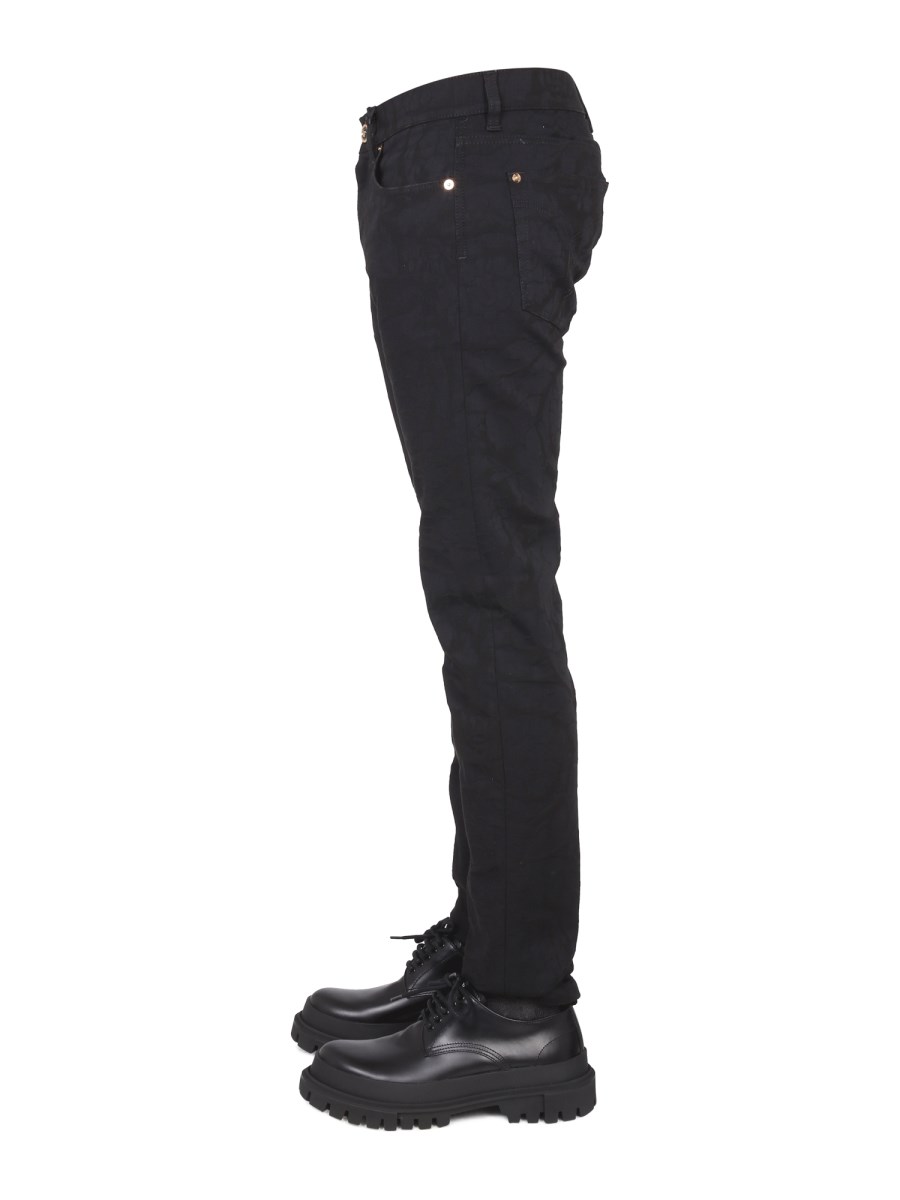 Flaunt your curves by wearing slim-fit jeans from the house of Versace. The jeans are super stretchy, they hug your body and they are comfortable to wear. The jeans feature belt loops and a Medusa button and zipper closure. It has an all-over pattern Baroque jacquard pattern and leather applique with metal medusa elements.