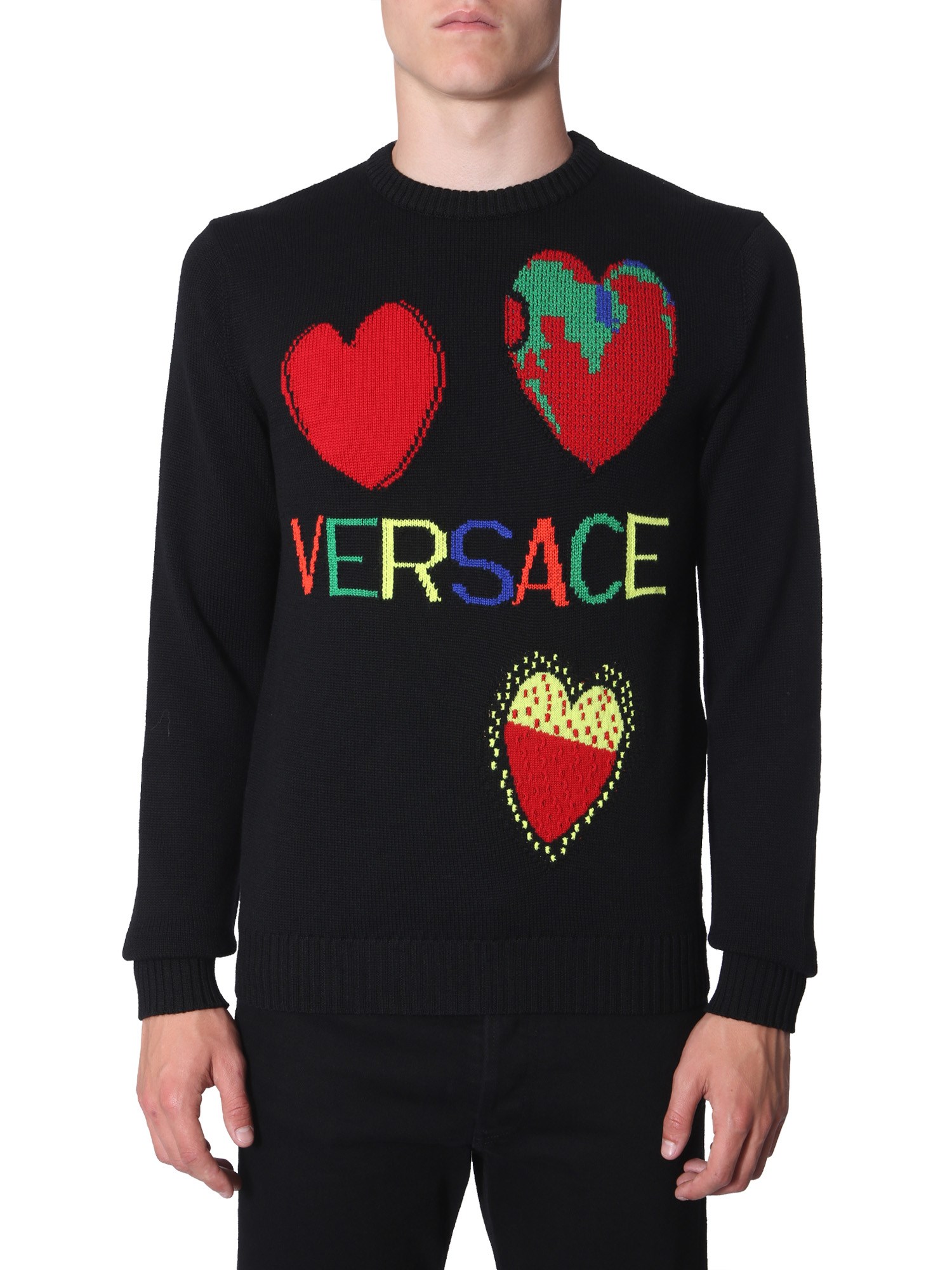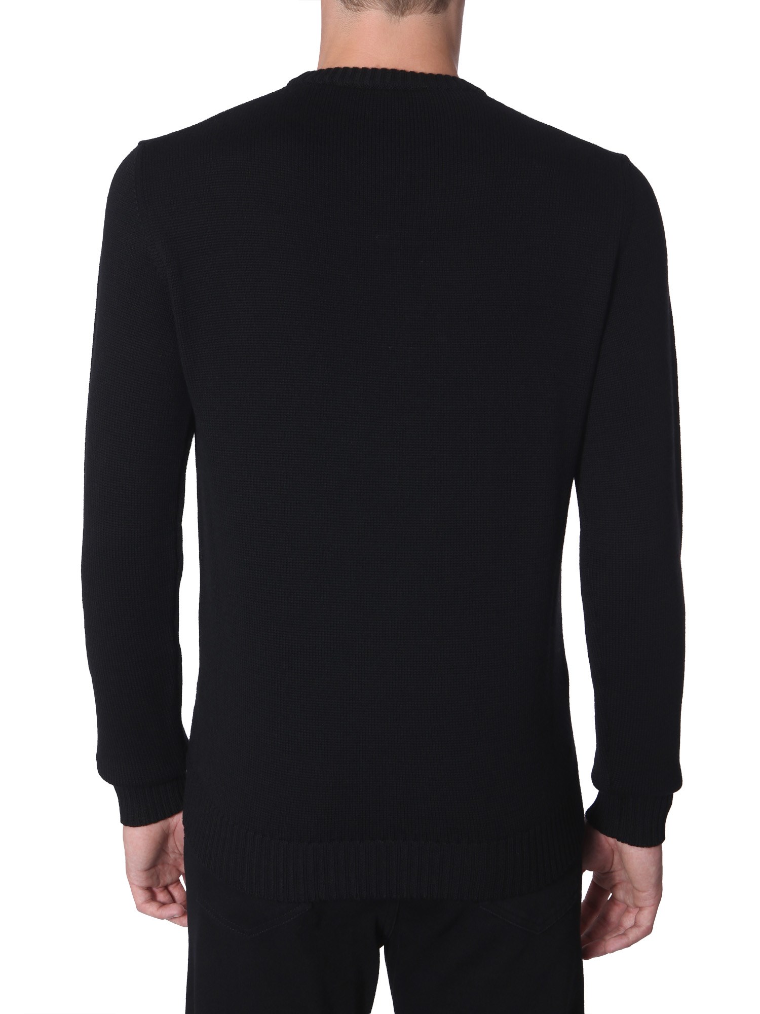 Upgrade the winter wear section of your closet with this crew neck knit from the house of Versace. The sweater is knitted from fine quality cotton that lends it a smooth and soft texture. The sweater is comfortable and hugs well around your body. It comes with a quirky and vibrant detailing on the front to complete its design.
