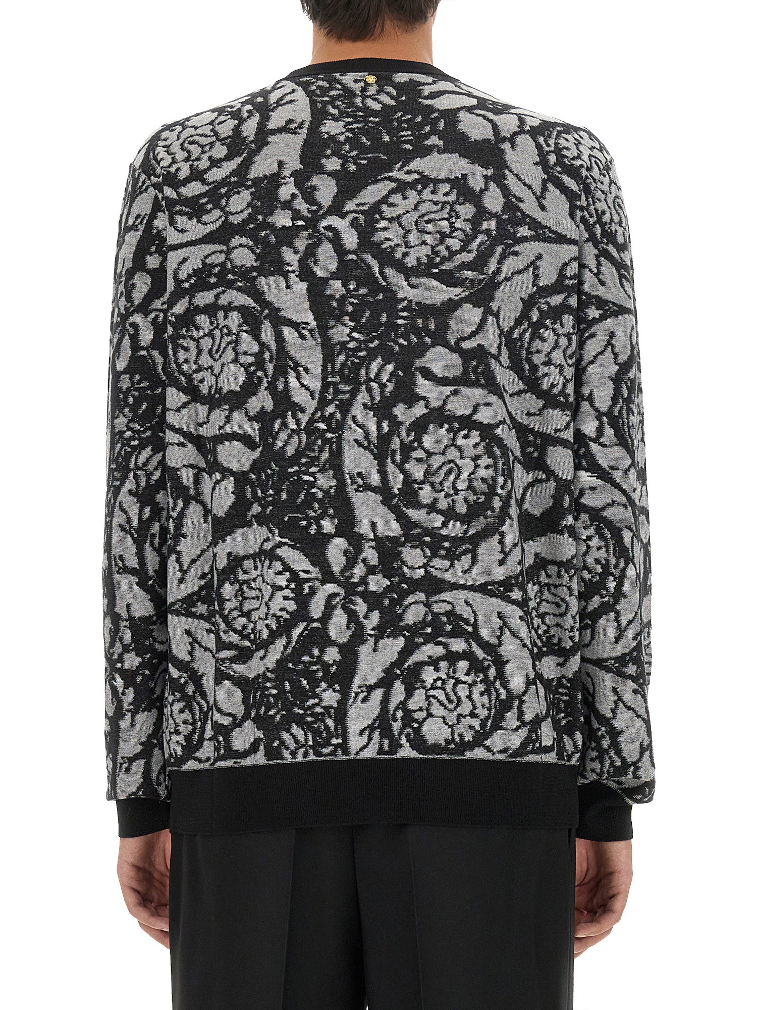 Upgrade your wardrobe with the VANISÉ Baroque Silhouette Sweater by Versace. Designed with your comfort in mind, this sweater boasts a cosy crew neckline and long sleeves to keep you warm during chilly days. The eye-catching baroque pattern adds a touch of opulence, making it a statement piece for your collection. Its straight hemline lends a sleek and polished look, effortlessly elevating your style.