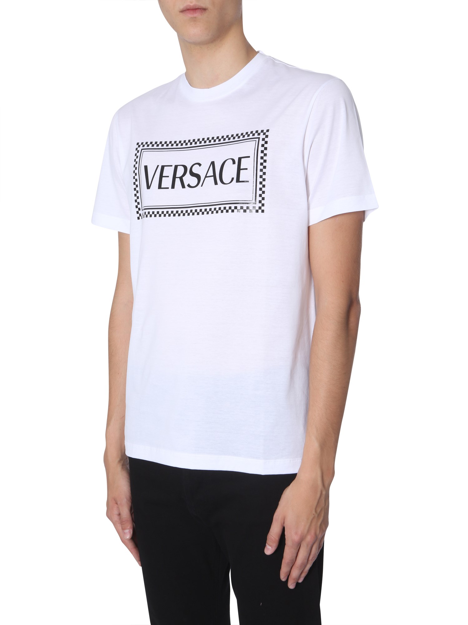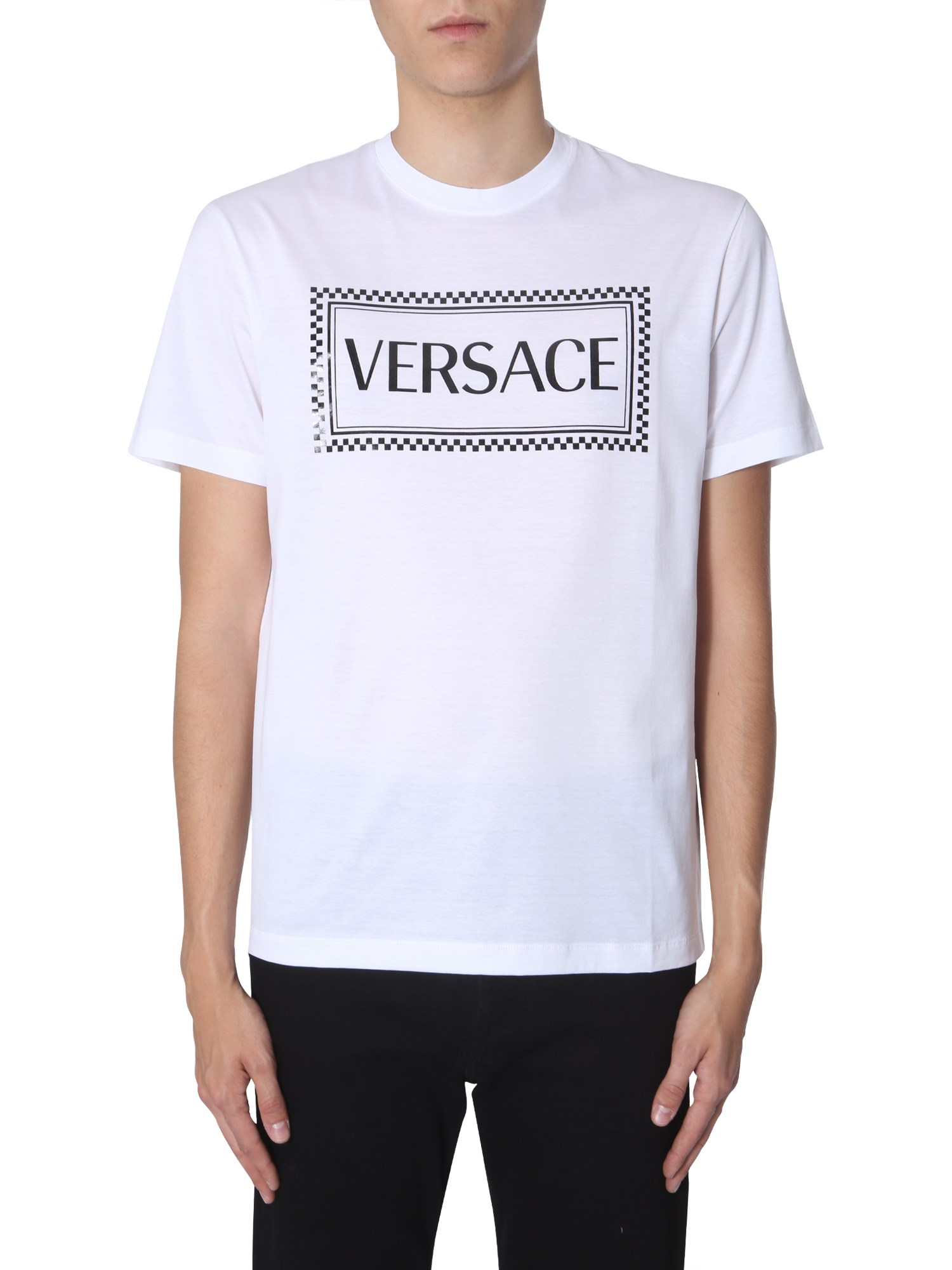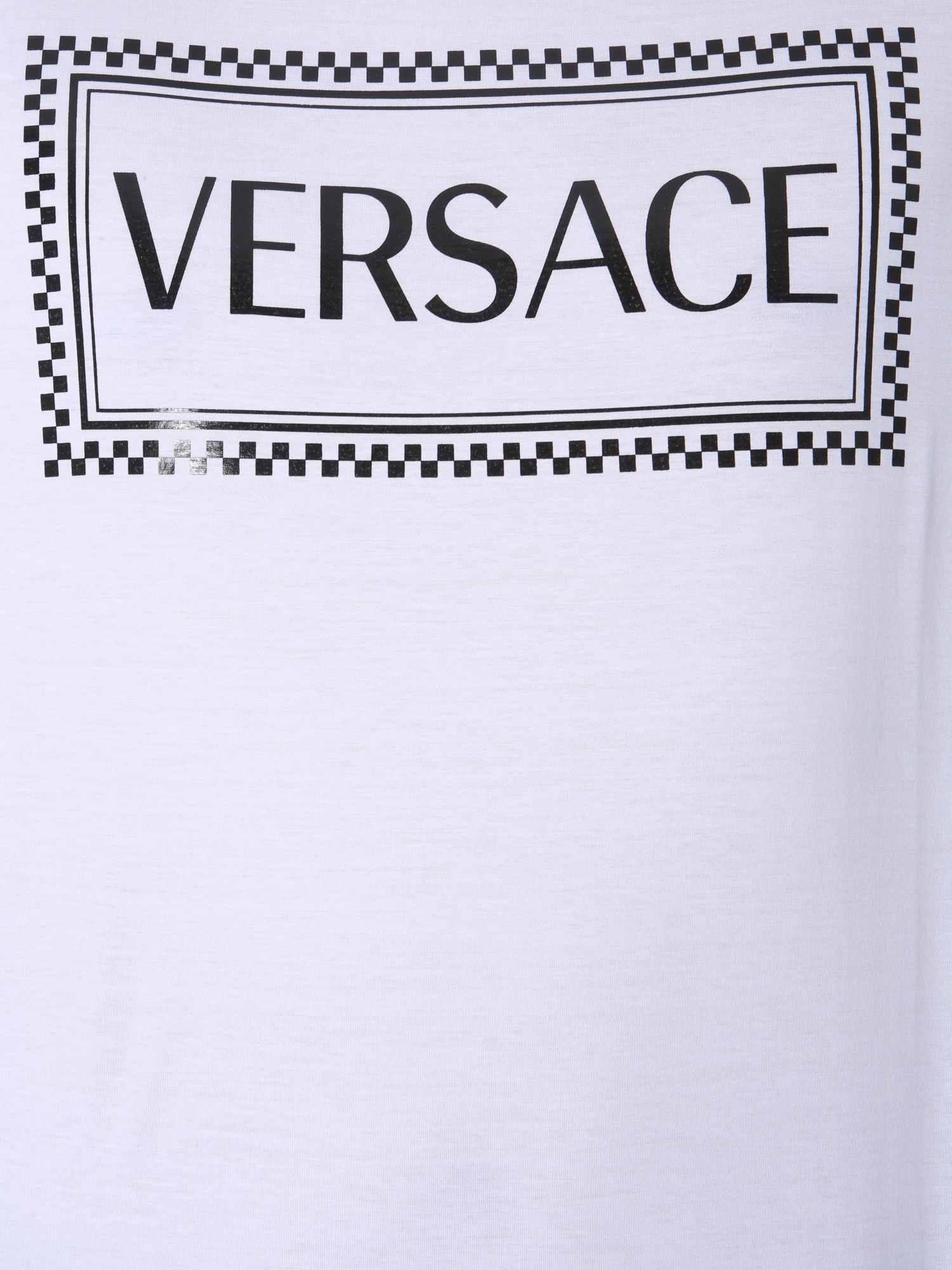 Upgrade your summer wardrobe with this T-shirt with 90s logo print brought to you to by Versace. The garment is fabricated from breathable cotton that makes it perfect for the summer season. Designed in Italy, this T-shirt features a round neck with short sleeves that altogether provides a classic look. you can combine this T-shirt with a pair of denim jeans and T-shirt for a complete look.