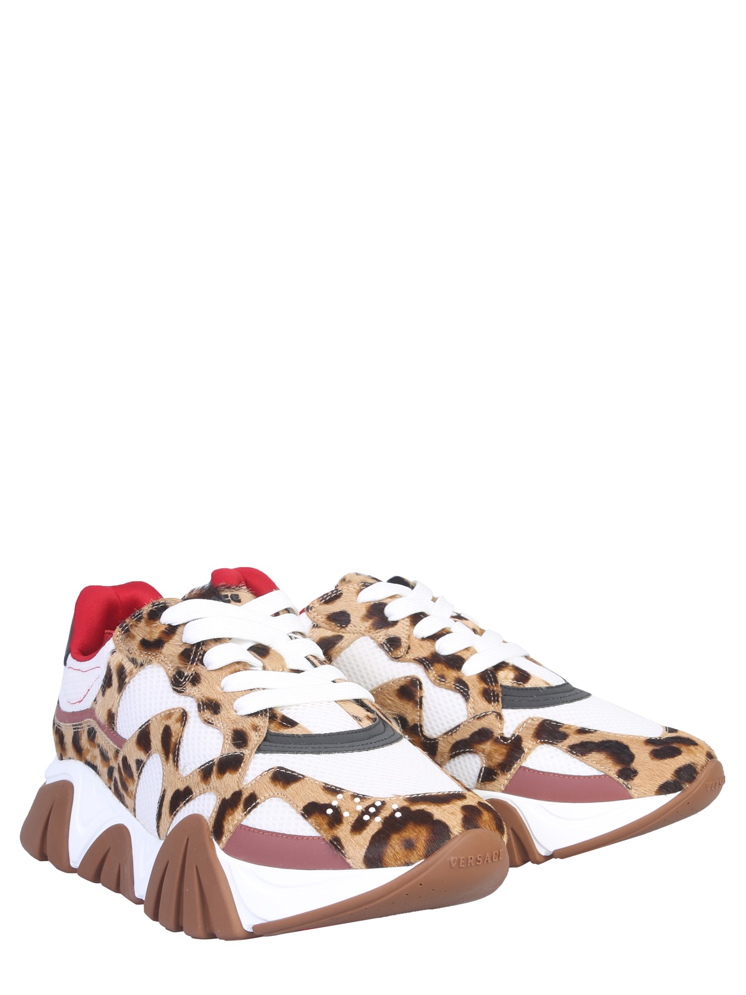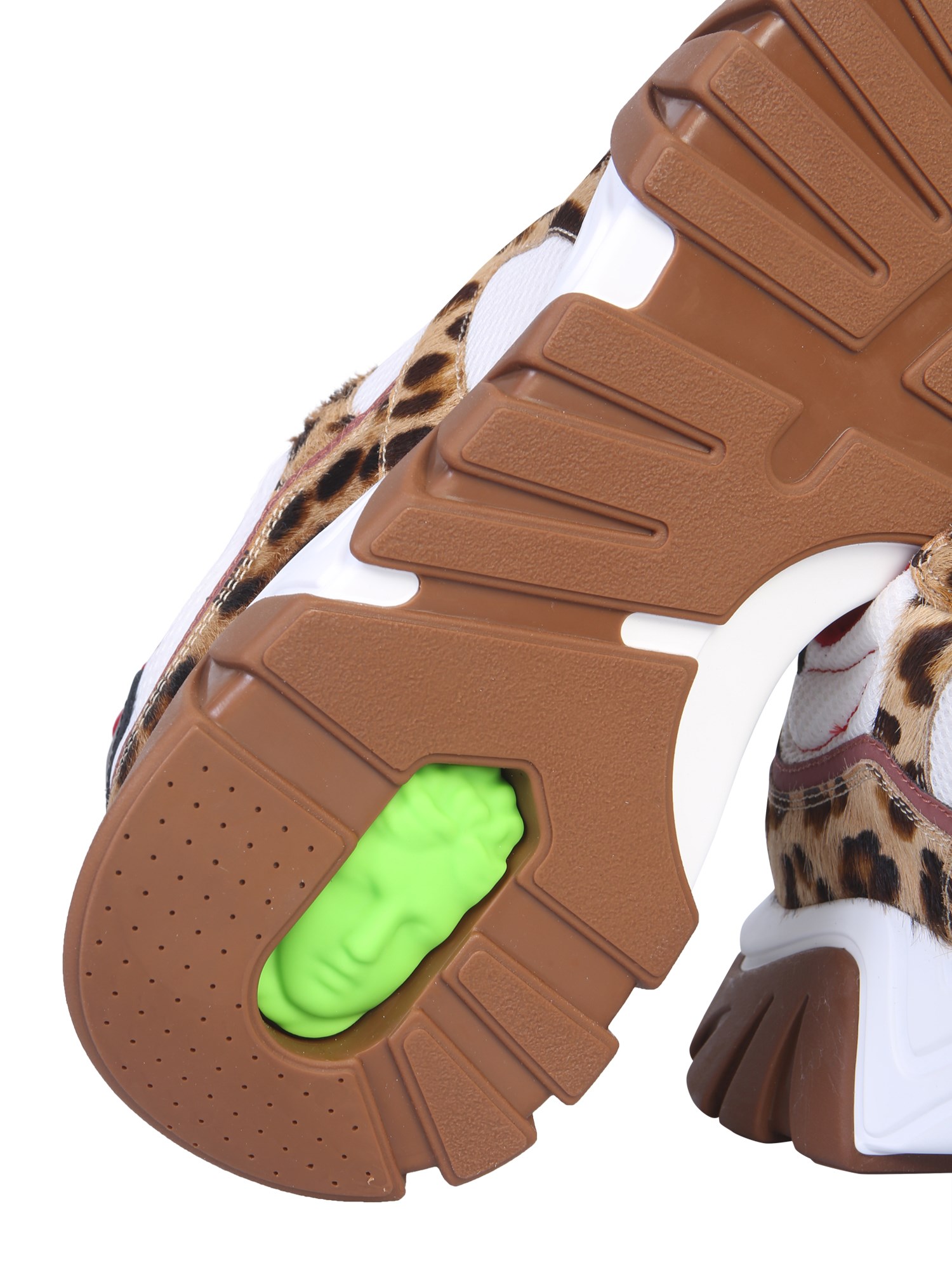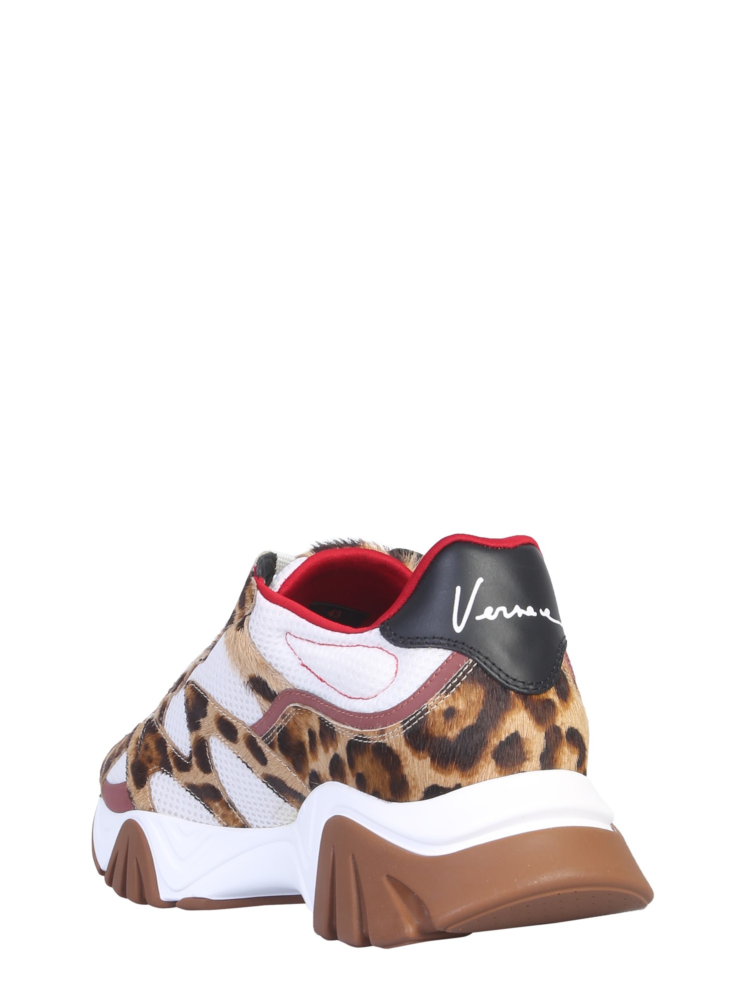 Get drenched in amazing colours with the Shark Leopard Pony sneakers by Versace. Their leather finish and polyester with elastane finish are designed for maximum comfort, breathability, and stretchability. These sneakers have flat laces for a customized fit. The 6cm rubber sole is inspired by anatomy of shark, making the foot wear one-of-a-kind.
