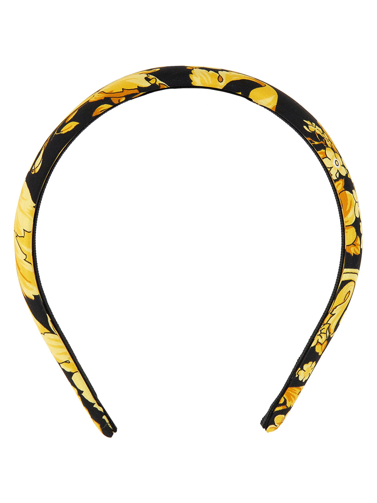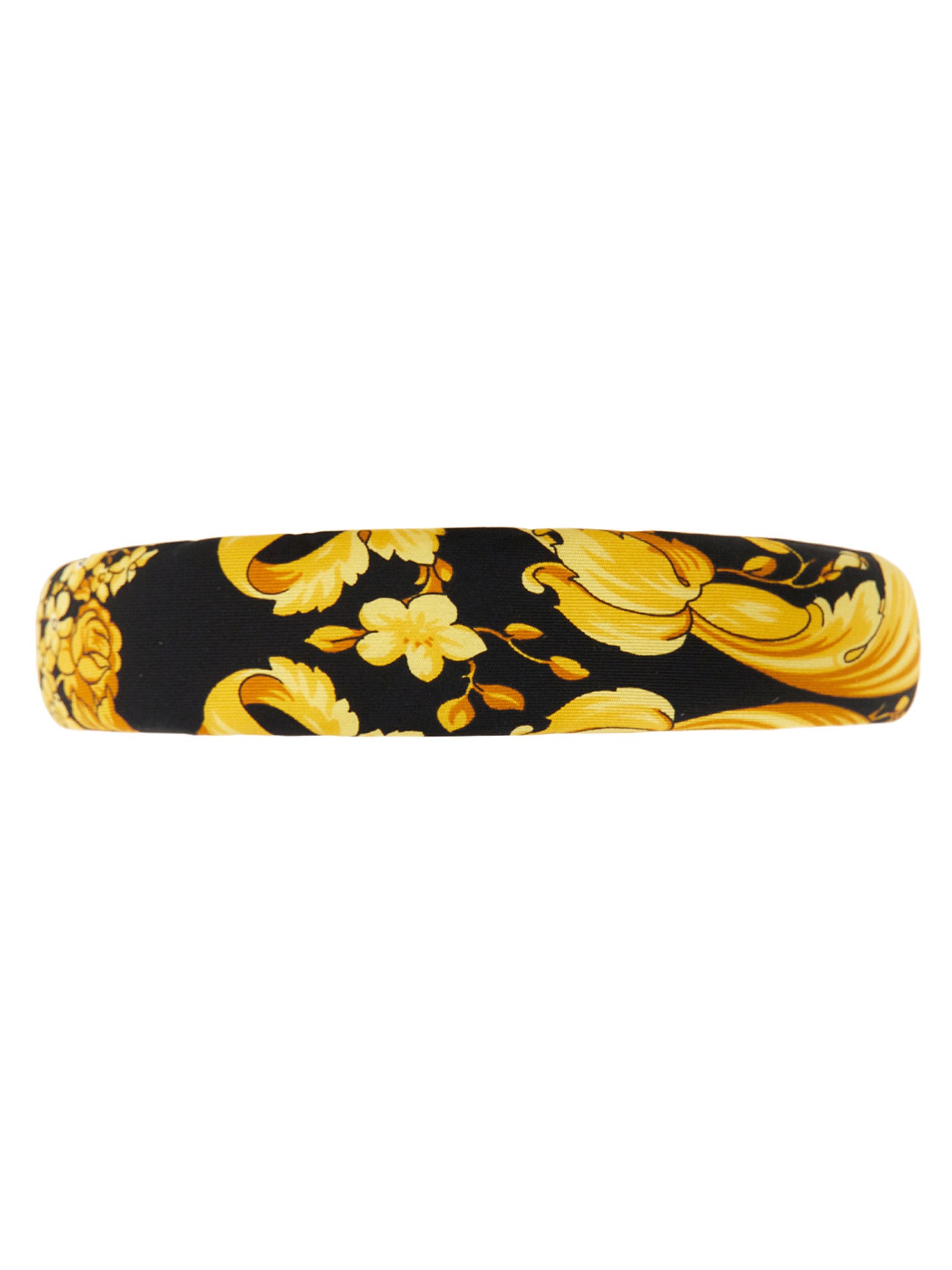 The silk headband from Versace has a gold leaf pattern that reminds you of the rich history of Italy. The gold pattern was made by hand, and the colour is vibrant. The soft and supple fabric of this luxurious headband is enhanced with beautiful baroque print. The silk is lightweight, breathable, and has a beautiful drape.