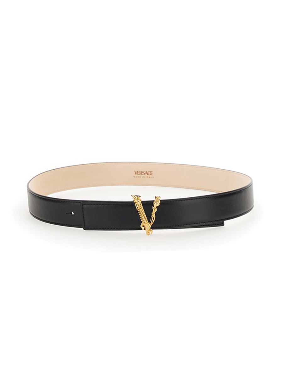 This classic leather belt by Versace is made from smooth, soft leather with baroque buckle closure. The brass buckle has a polished finish and a unique shape that makes it a stylish accessory. It features silver-finished metal accessories and it measures 3 cm in height.