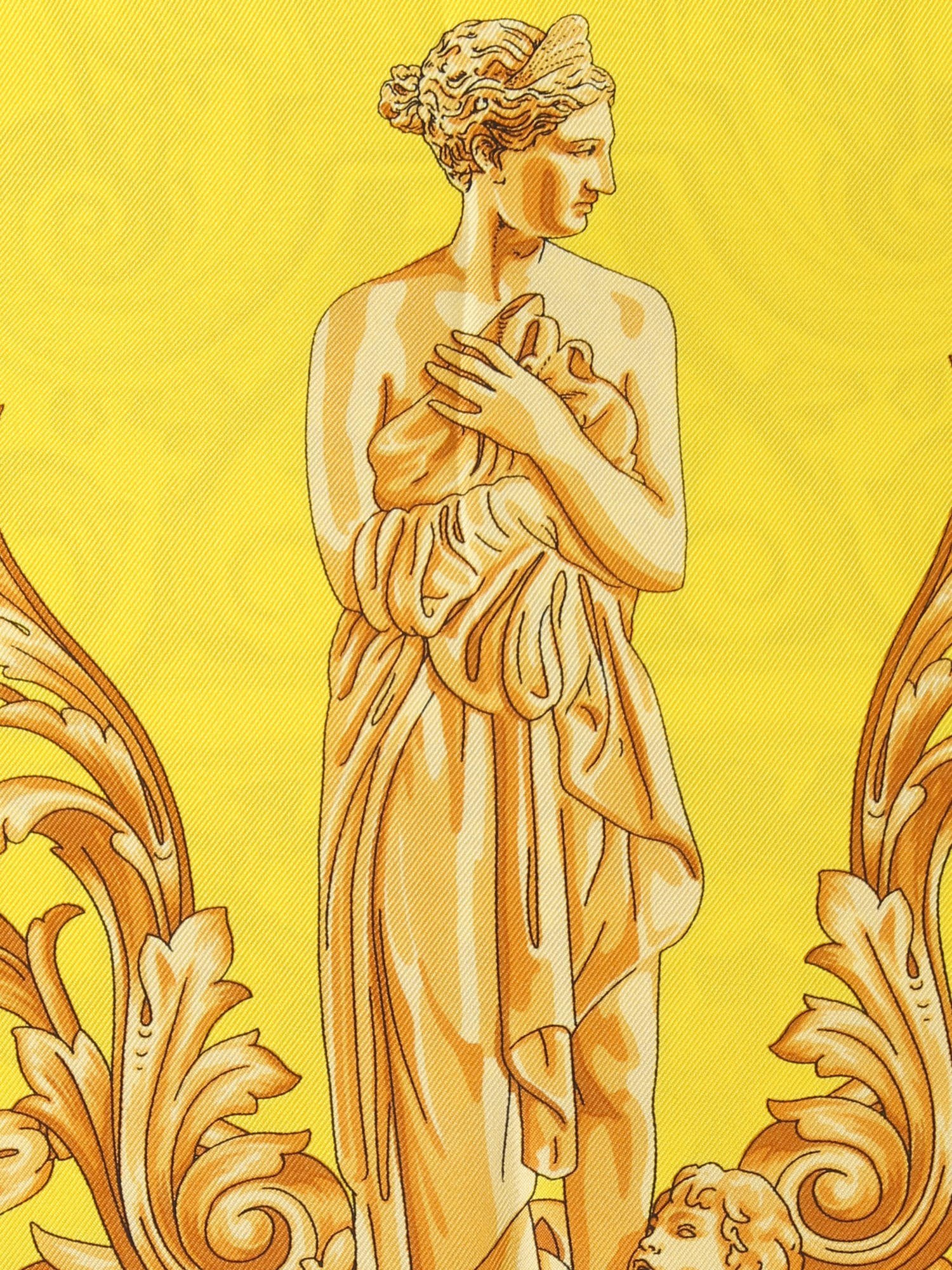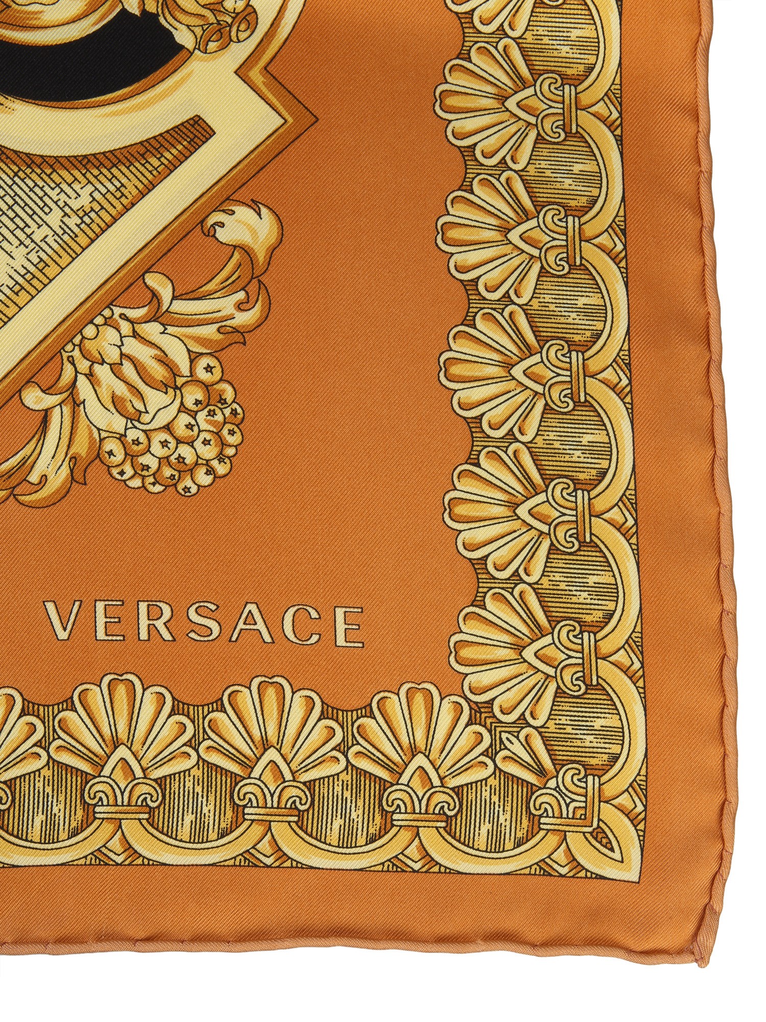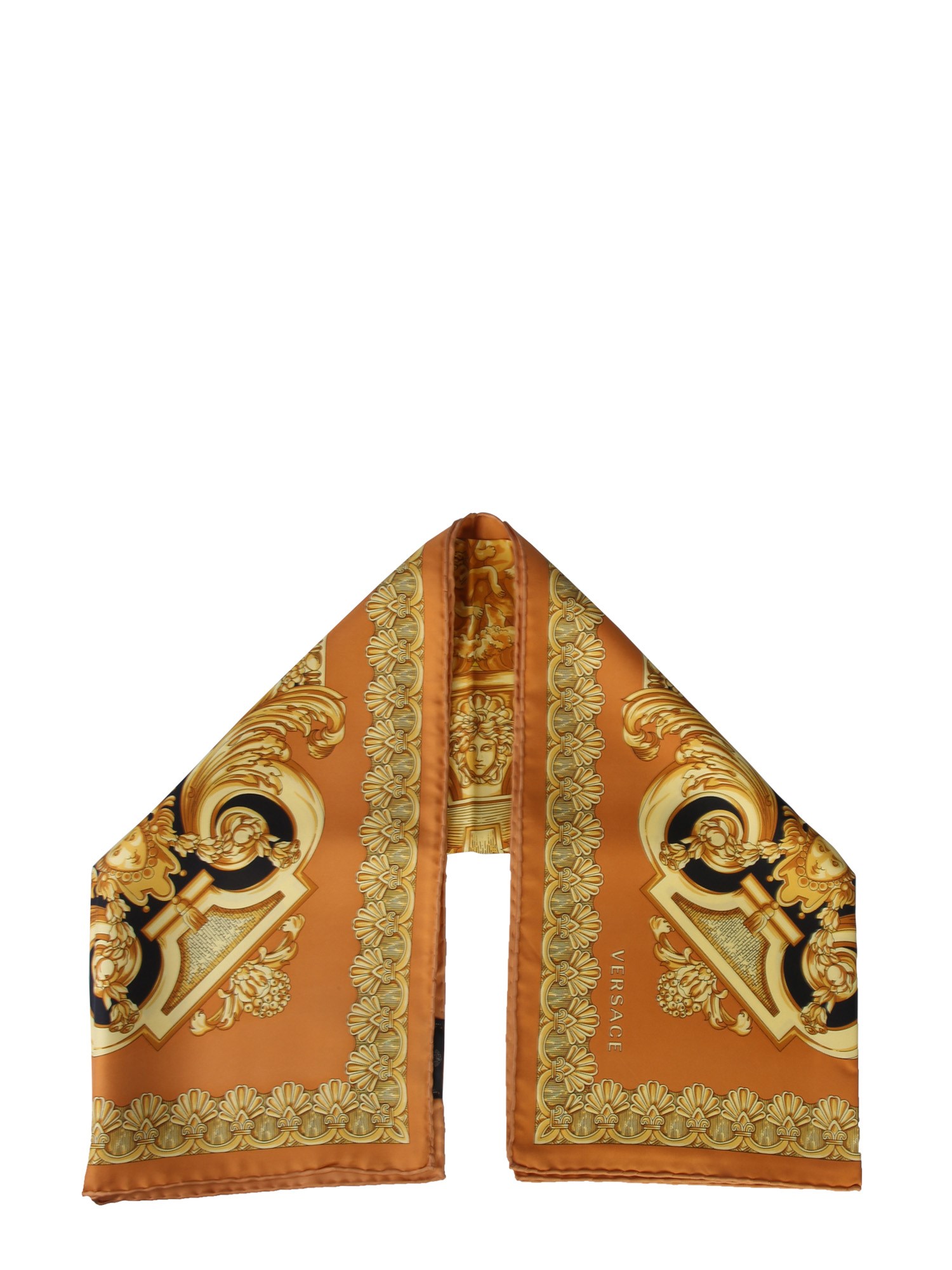 Upgrade your daily look with the square scarf from Versace. This gorgeous accessory is made of 100% silk for smooth finish and luxurious feel. The scarf has rolled edging that gives it a distinctive yet attractive look. You can pair this scarf with party outfits, office wear or casual dresses.
