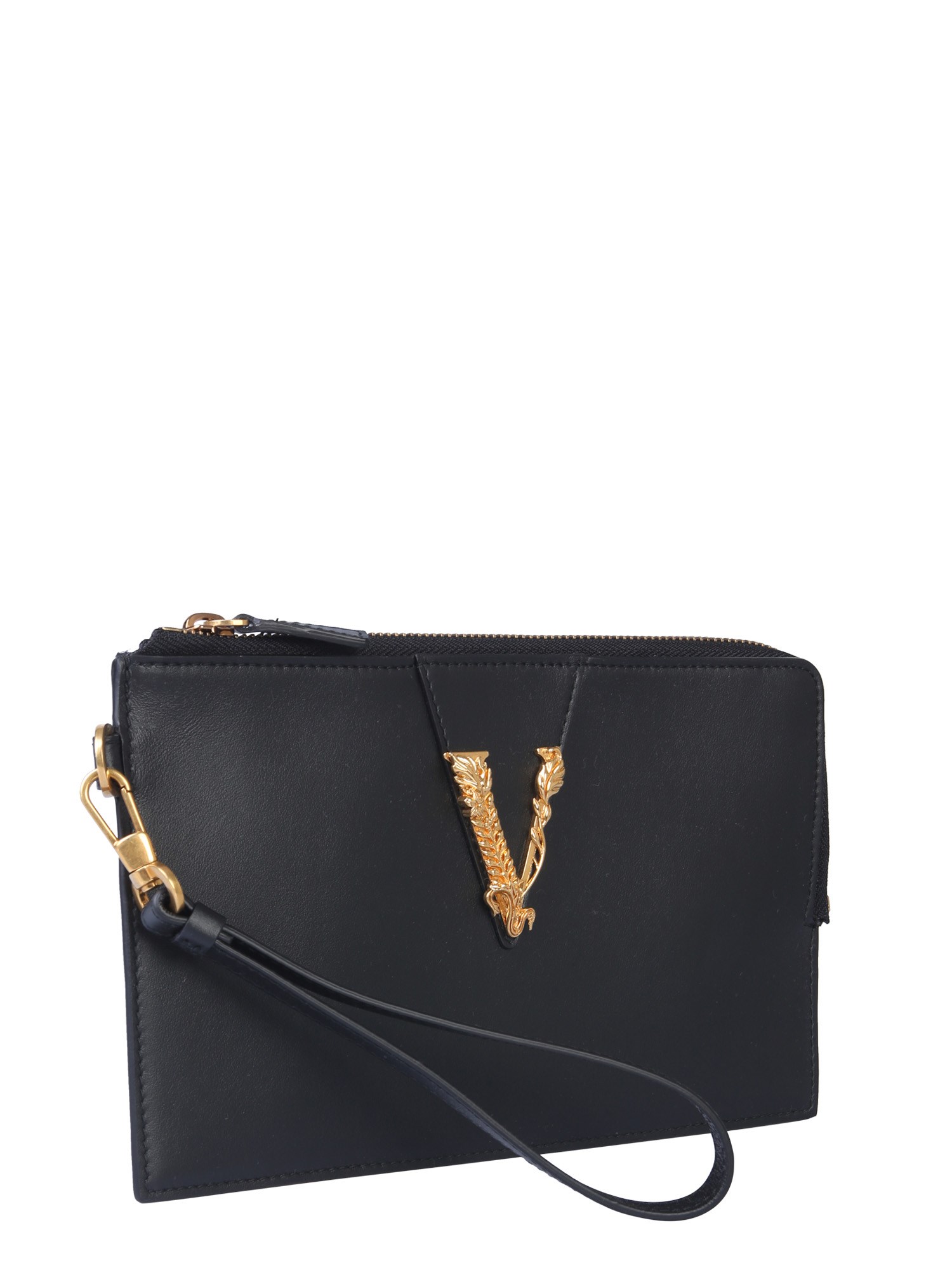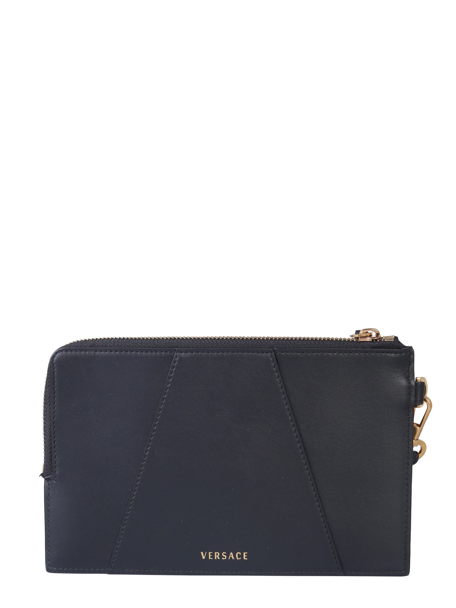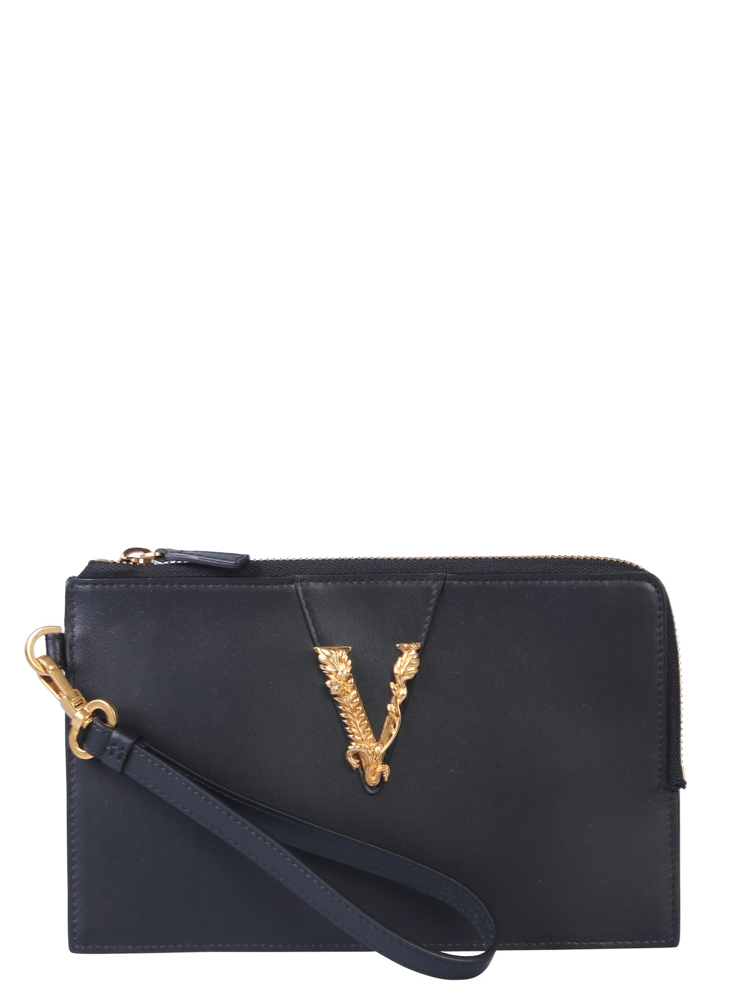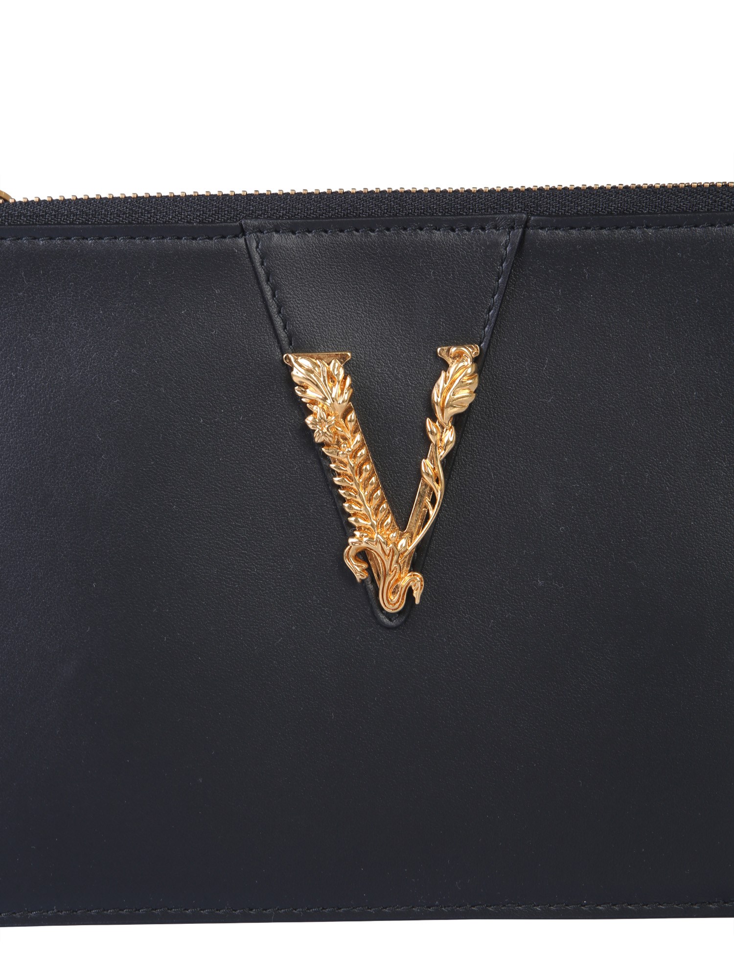 The small clutch from Versace is your perfect shopping companion. It has an inner pocket to keep all your essentials organized. The clutch has V-detailing and is made of calf leather for an attractive finish and a lasting performance. The zip closure keeps all your essentials safe. You can carry this clutch wherever you go as it matches every kind of outfit.