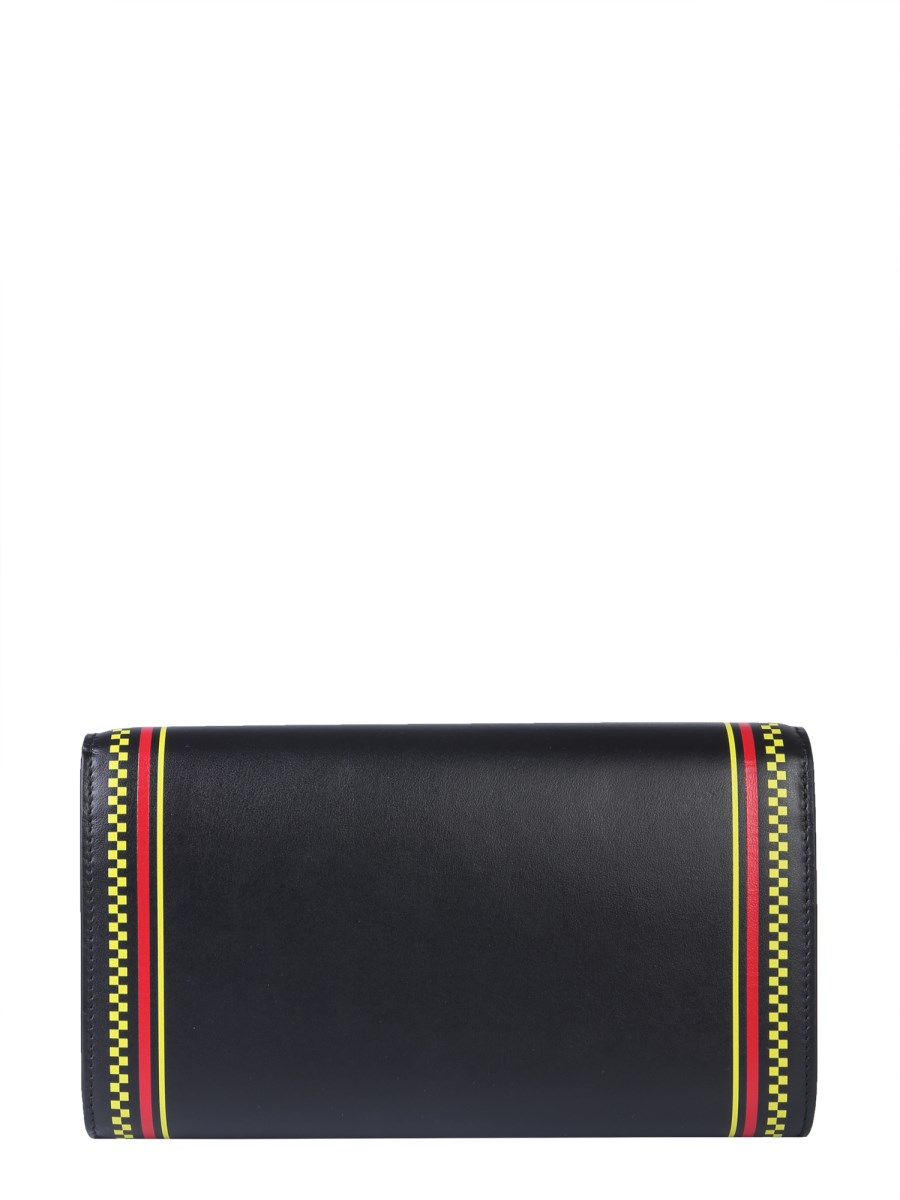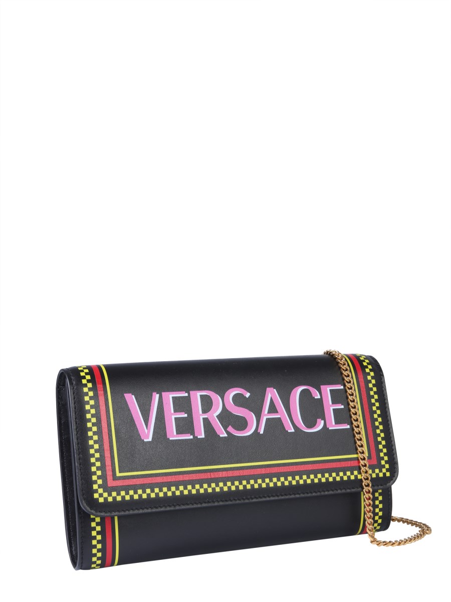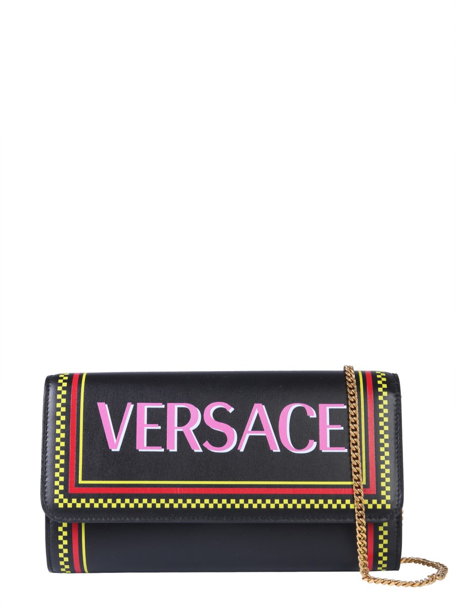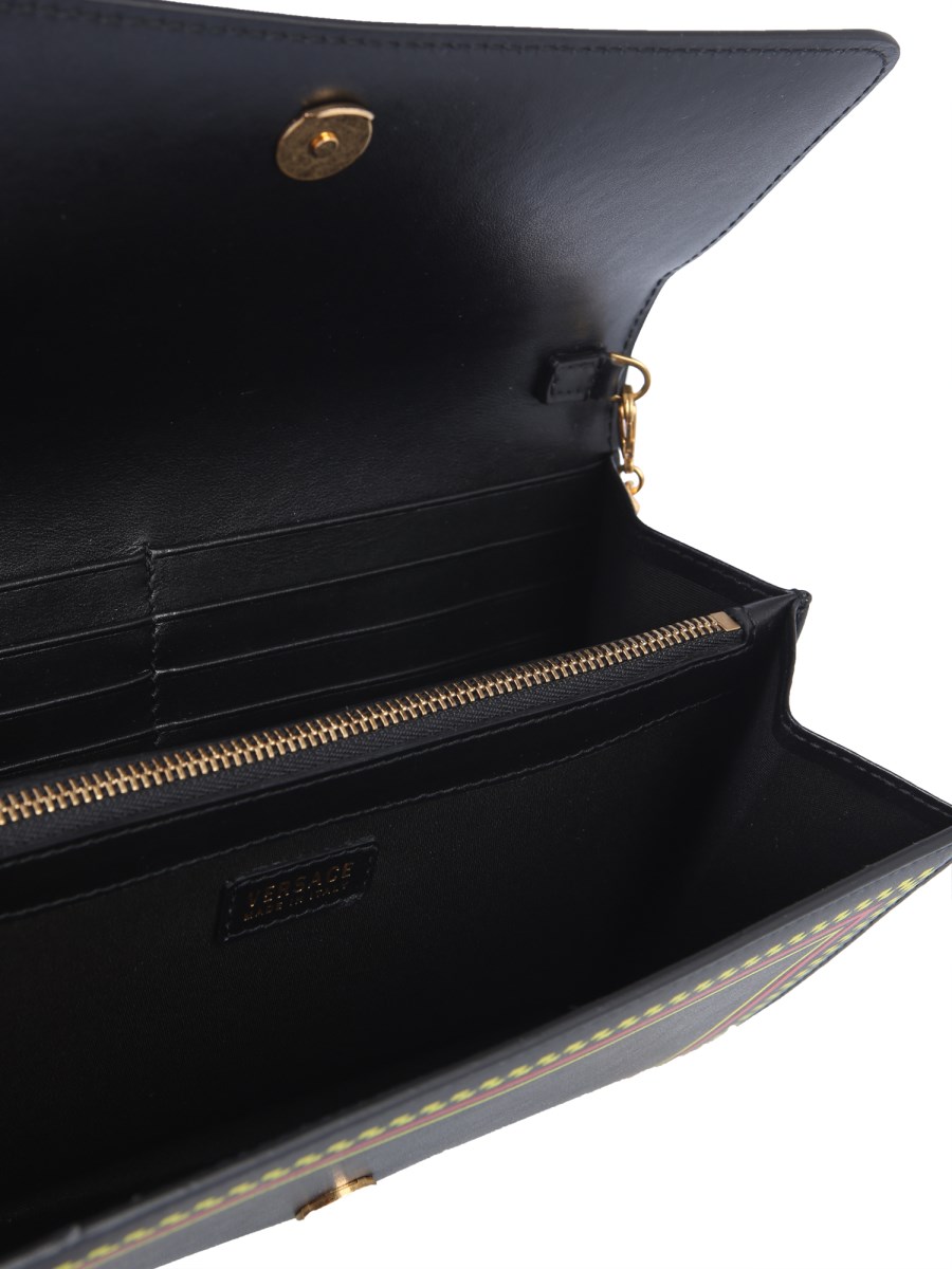 Ensure safety of your money and cards by using this vintage 90s logo bag from the house of Versace. The bag features a removable chain shoulder strap with magnetic closure. Made from good quality leather, the bag has a matt finished surface. The contrasting lines on the borders aptly complement its dark shade. The bag is enclosed with multiple compartments to keep the essentials easily.