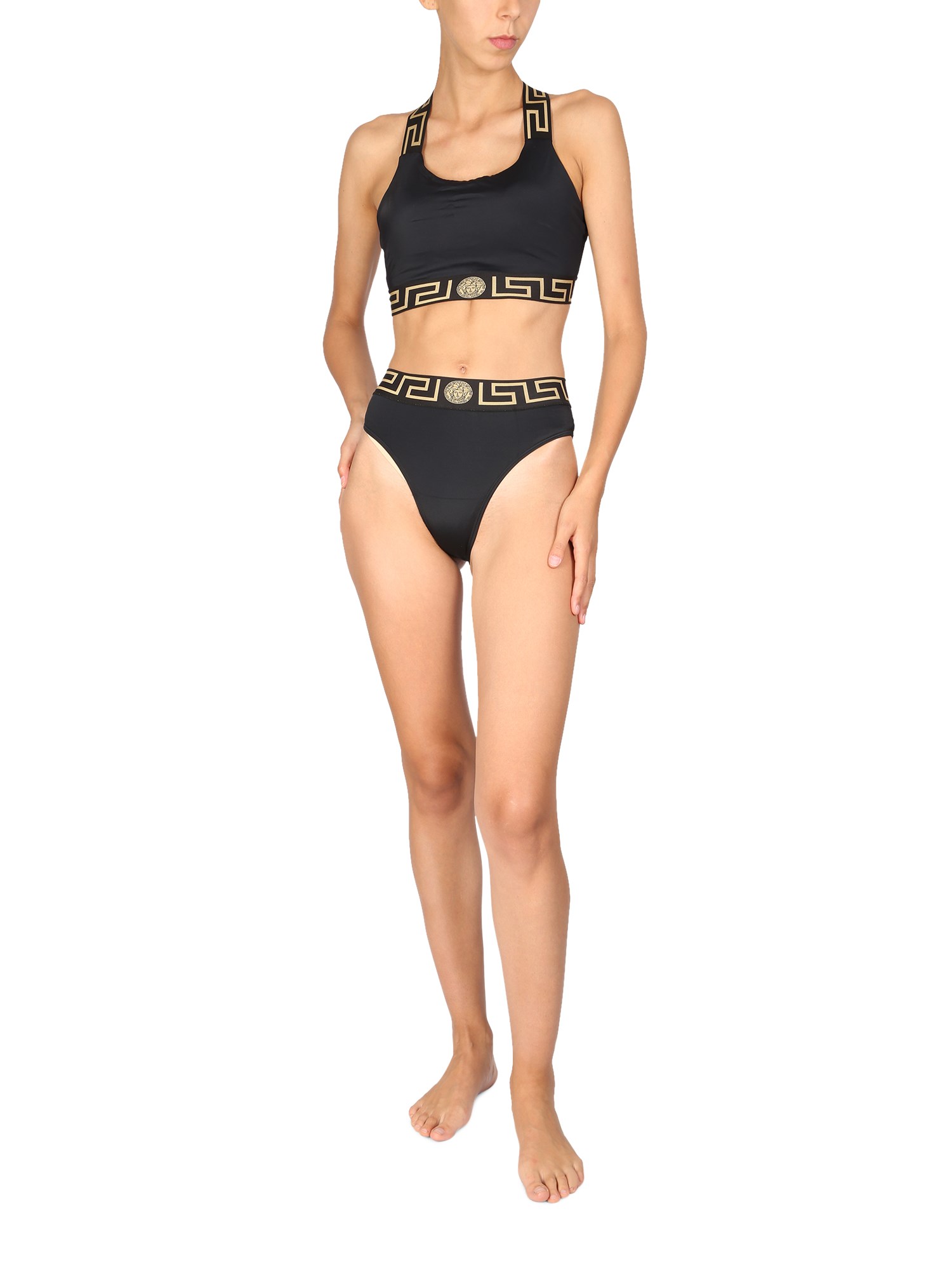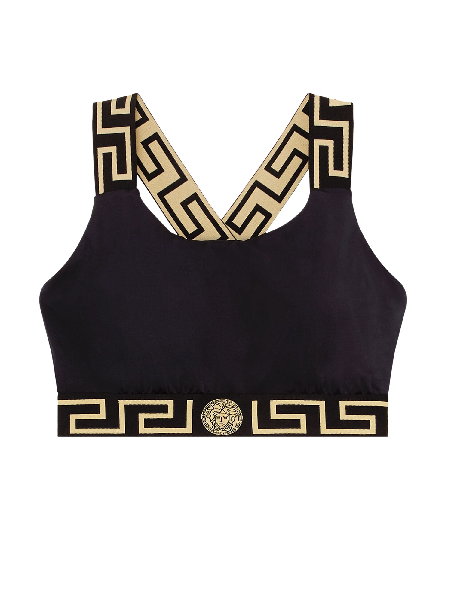 This bikini top from Versace has a Greek border that is lined with gold colour. It is a unique style that is meant to be paired with a black or navy blue bikini bottom. The straps are made of elastic, which makes them comfortable to wear. It features a round neckline and an elastic band with fringing.