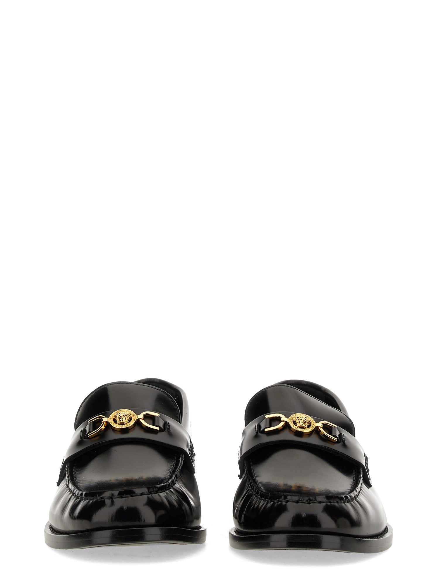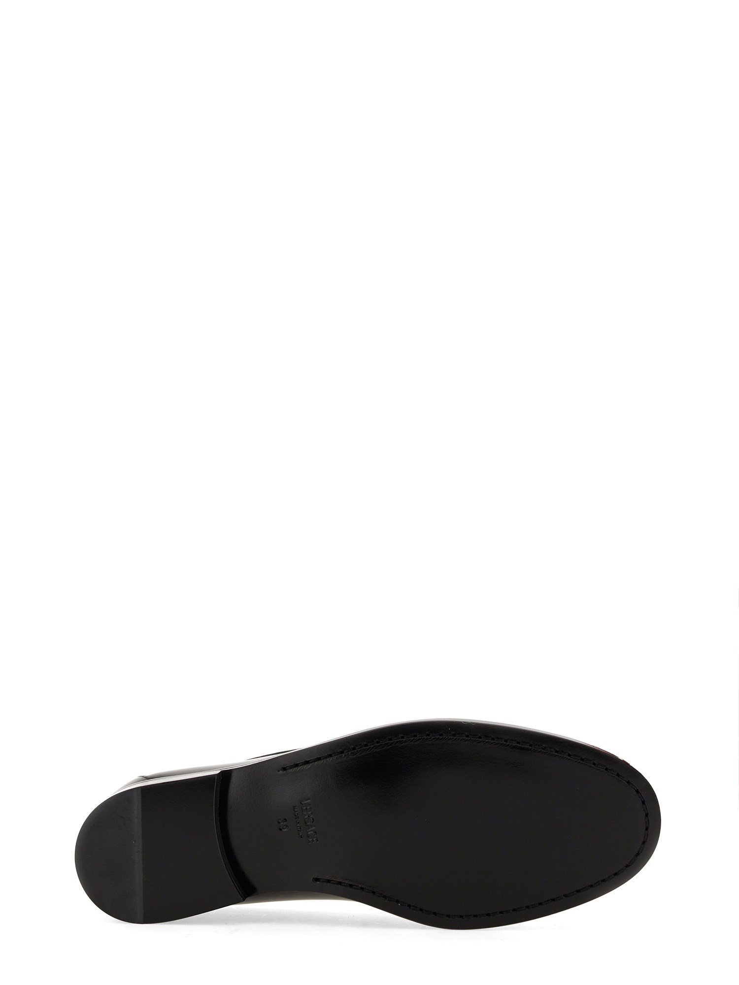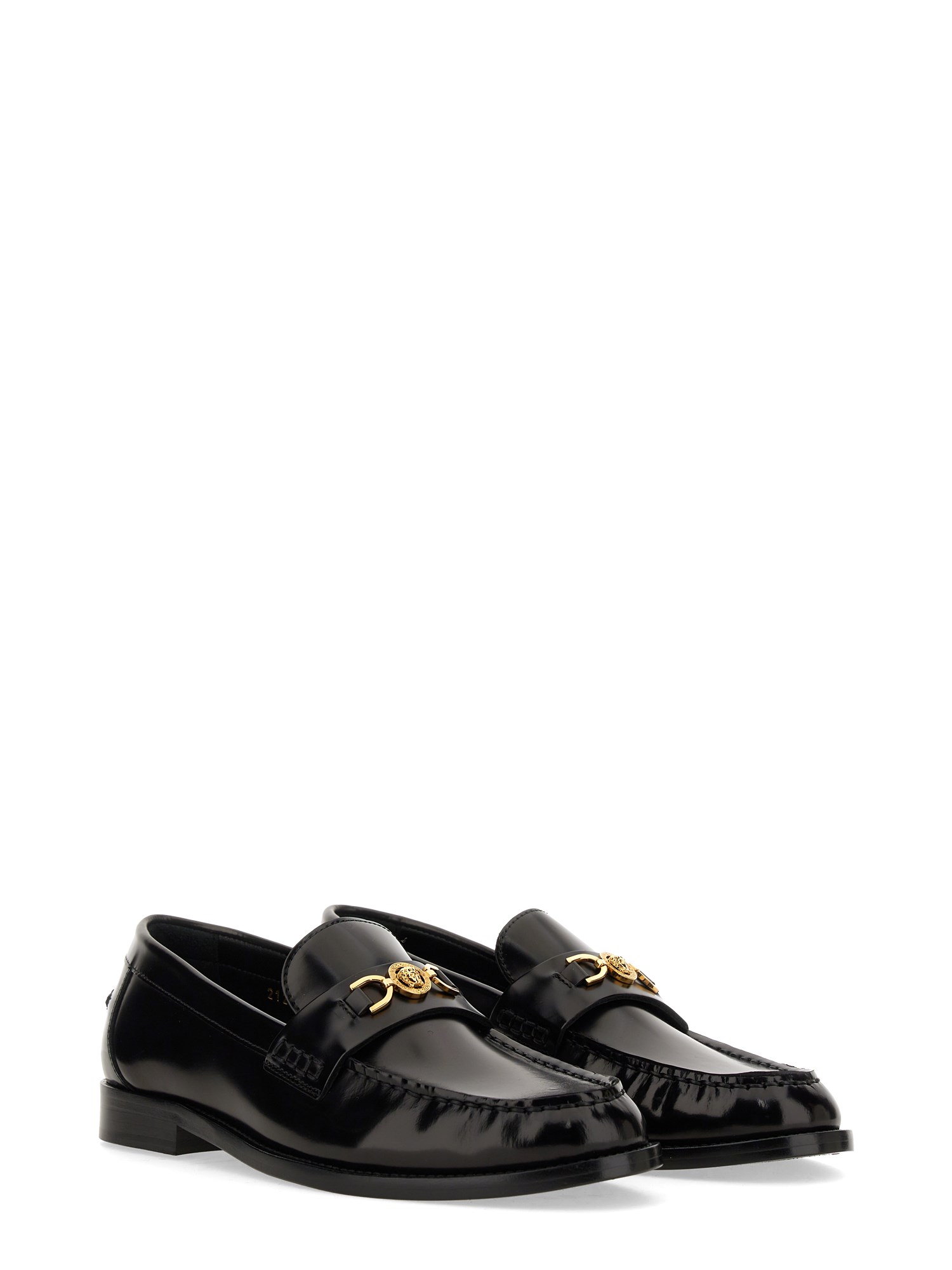 These black leather loafer moccasins from Versace are a stylish and versatile addition to any wardrobe. Made from high-quality leather, they offer both comfort and durability. The classic black colour makes them suitable for both formal and casual occasions, while the loafer style adds a touch of sophistication. With their slip-on design and cushioned insole, these moccasins provide a comfortable fit all day long. Whether you're heading to the office or going out for a night on the town, these black leather loafer moccasins are the perfect choice.