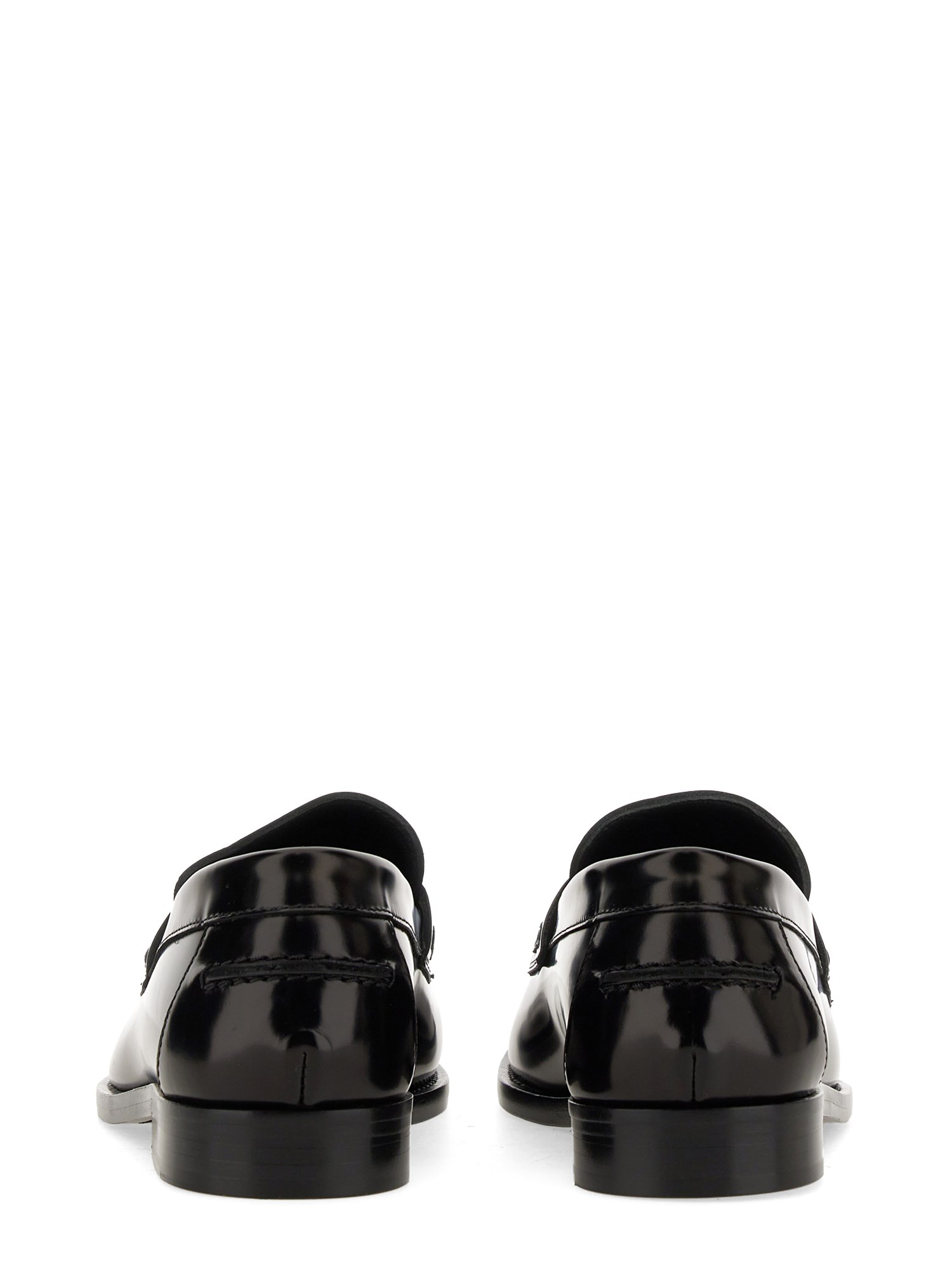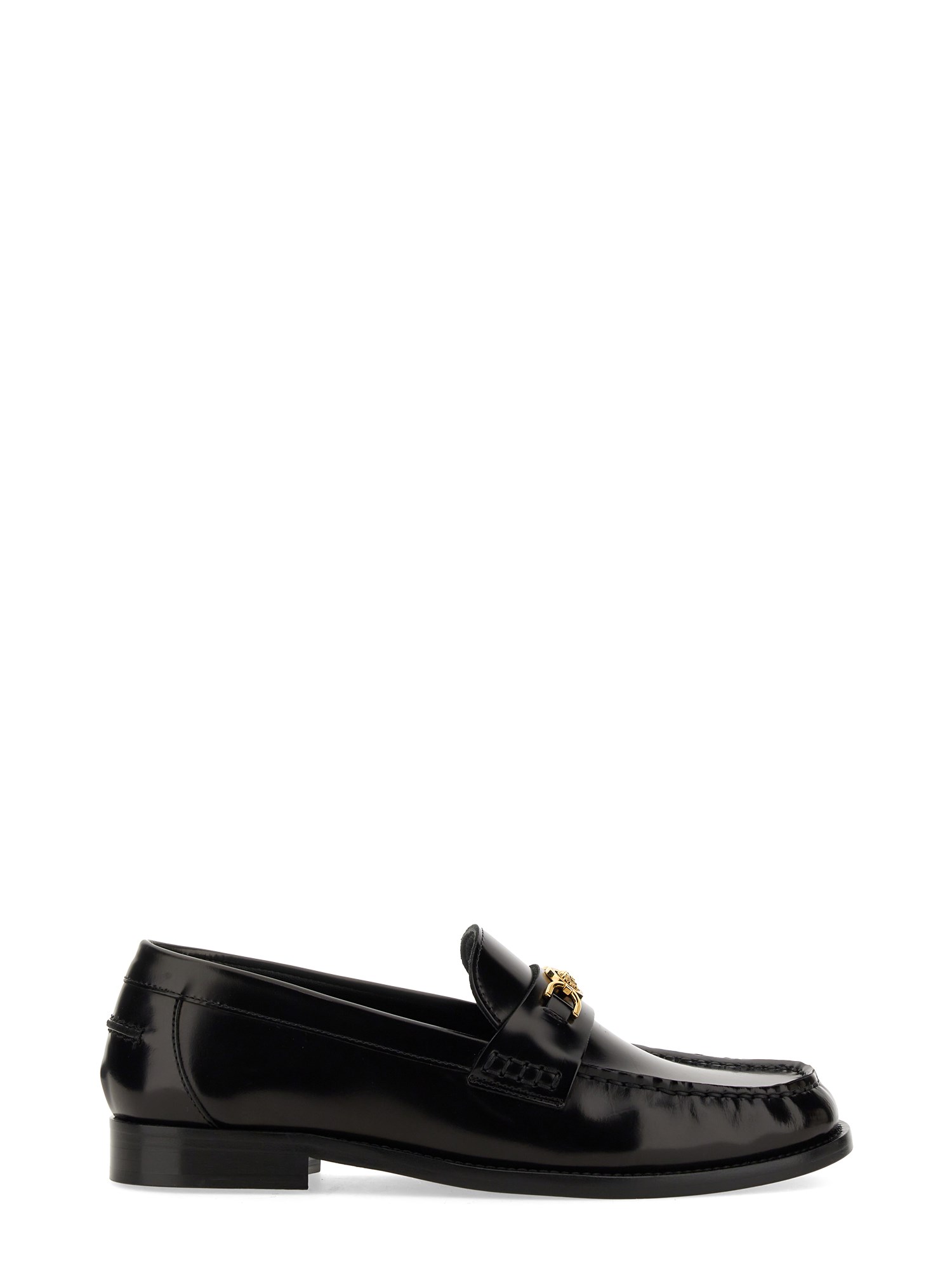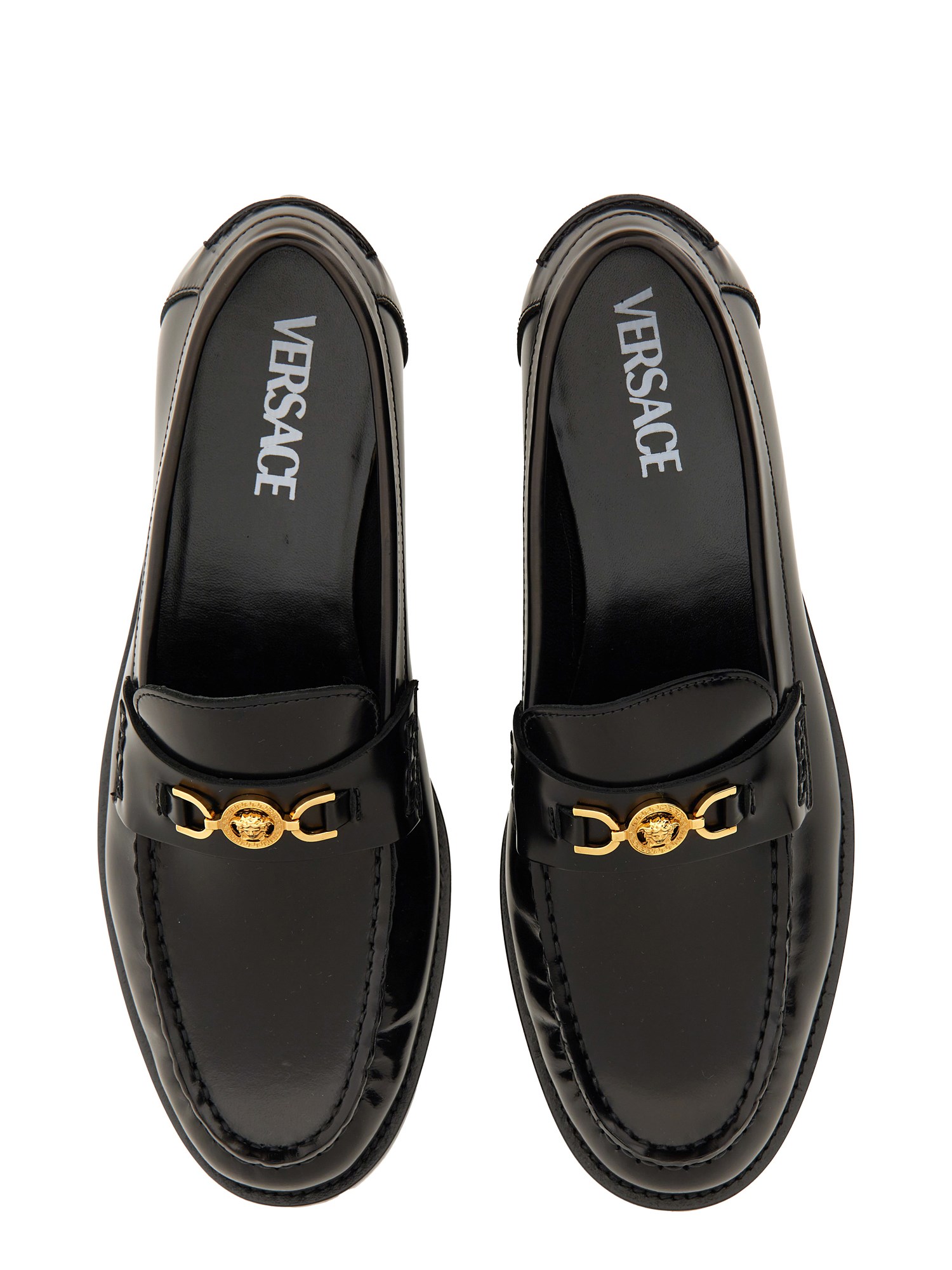 These black leather loafer moccasins from Versace are a stylish and versatile addition to any wardrobe. Made from high-quality leather, they offer both comfort and durability. The classic black colour makes them suitable for both formal and casual occasions, while the loafer style adds a touch of sophistication. With their slip-on design and cushioned insole, these moccasins provide a comfortable fit all day long. Whether you're heading to the office or going out for a night on the town, these black leather loafer moccasins are the perfect choice.