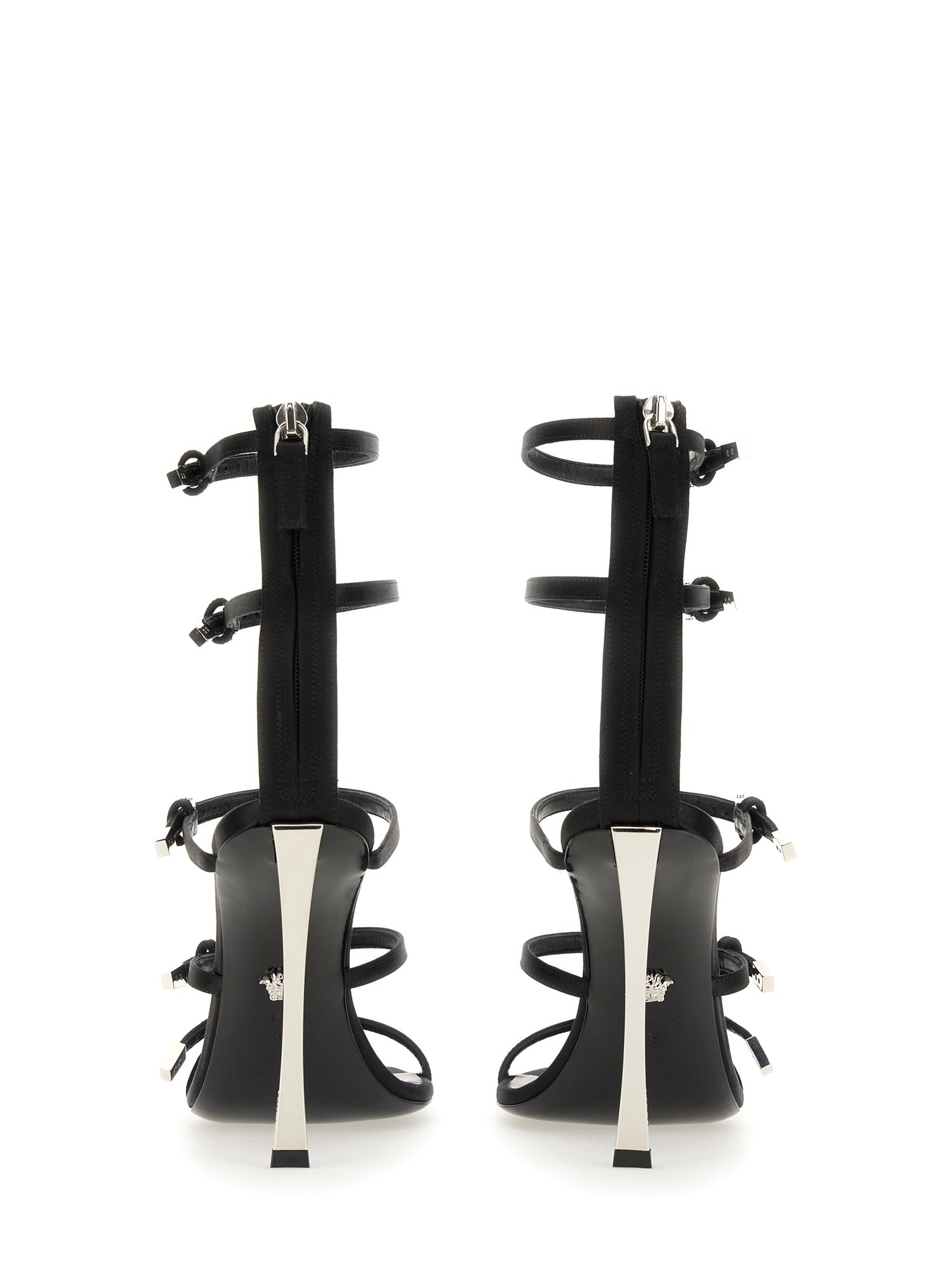 These open-toe Pin-Point sandals are characterized by curved, high stiletto heels and V-shaped accent hardware. The style features four adjustable upper straps and a fixed lower strap.