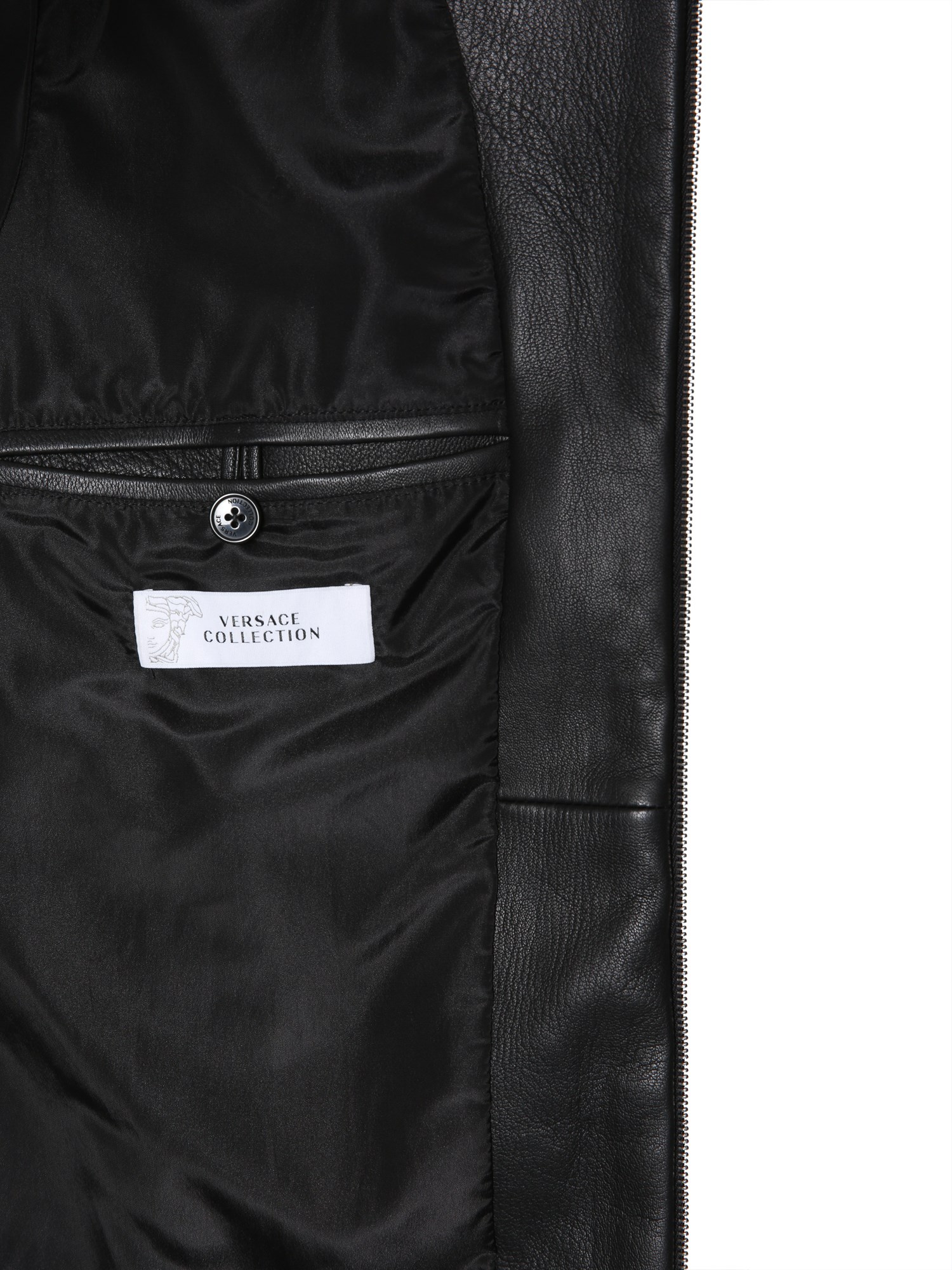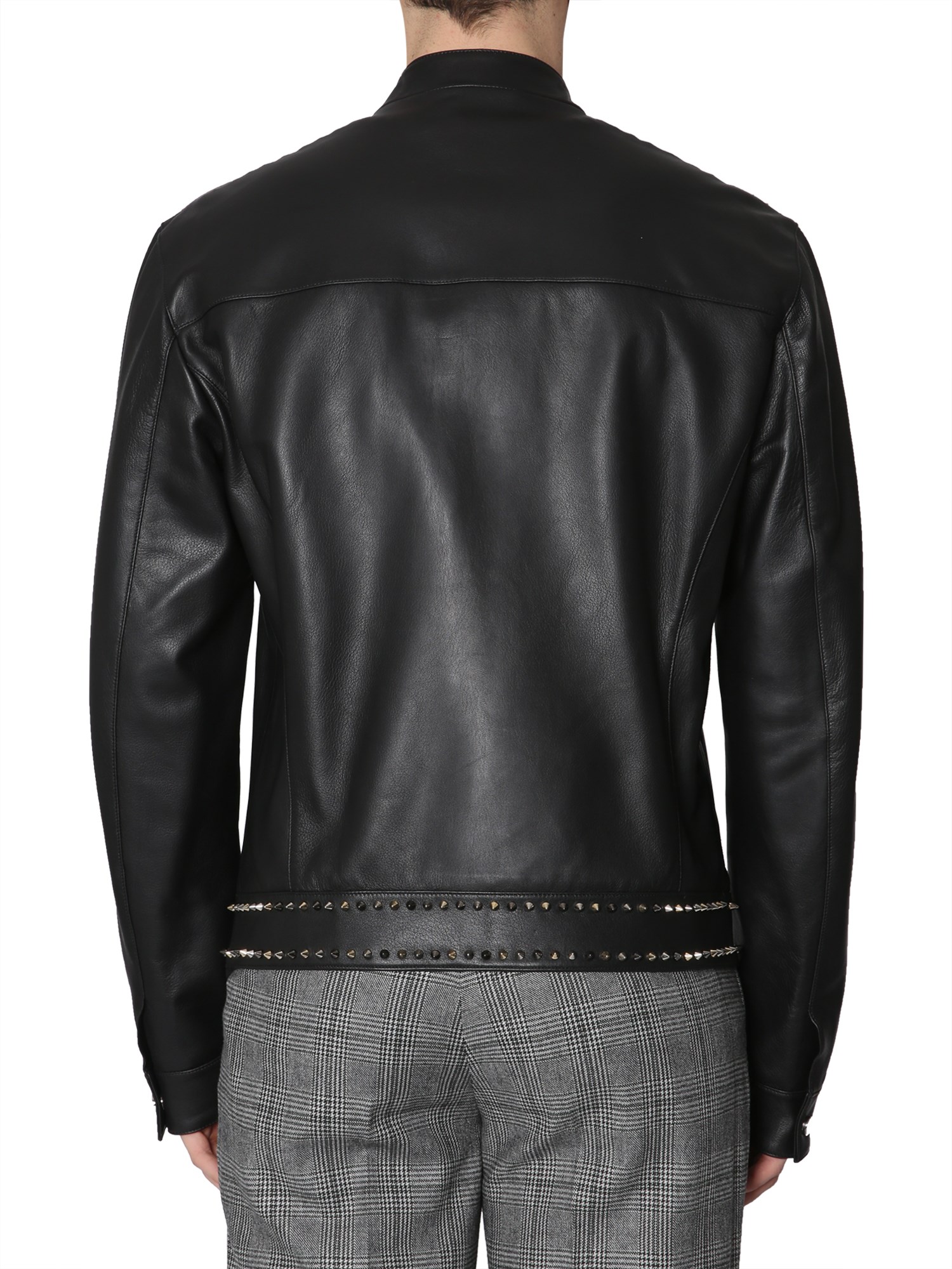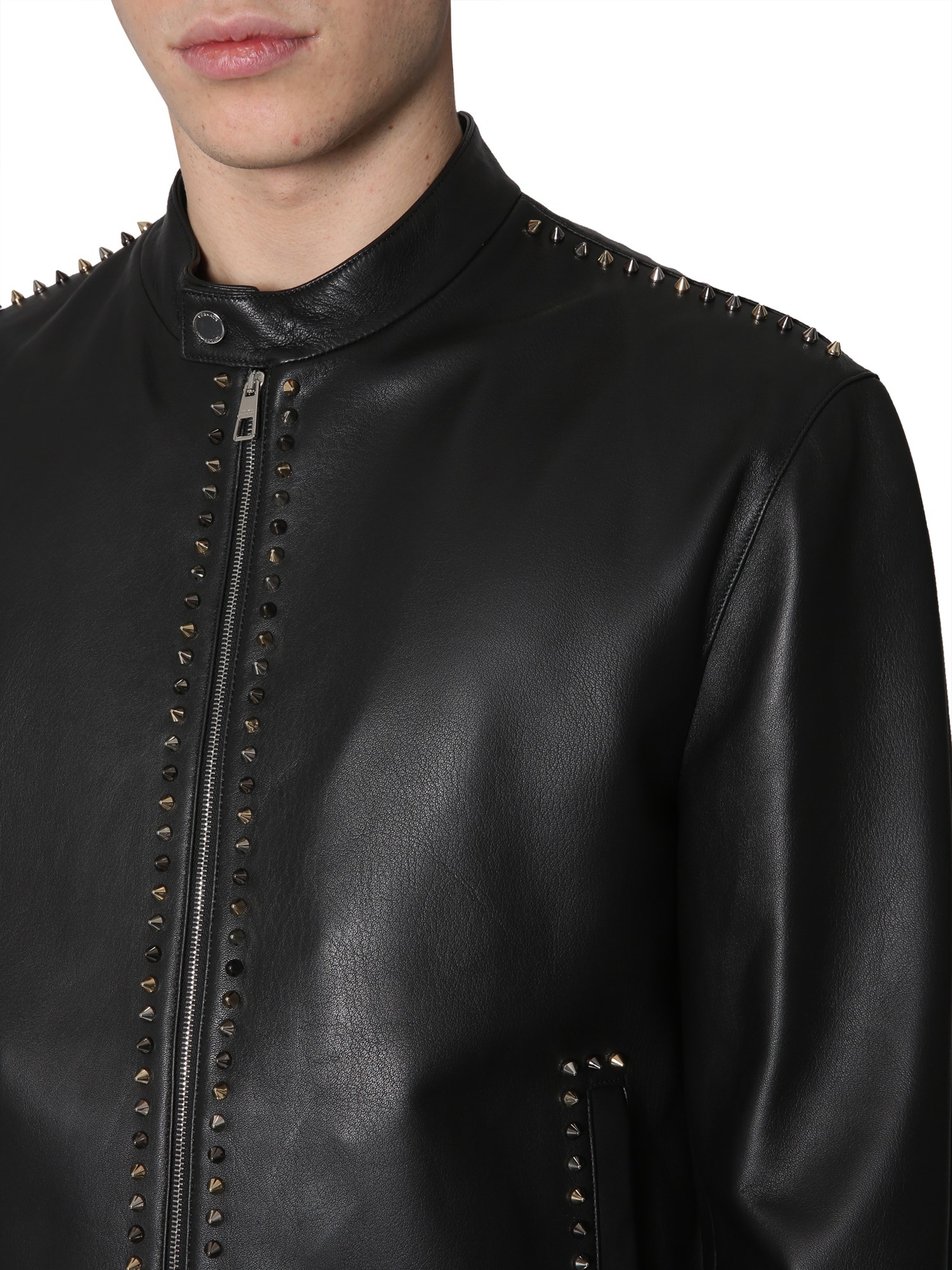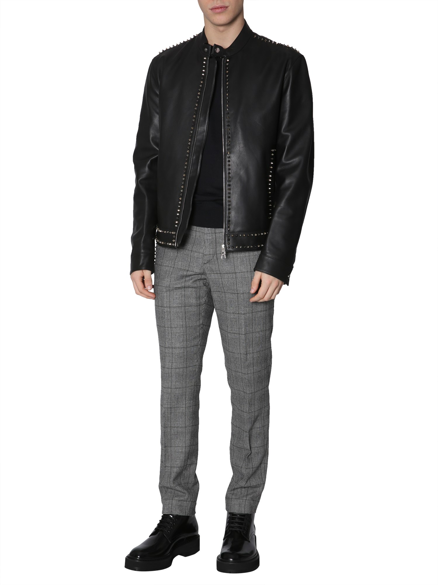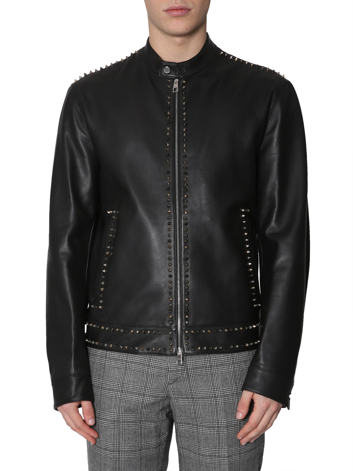 This leather jacket by Versace Collection is a dream of every biker. Crafted in genuine lamb leather, the jacket is supple and stylish. It is studded along the shoulders, closure, and hem for a fashion-forward punk look. There are internal and side pockets in the jacket that help you keep your belongings safe.