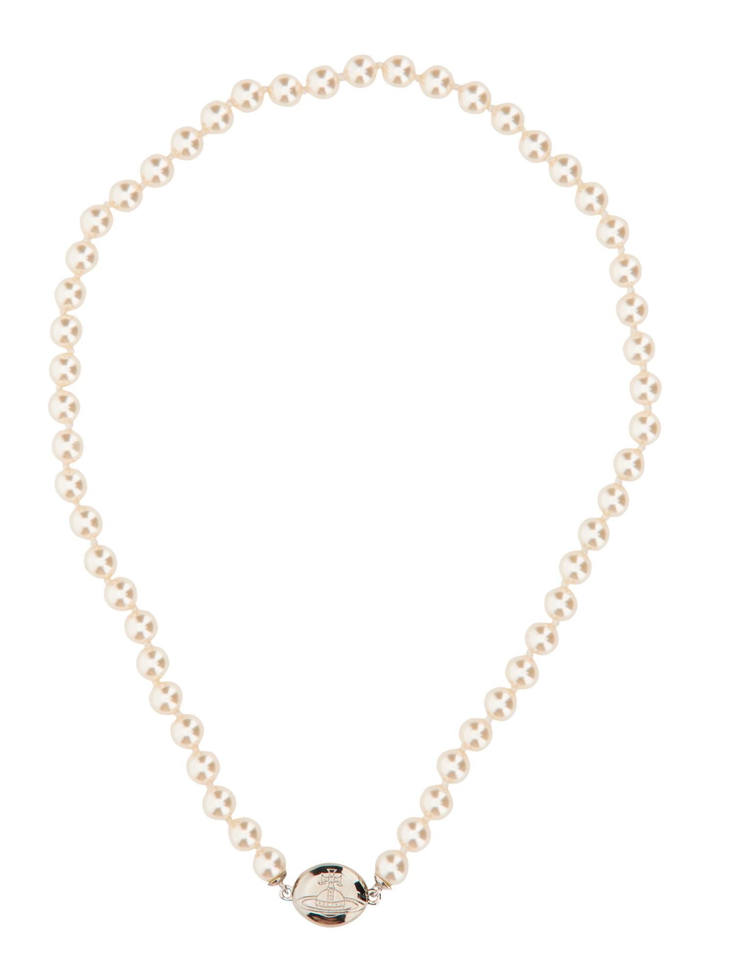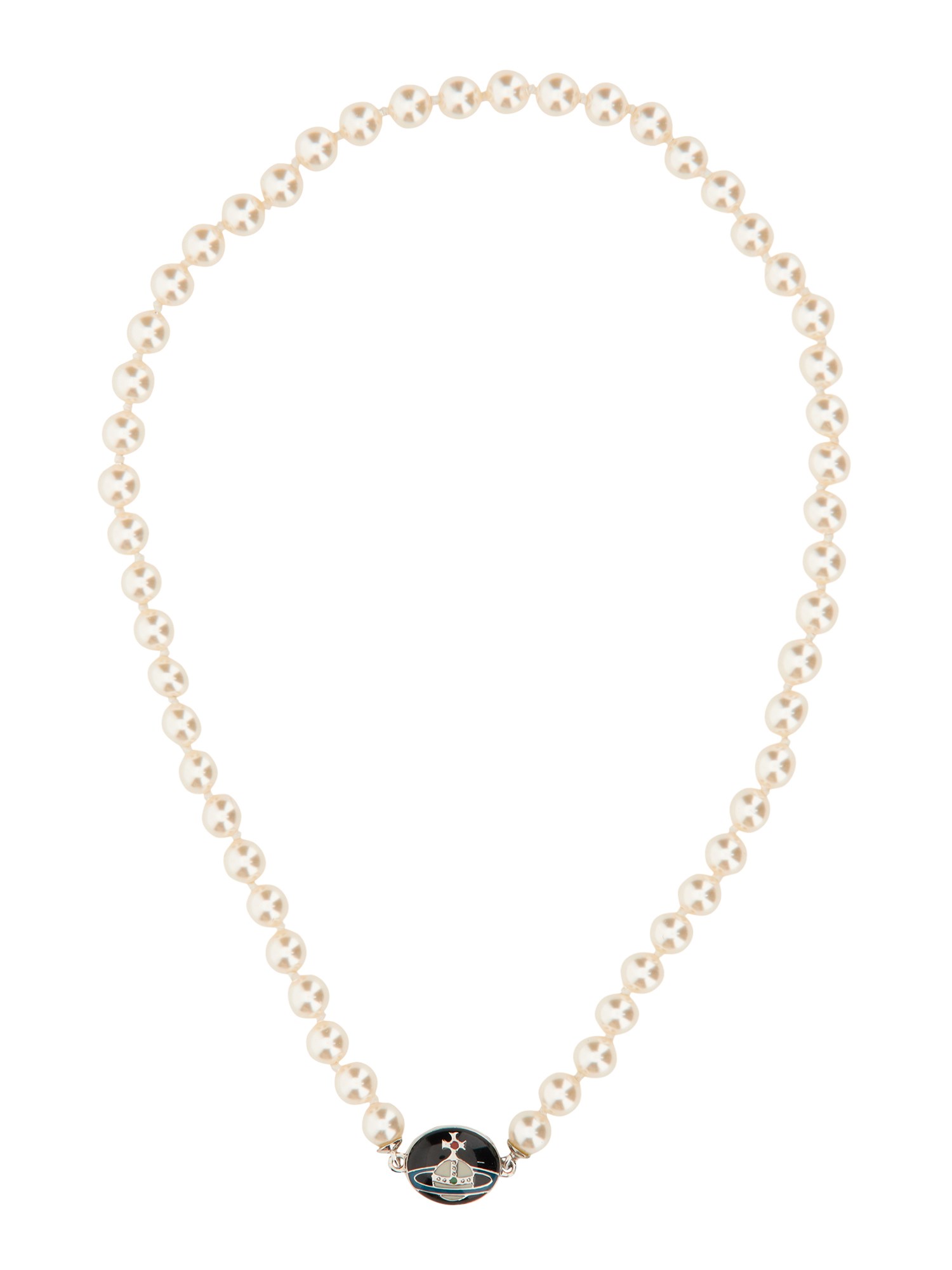 This necklace from Vivienne Westwood is a classic staple in every woman's jewellery box. With a simple design, this chain is a simple yet elegant piece that will go with any outfit. The gold finished chain has a white pearl at the centre and is wrapped in a magnetic clasp. This necklace is made from 100% brass and showcases a hand-painted Orb logo.