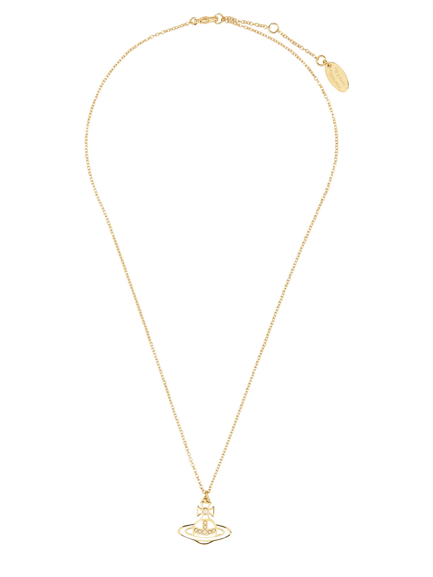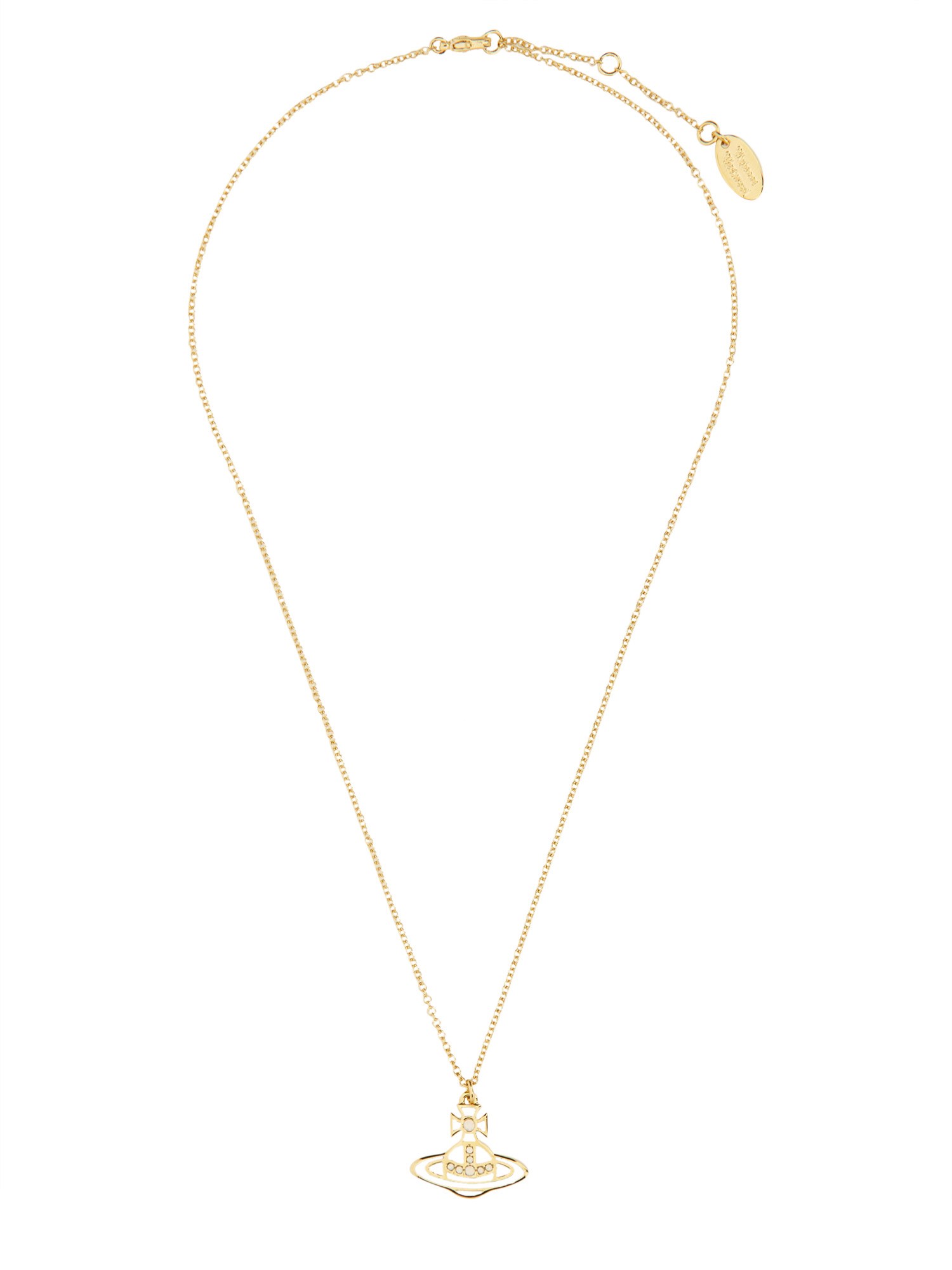 The "Concetta" necklace from Vivienne Westwood exemplifies elegance and sophistication, featuring a striking design that combines classic elements with contemporary flair. Crafted with high-quality materials, this necklace showcases intricate detailing and a signature orb pendant, making it a statement piece for any occasion. Its versatile style allows it to be effortlessly paired with both casual and formal attire, enhancing the wearer's ensemble with a touch of luxury.