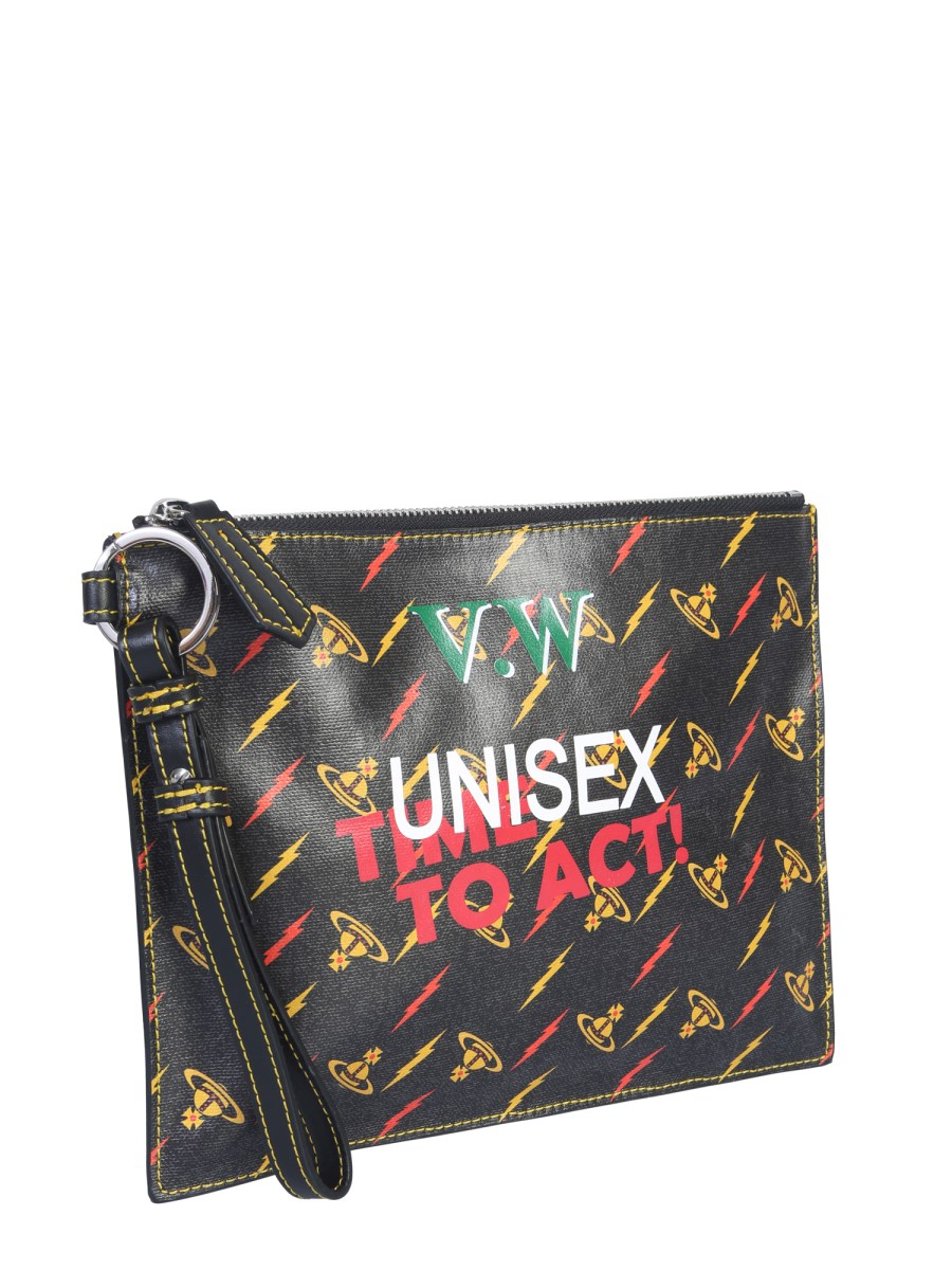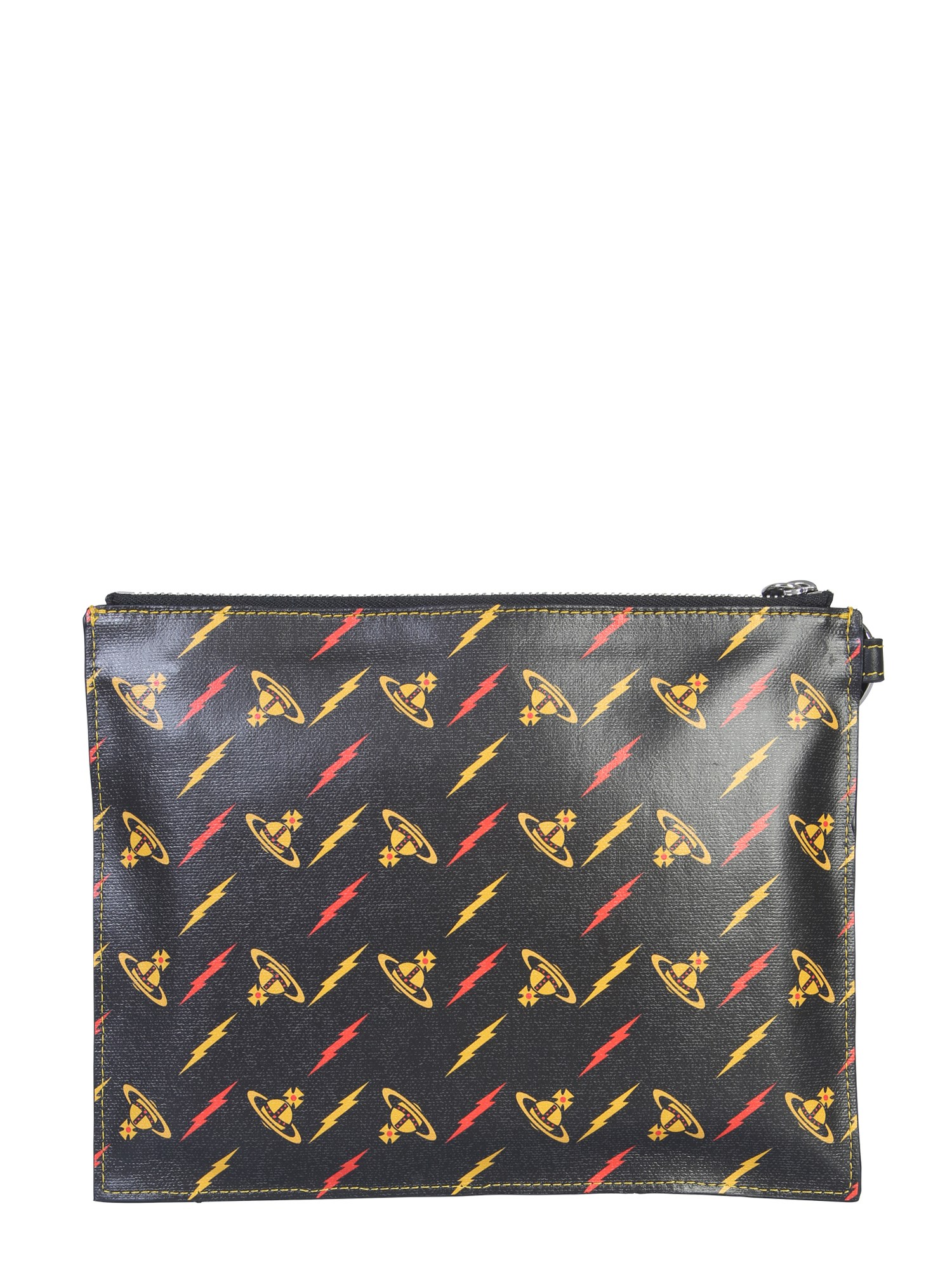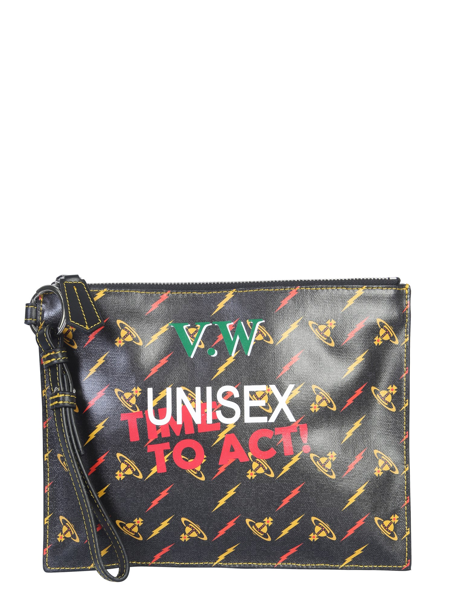 Put all your favourite items in this Colette pouch from Vivienne Westwood. This pouch has a flat arrangement with a matching wrist handle, which helps carry it as a wallet anywhere you go. The canvas exterior is covered with an orb and lightning printing, with colourful writings and brand logo in bold.