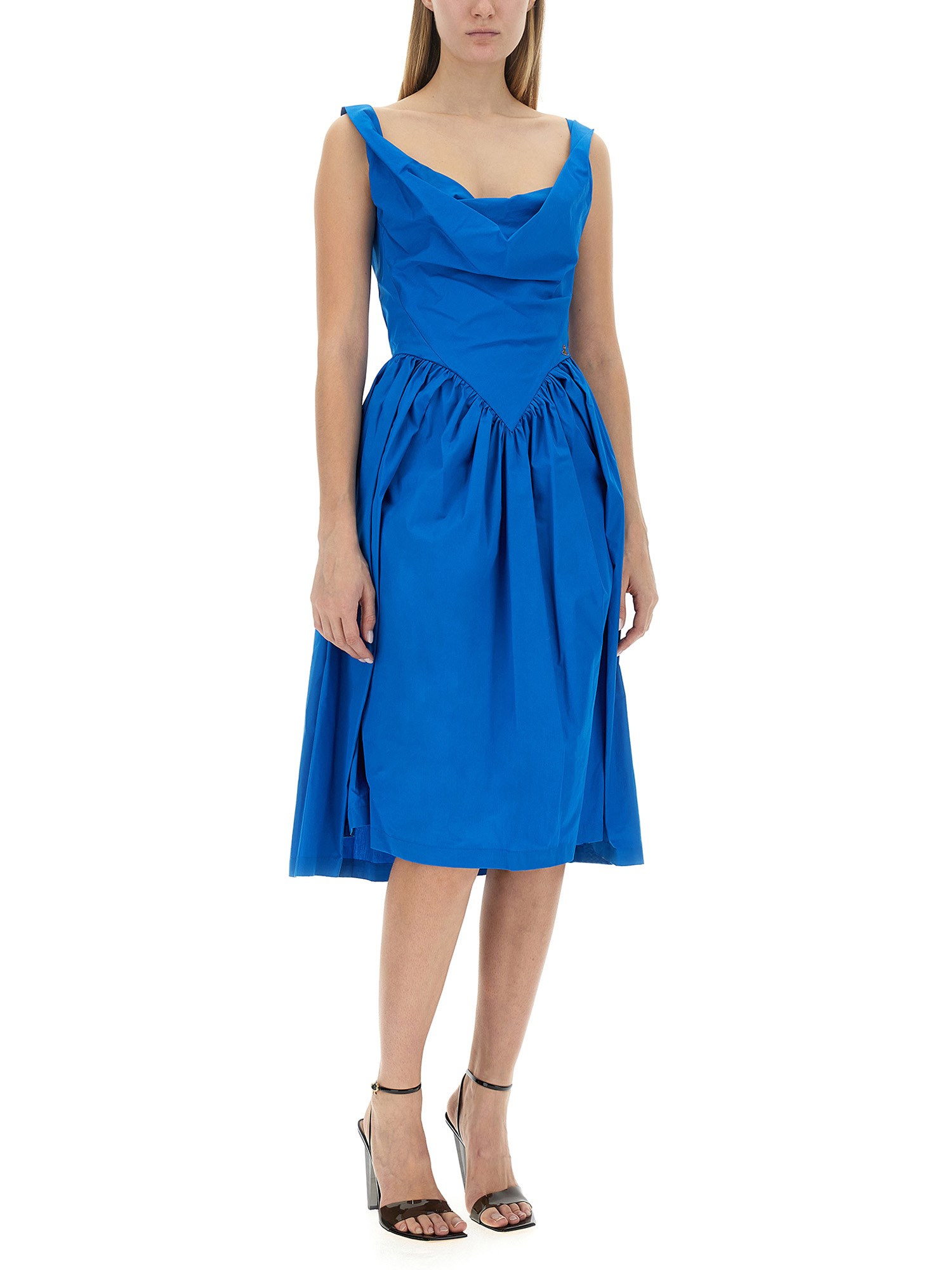Introducing the organic cotton Sunday dress with a corset-inspired silhouette. Featuring a classic basque hem, embroidered orb motif, and multiway shoulder straps. The dress has a full-bodied skirt, concealed zip fastening, pleat detailing, sleeveless design, and a draped neckline, all complemented by a multicoloured orb at the left-hand side of the hip. It's both sustainable and stylish.