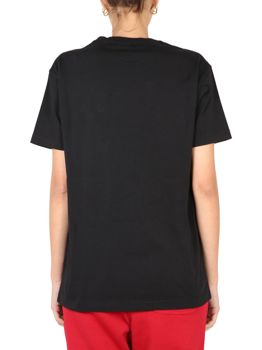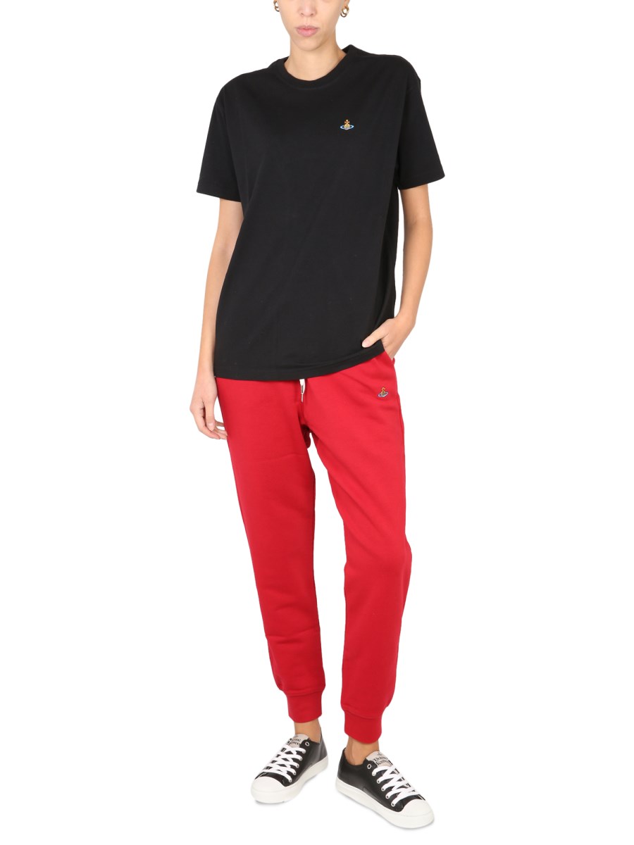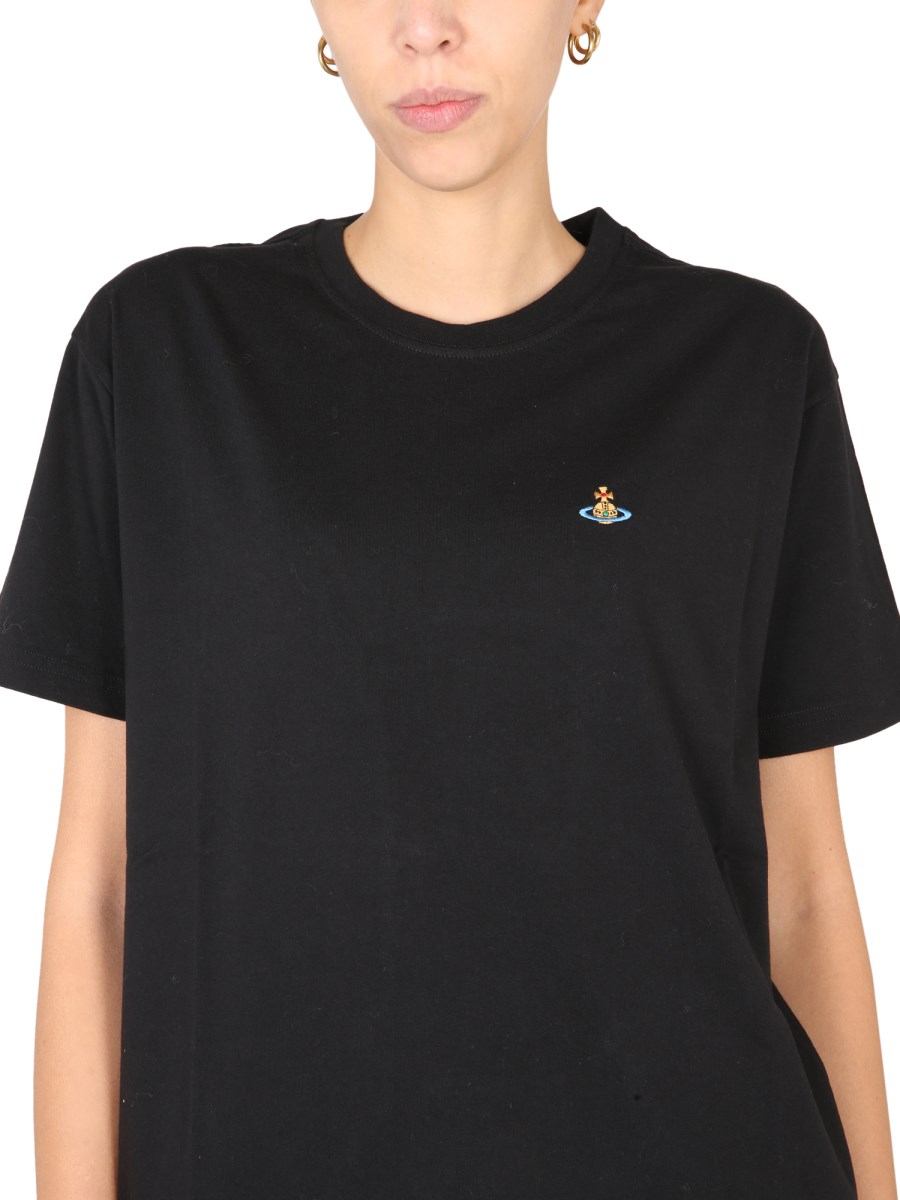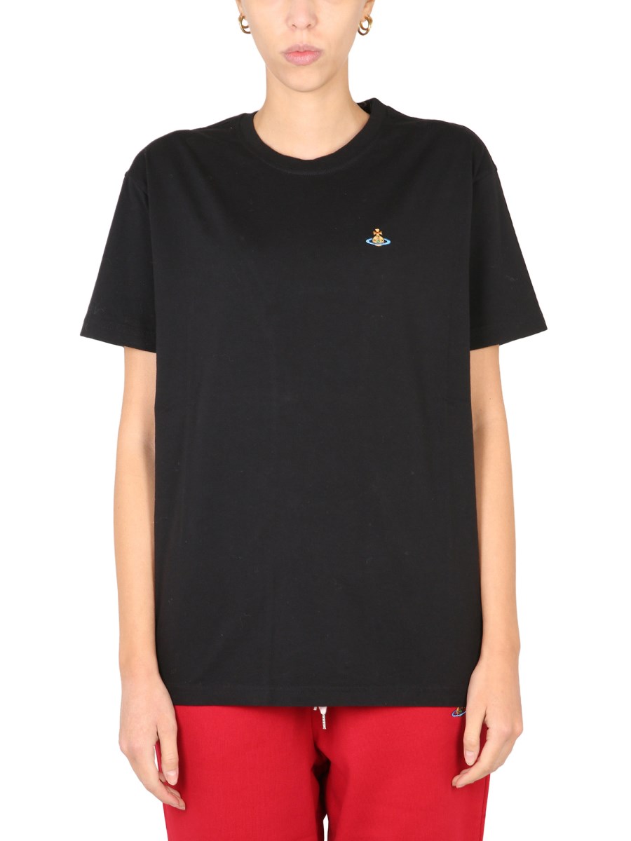 A sleek black T-shirt with a striking white logo from Vivienne Westwood that is a must-have for anyone looking to add a bold look to their wardrobe. This is the perfect shirt for your next occasion, whether it's a night out with friends or a day at work. The soft cotton of this shirt will be comfortable against your skin. The design is a little different, with the scoop neckline and subtle logo on the front of the shirt. The brand logo is embossed into the material for a sleek look.