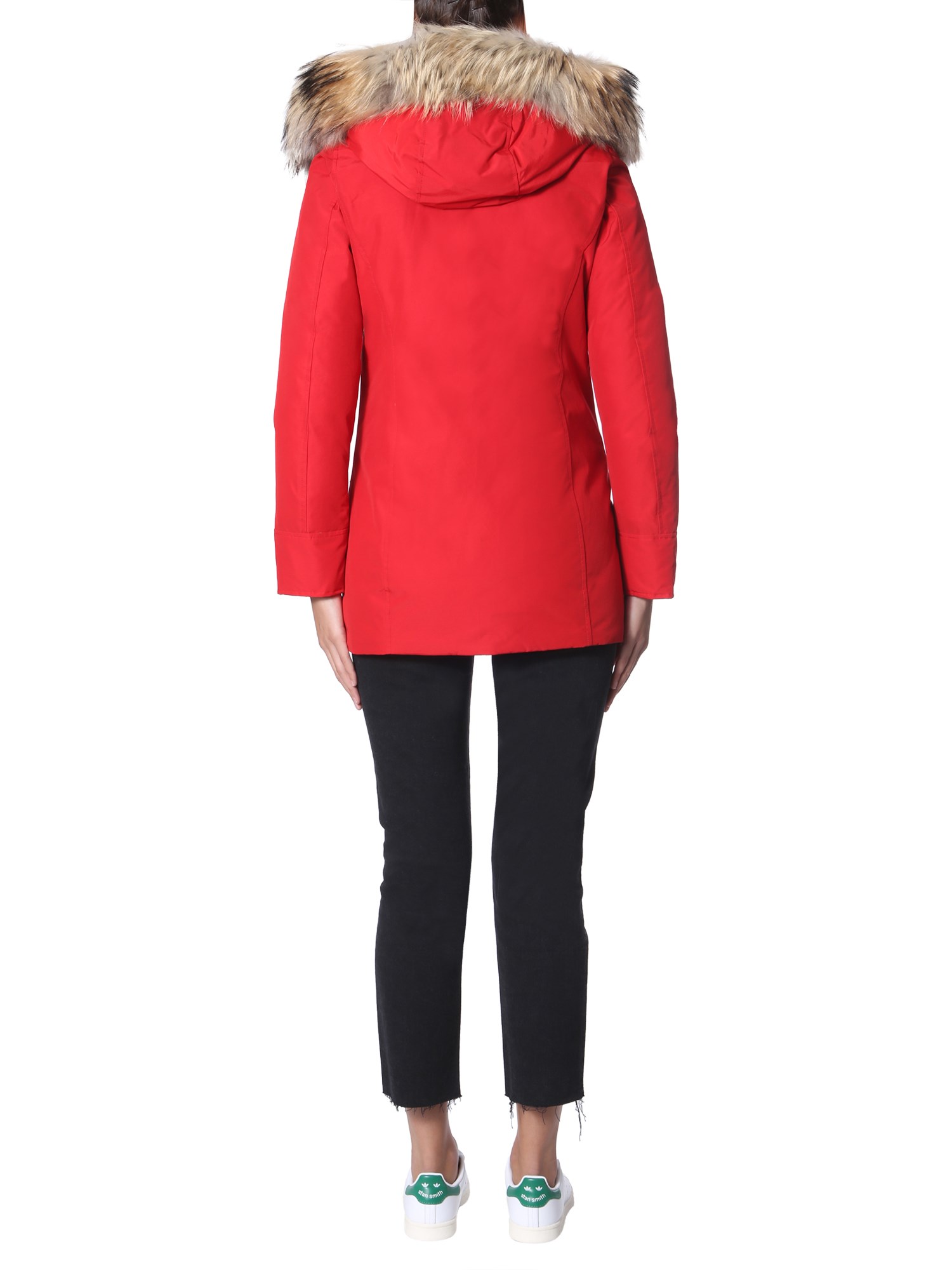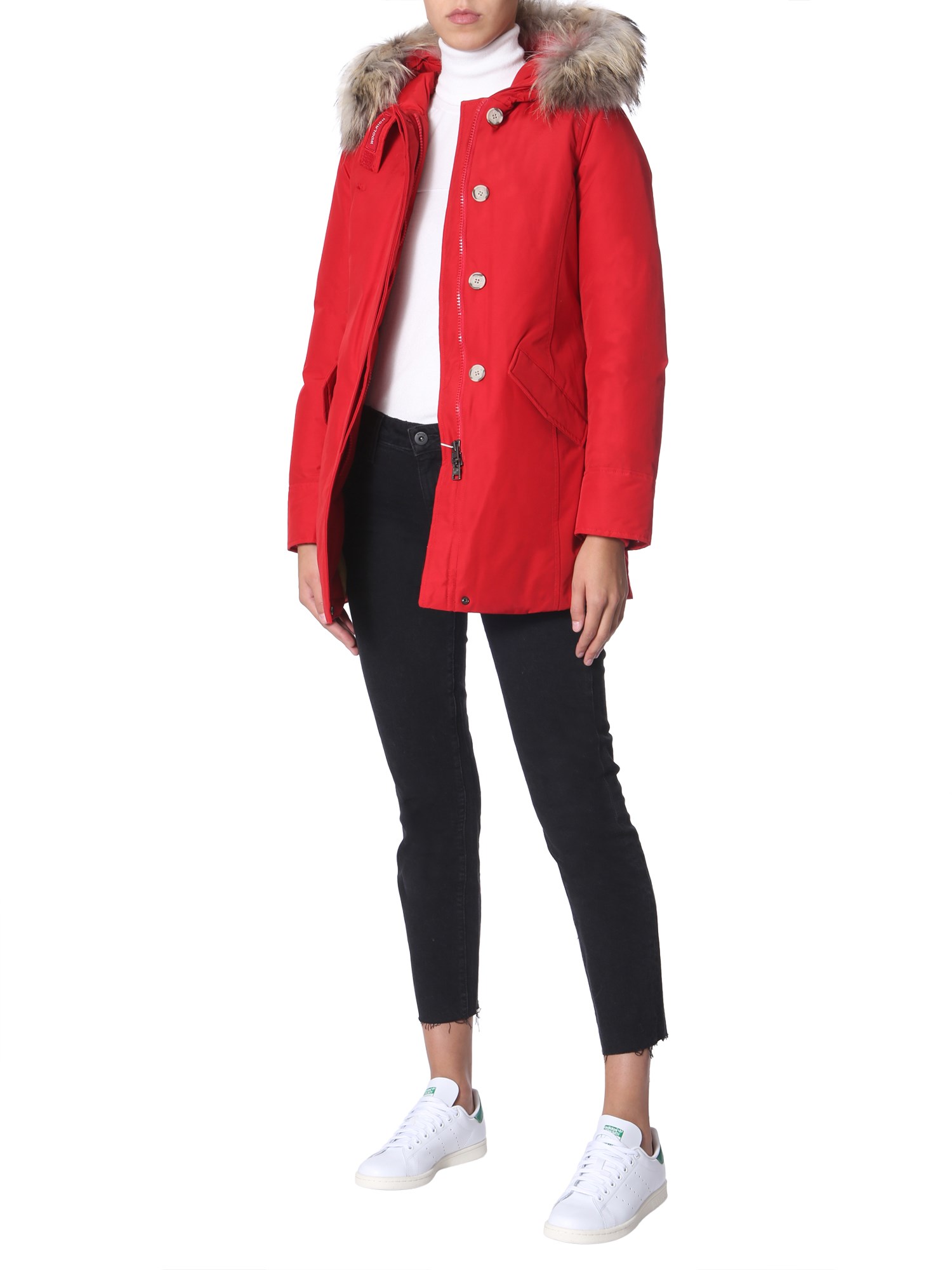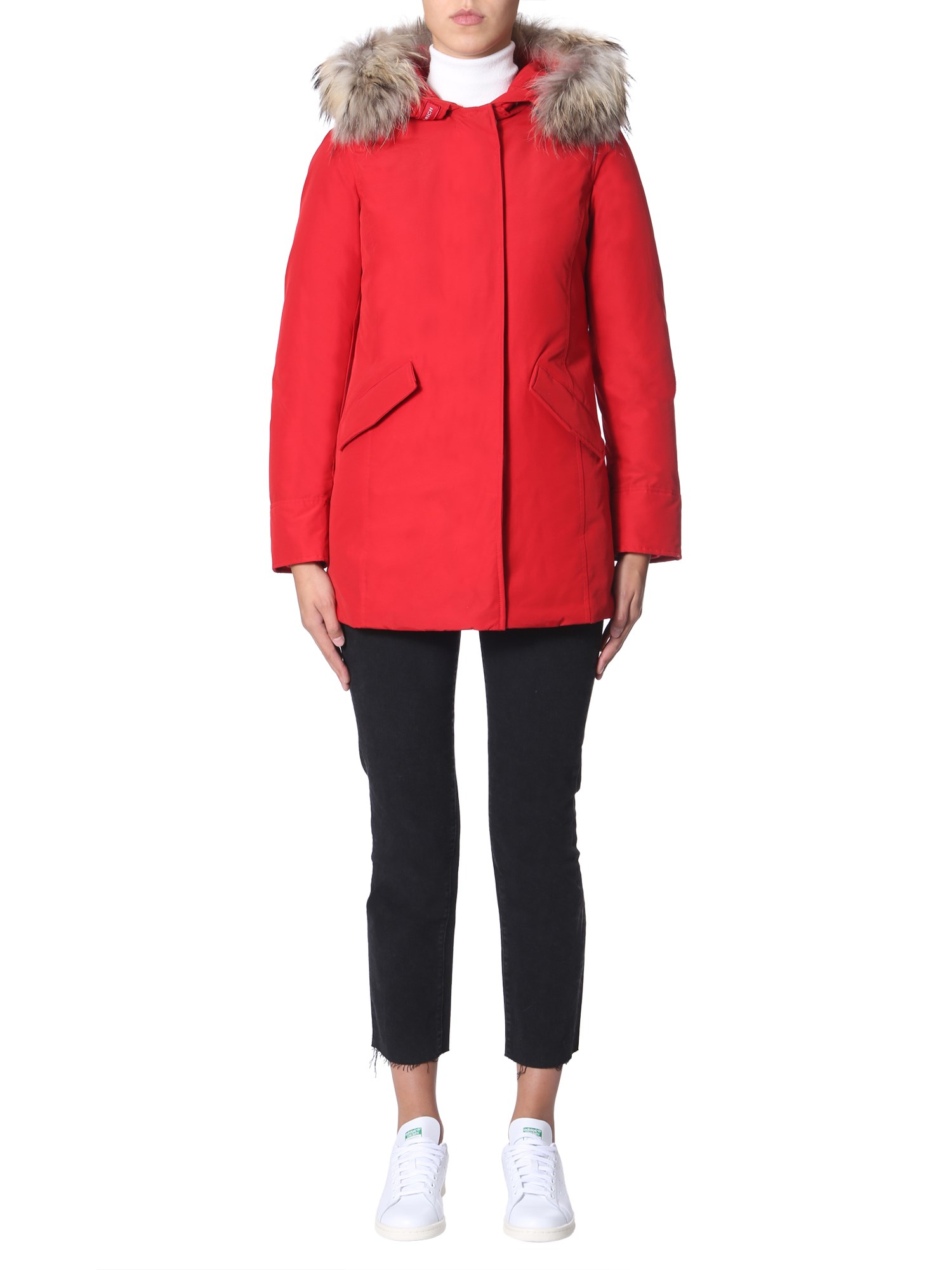 Be comfortable and stylish at the same time by wearing this Woolrich Arctic down jacket with fur hood. Made from a blended material, it has strong and damage-resistant exterior for a long-lasting use. This jacket comes with a hooded neck and zip closure at the front, which is adorned with shiny buttons and taped side pockets.