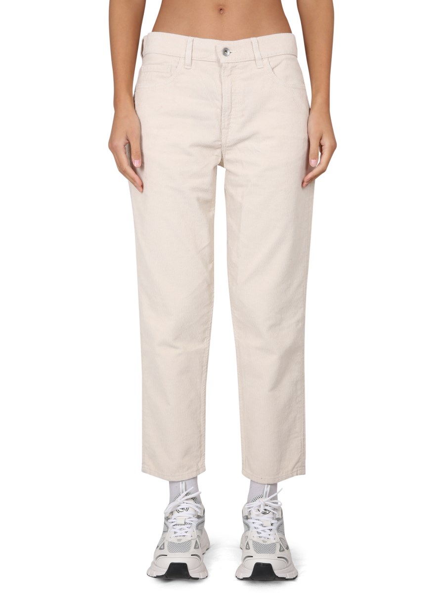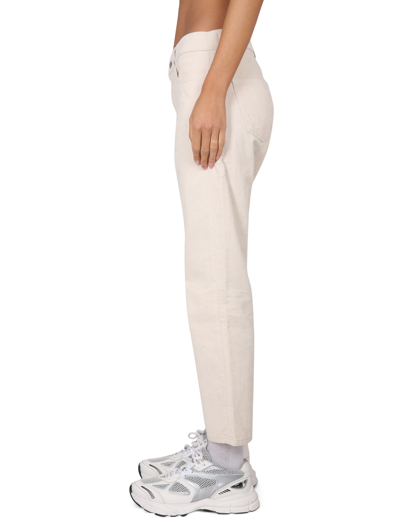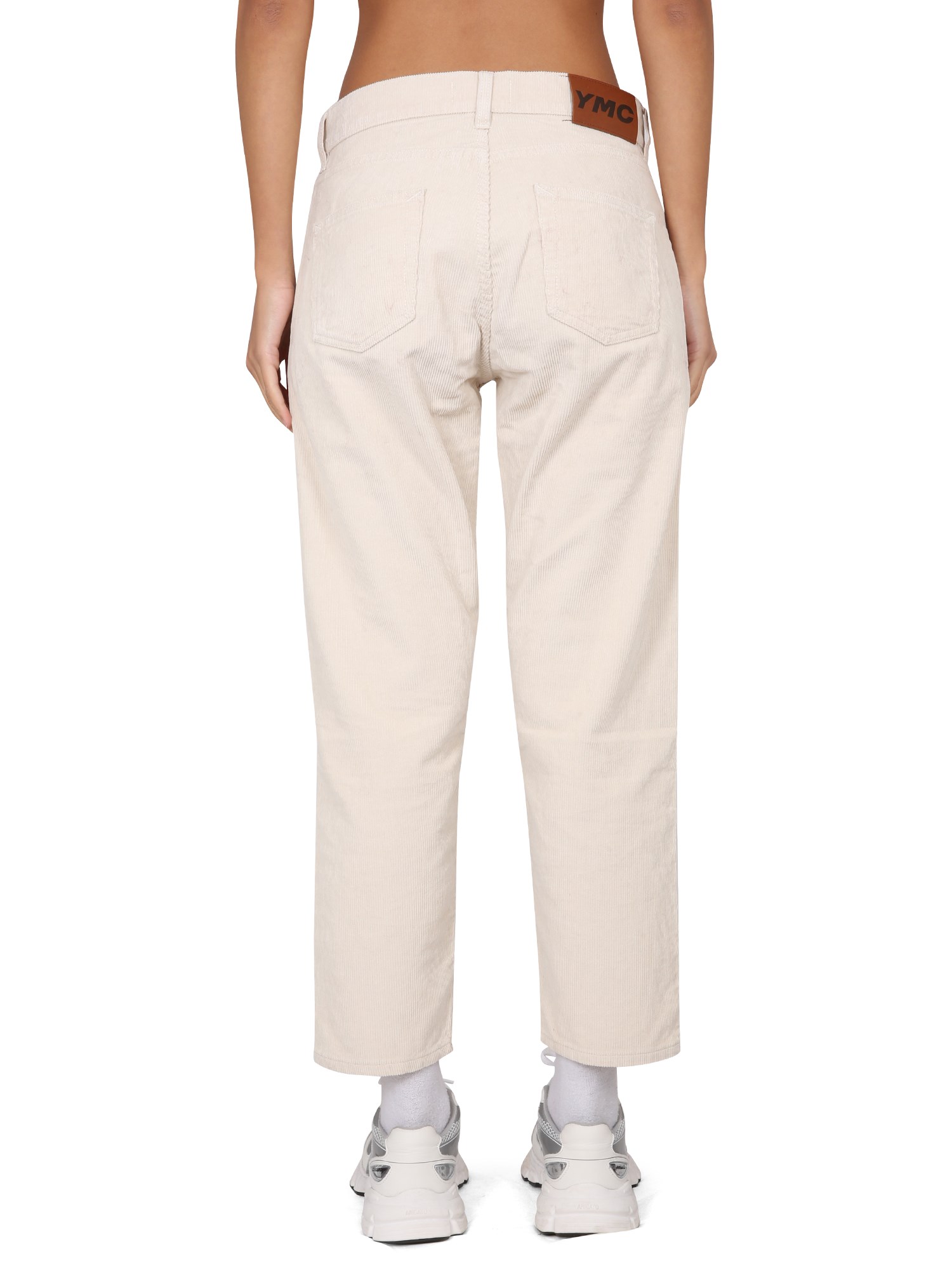 They are YMC jeans with five front pockets and standard waist size. They are constructed out of cozy cotton denim. These jeans have a straight leg, a high rise, and five pockets. They can be dressed up or down and are adaptable. They are quite comfortable to wear because they are both soft and stretchy.