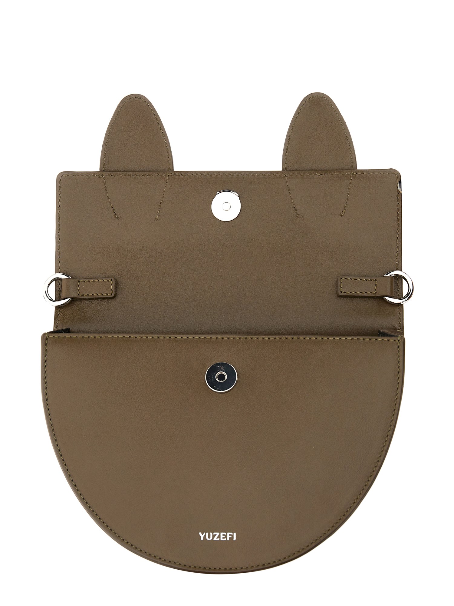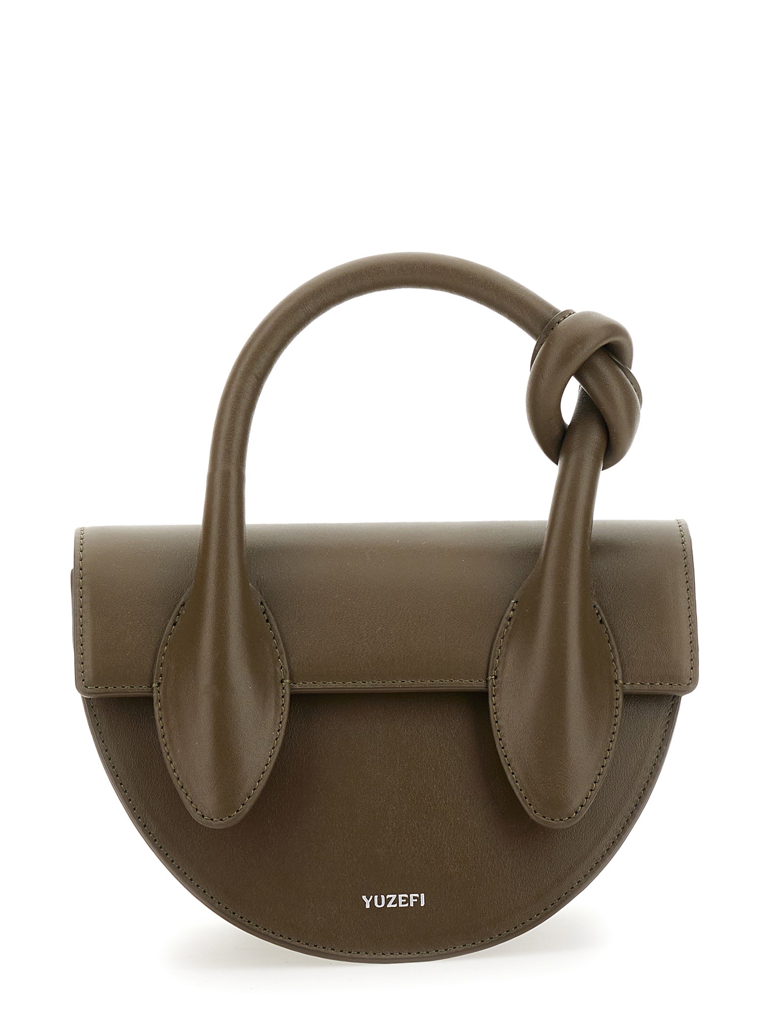 This is a brown leather bag from Yuzefi with a braided handle. The bag has a zipper top with a metal buckle closure. The bag has a knotted handle and a dark brown trim. It features a removable shoulder strap, snap button closure, and a suede-lined inner. The bag is made from 100% cowhide leather and it measures 14.5 cm x 21 cm x 13 cm.
