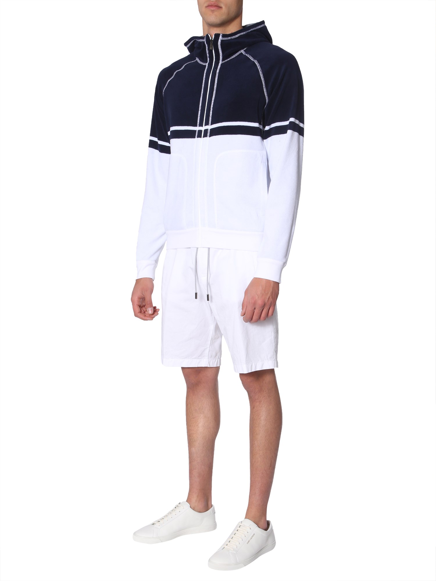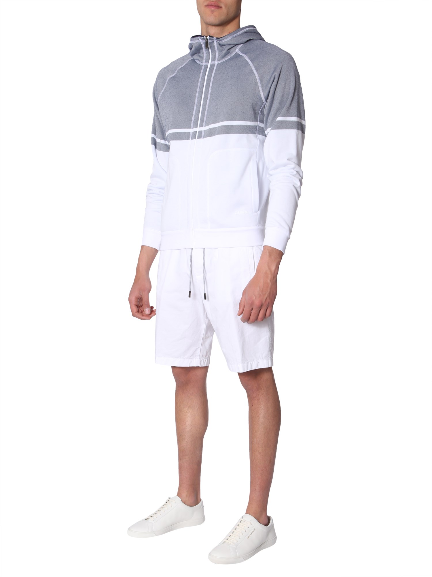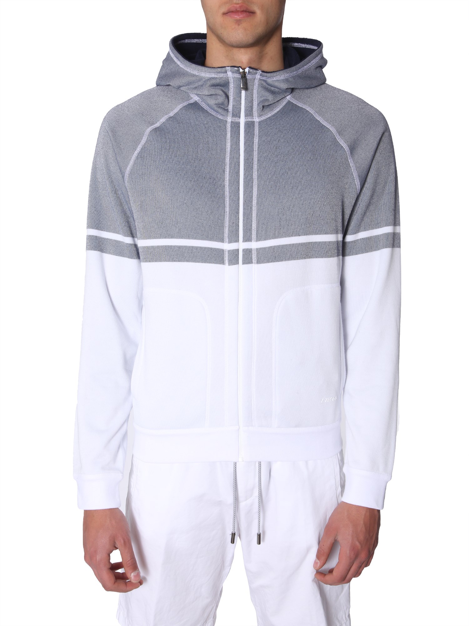 This winter, wrap yourself with this hooded sweatshirt from Z Zegna. Made from good quality, this sweatshirt feels soft against your skin. It has a zip closure for comfortable fit and two front pockets in the front. You can team this hoody with a pair of trousers for a complete casual look.