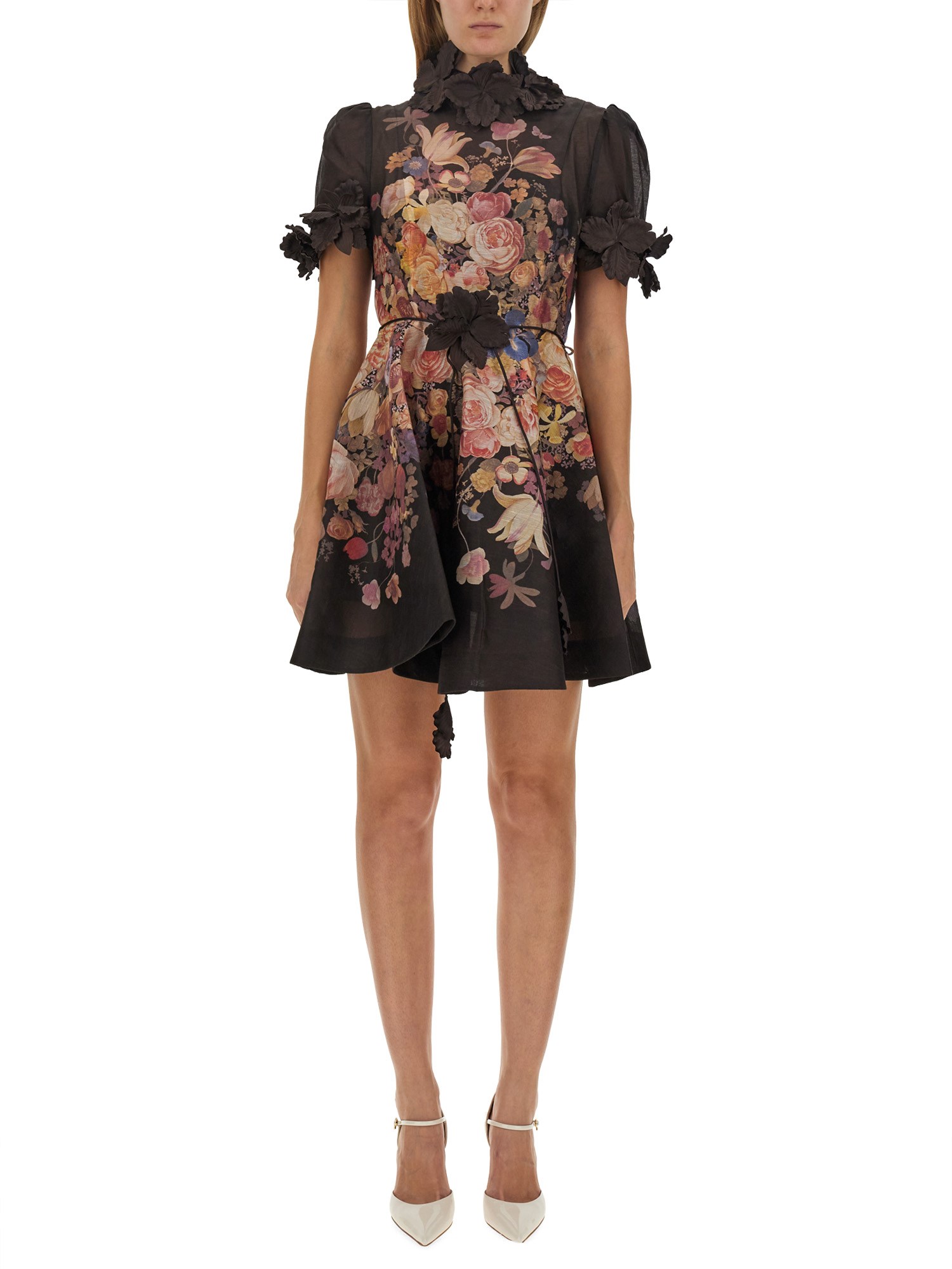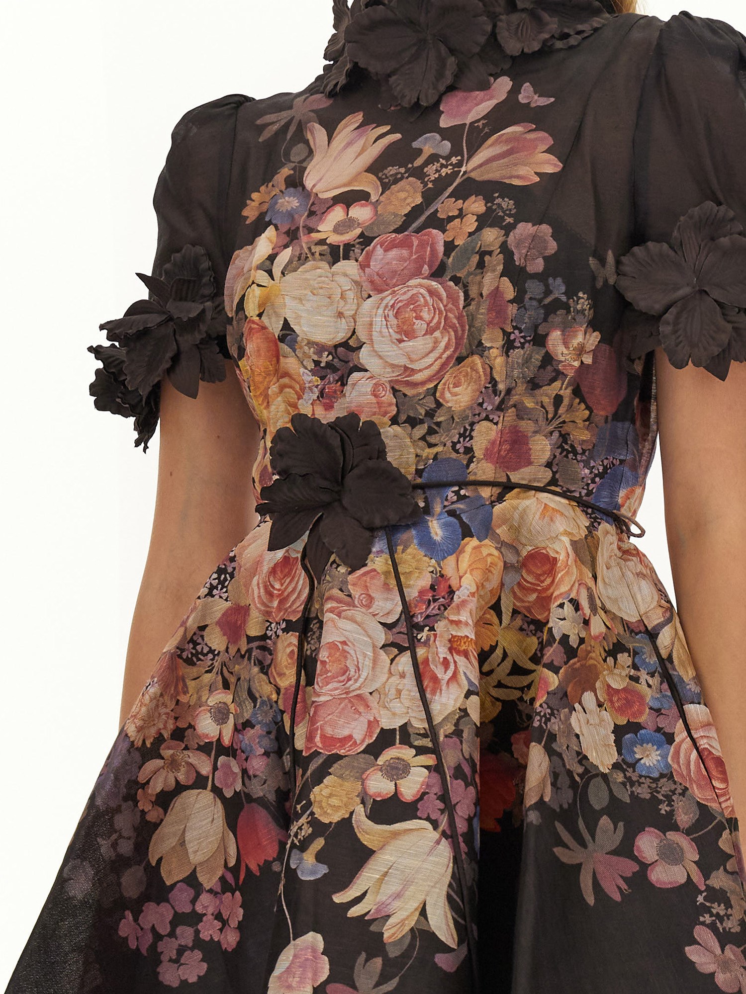This elegantly designed dress from Zimmerman combines the softness of linen and the luxury of silk to create a truly remarkable piece. With its high neck and A-line silhouette, this dress exudes elegance and sophistication. The dress features a beautiful floral pattern that adds a touch of femininity and charm. Made from a blend of linen and silk, this dress offers the perfect combination of comfort and luxury.