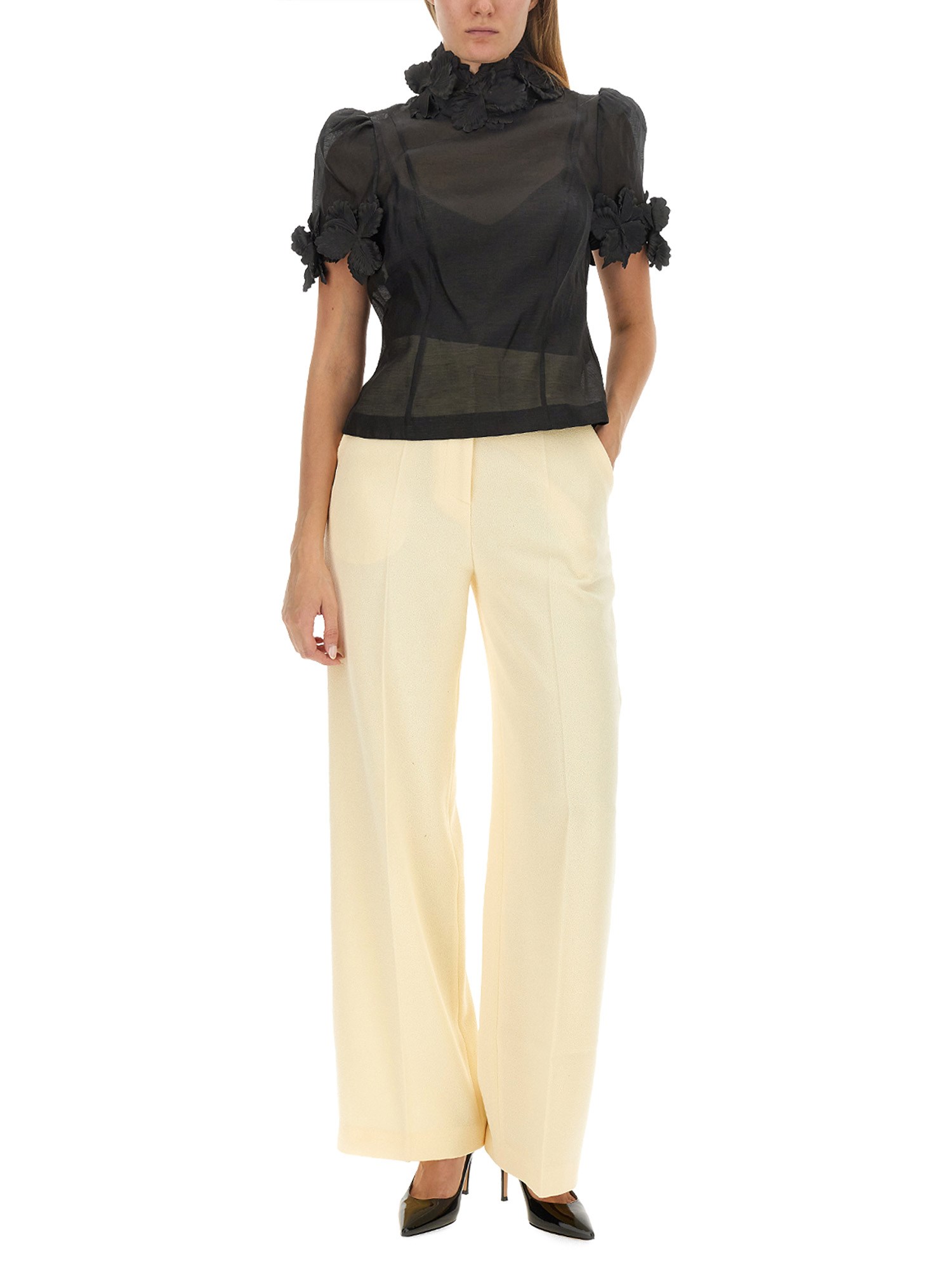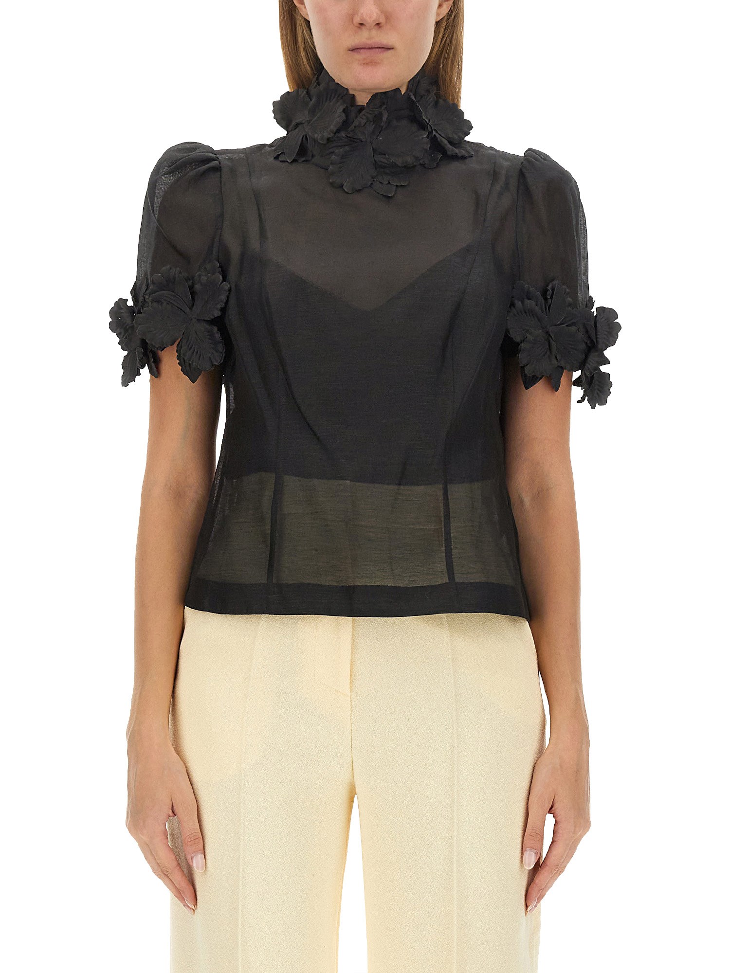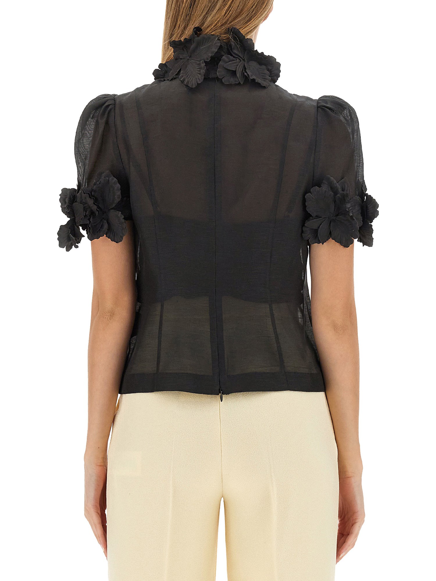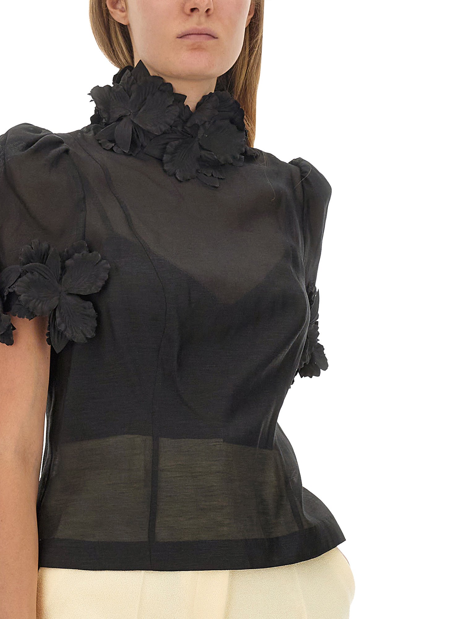 The Luminosity Liftoff Flower Top in Cream from the Fall 2023 Collection boasts a silk linen slim bodice with a flattering slim fit. Its short sleeves feature tulle in the sleeve head for added elegance, and the top is adorned with hand-applied 3D molded flowers. The piece is completed with an invisible zip closure, adding a touch of convenience to its exquisite design. Elevate your style with this sophisticated and unique top.