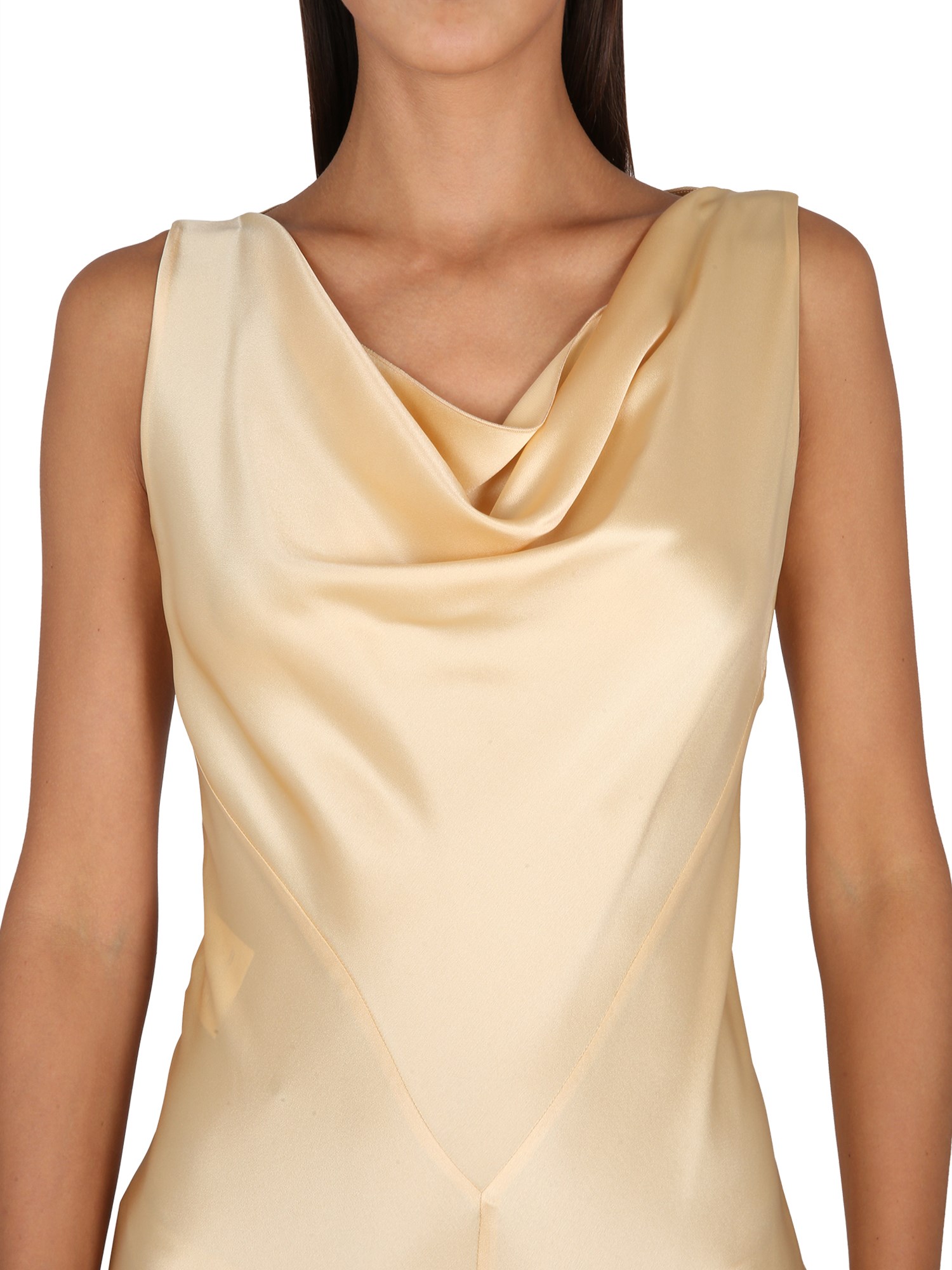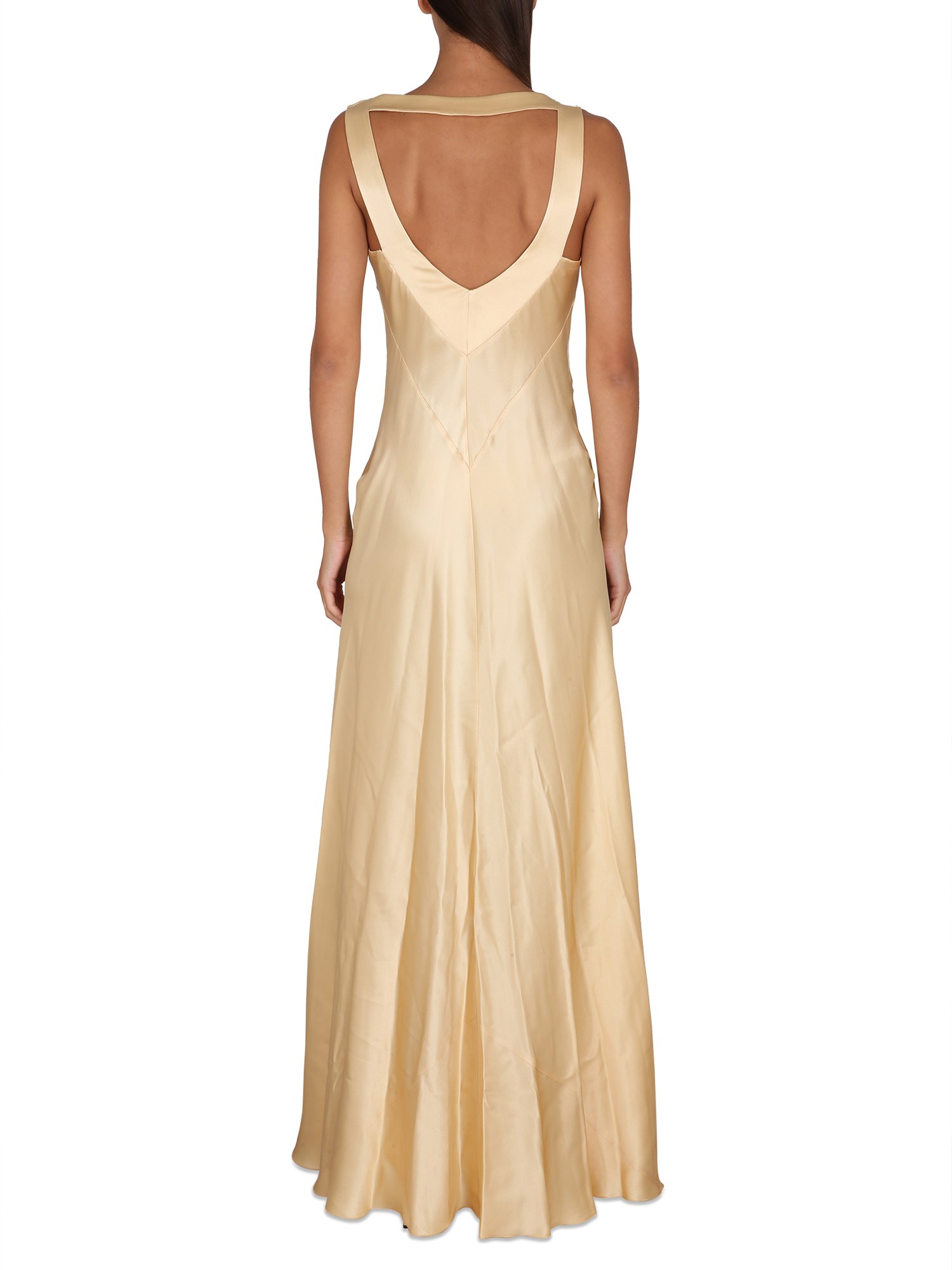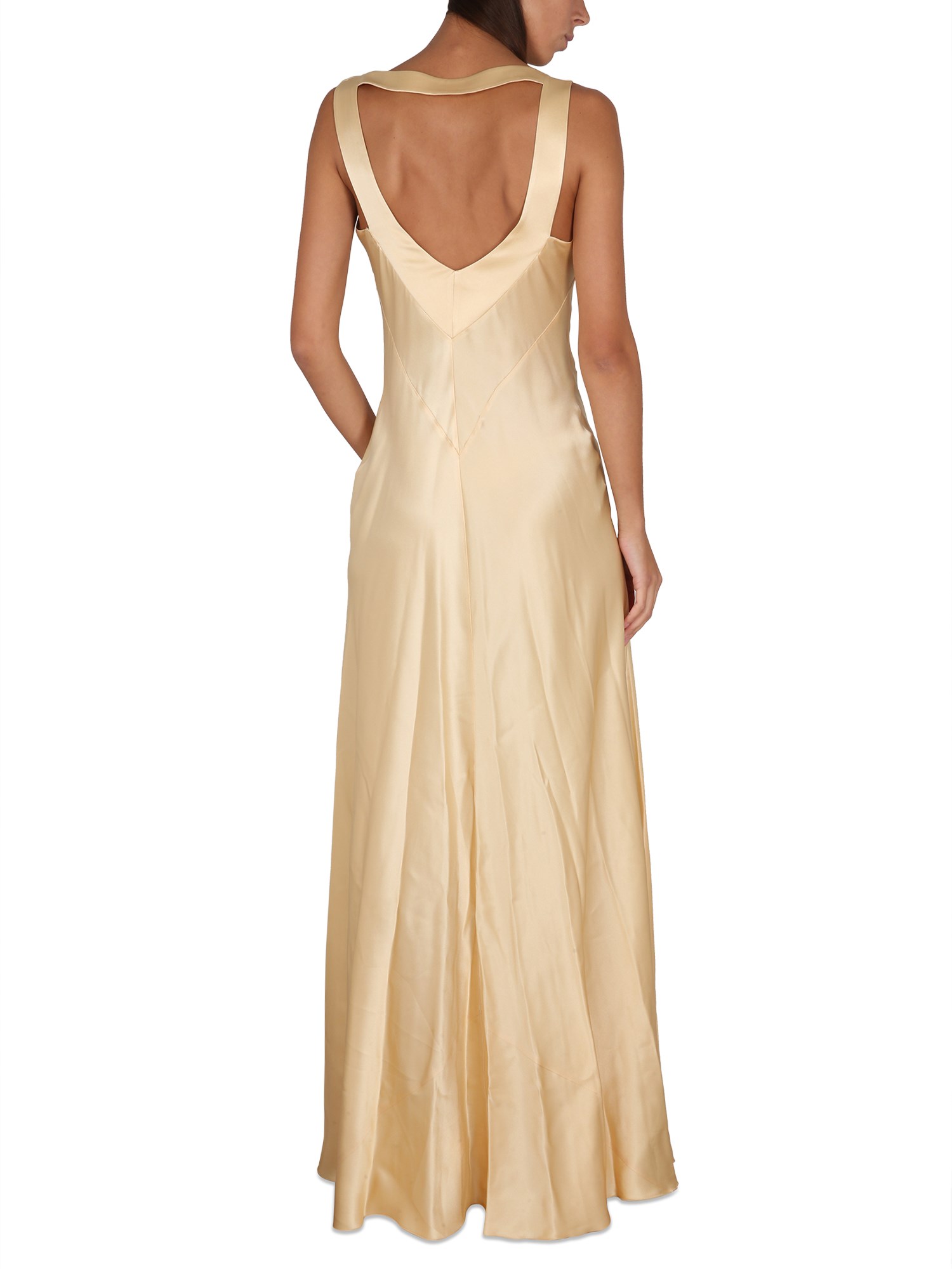 Abito da sera lungo in raso brillante dal taglio scivolato, che accarezza i fianchi, per poi scendere ed essere svasato sul fondo. La scollatura drappeggiata e l'ampio cut-out sulla schiena aggiungono sensualità al capo.