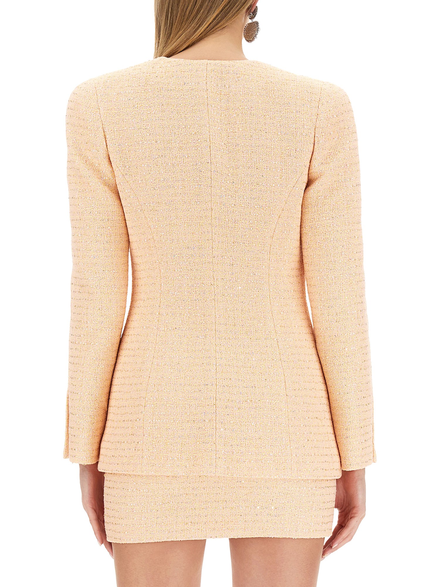 Questa lussuosa giacca di Alessandra Rich è realizzata in tweed di paillettes, un tessuto che sembra un mix di metallo e lustrini. Presenta una chiusura a doppio petto con bottoni e un colletto arrotondato. È un capo ideale da sovrapporre a una camicia o a un abito per un look più formale. Questo capo classico si abbina a qualsiasi look.