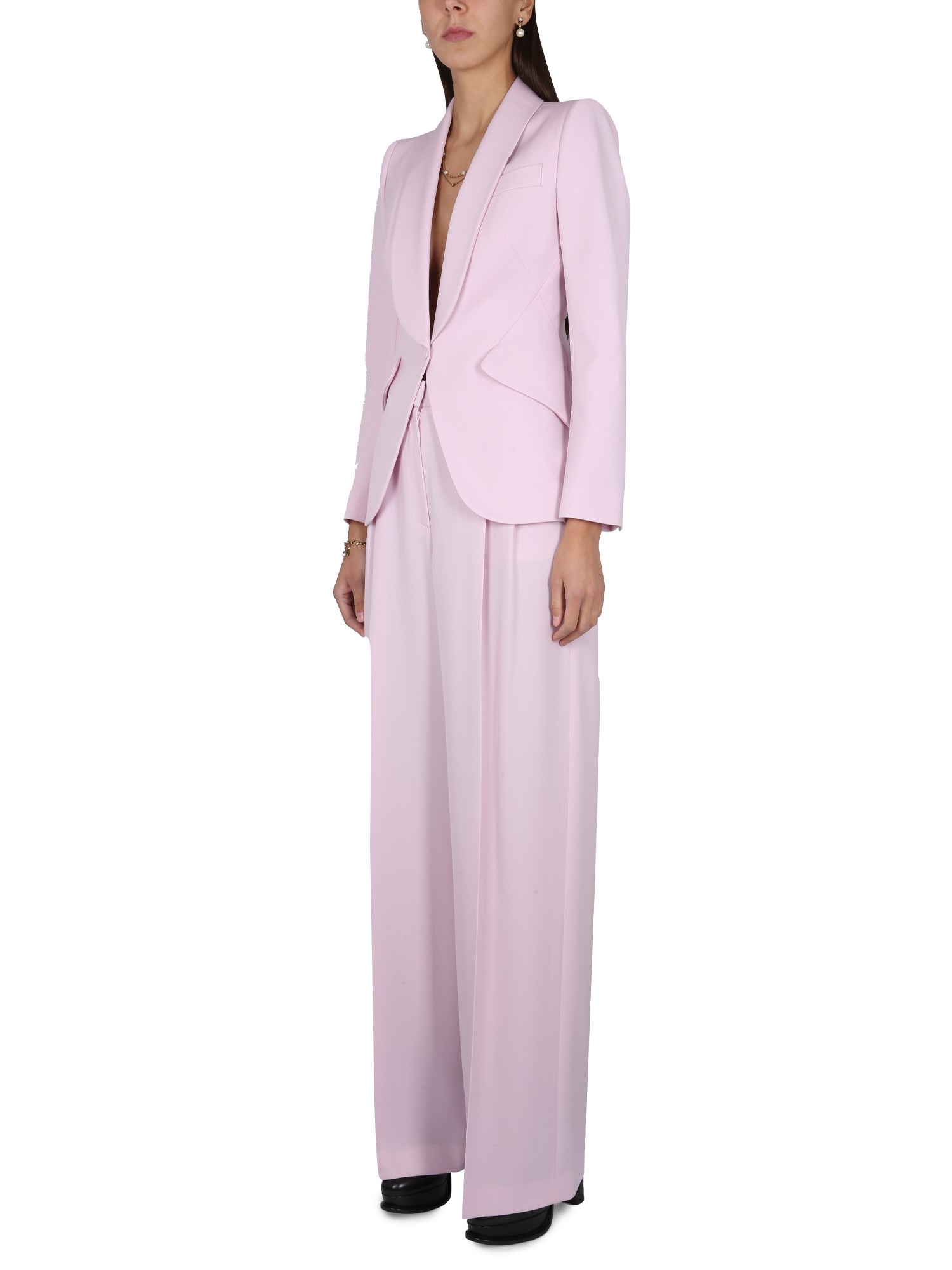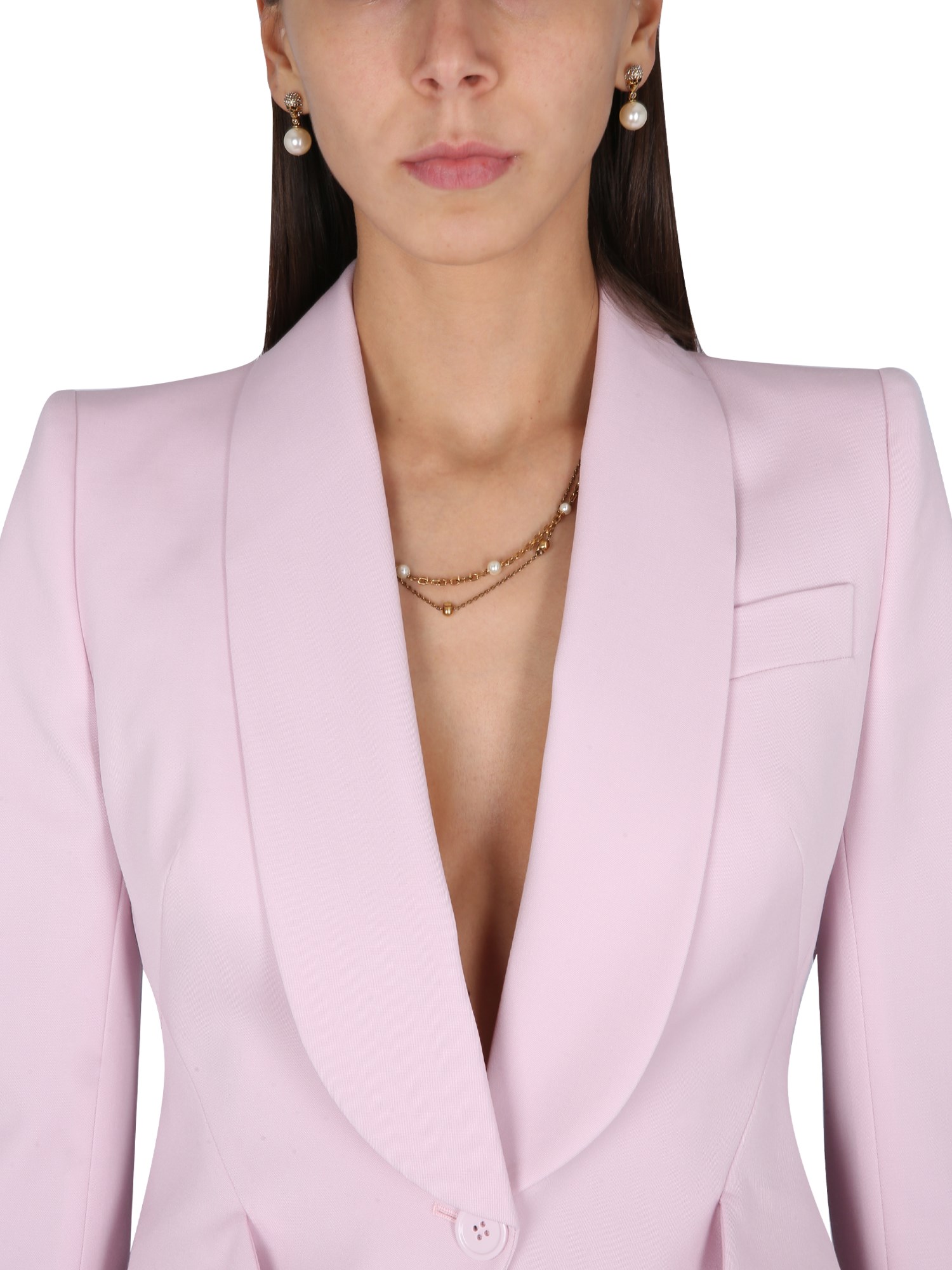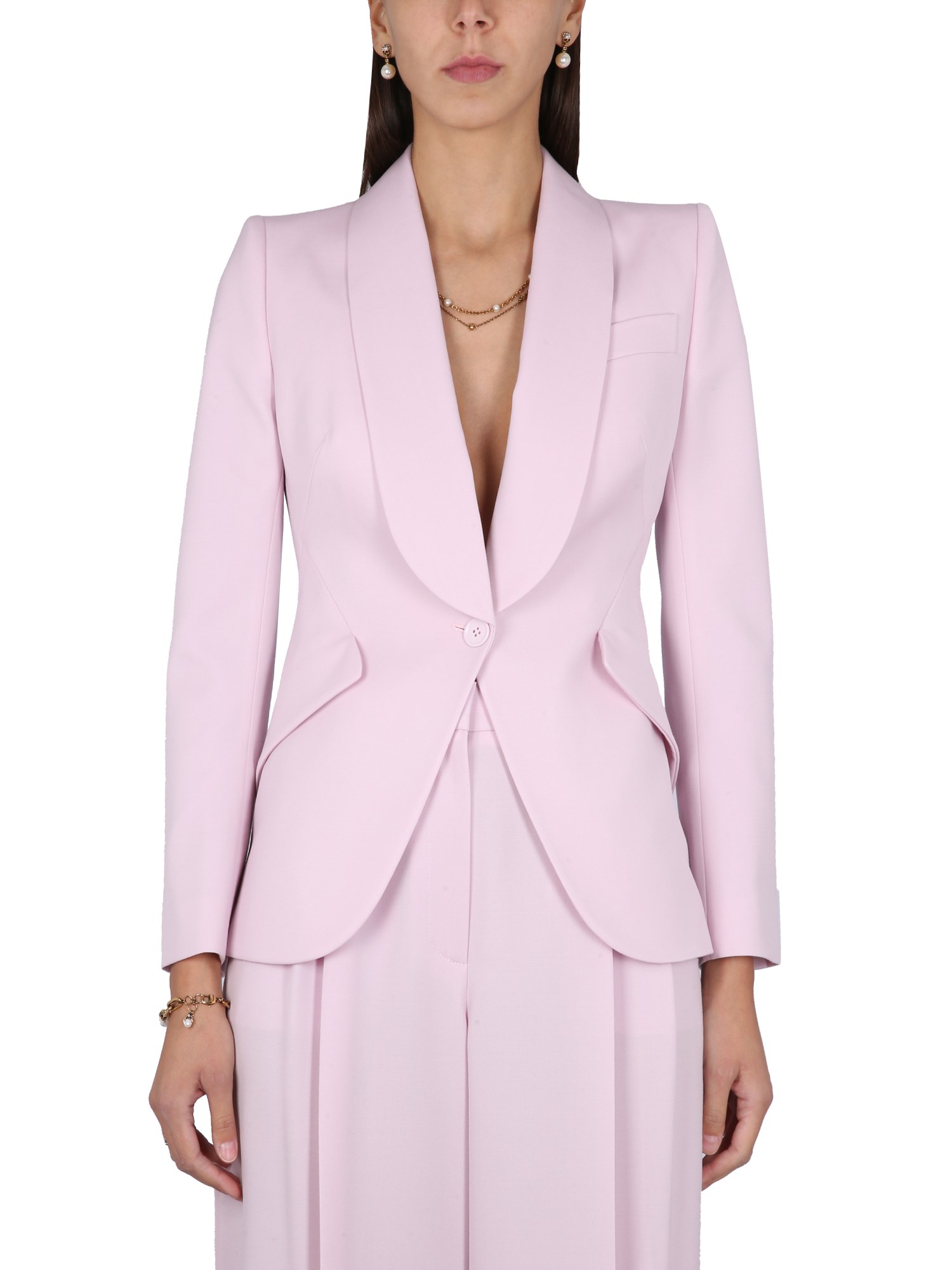 Giacca sartoriale a un bottone in grain de poudre porcellana con revers a scialle e spalle a punta. La giacca presenta una tasca a fessura sul petto, due tasche con patta sui lati e una chiusura a un bottone.