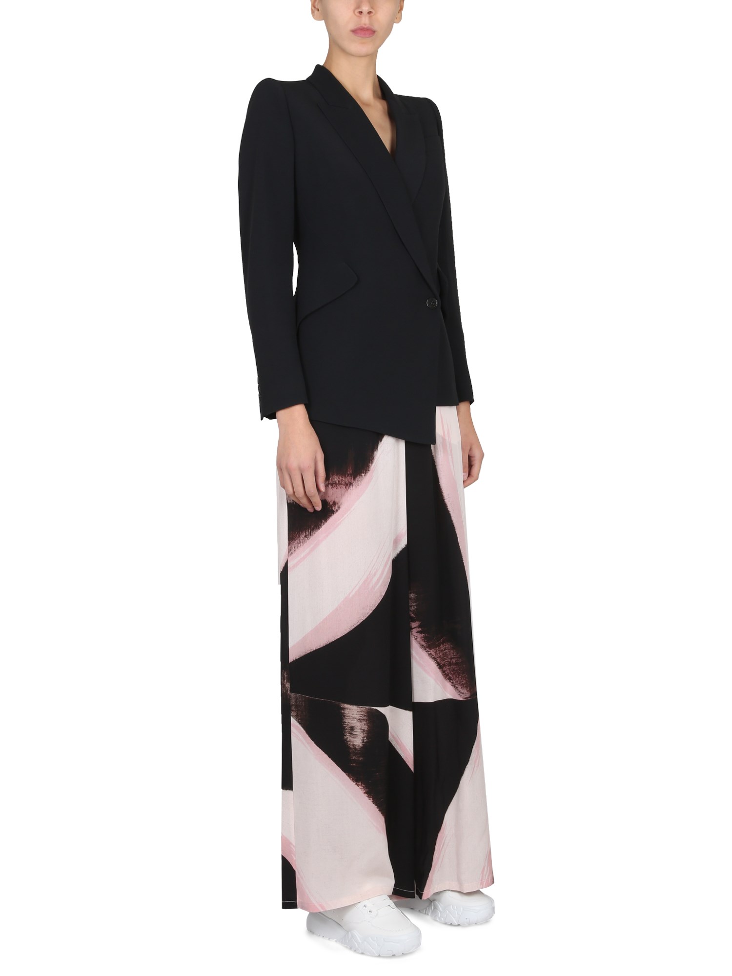 Questi eleganti pantaloni a gamba larga di Alexander McQueen sono realizzati in misto seta, tanto lussuosi quanto belli. La vita alta, l'elastico in vita e la gamba larga li rendono perfetti per ogni occasione. I pantaloni sono realizzati con una seta leggera, che conferisce loro un aspetto e una sensazione fantastici. I pantaloni hanno una gamba larga che li rende perfetti per una lunga giornata di camminate.