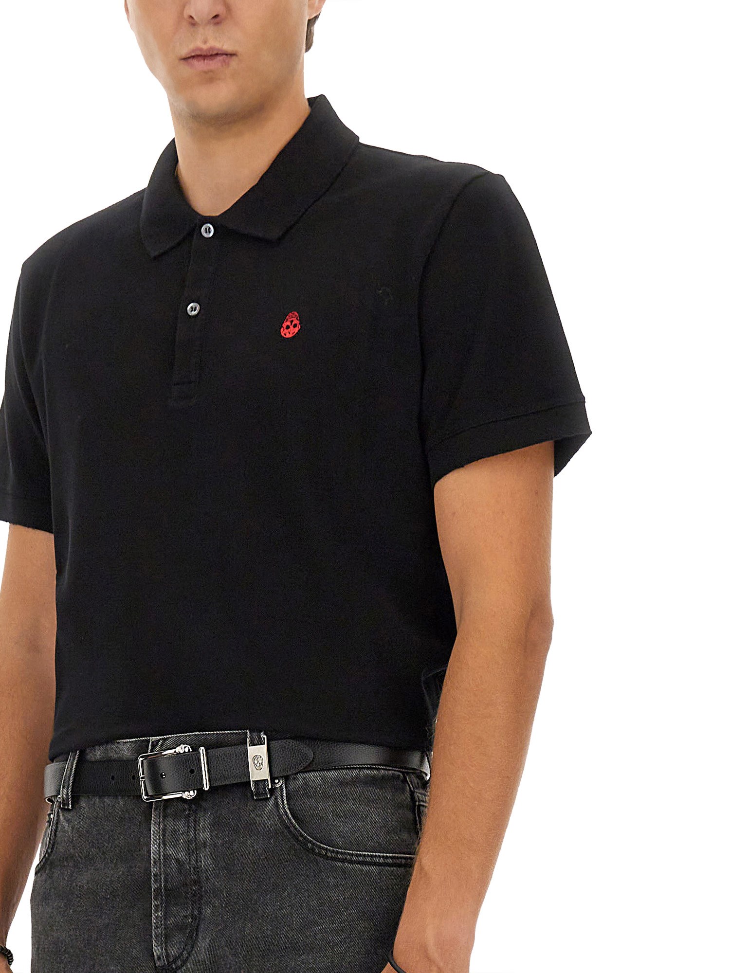 Vi presentiamo la polo "SKULL" di Alexander McQueen! Questa elegante polo presenta un colletto classico, maniche corte e orlo dritto per un look senza tempo. Il logo del marchio sul petto a sinistra aggiunge un tocco di stile. Realizzata in morbido cotone, questa polo è perfetta per un outfit casual ma raffinato.