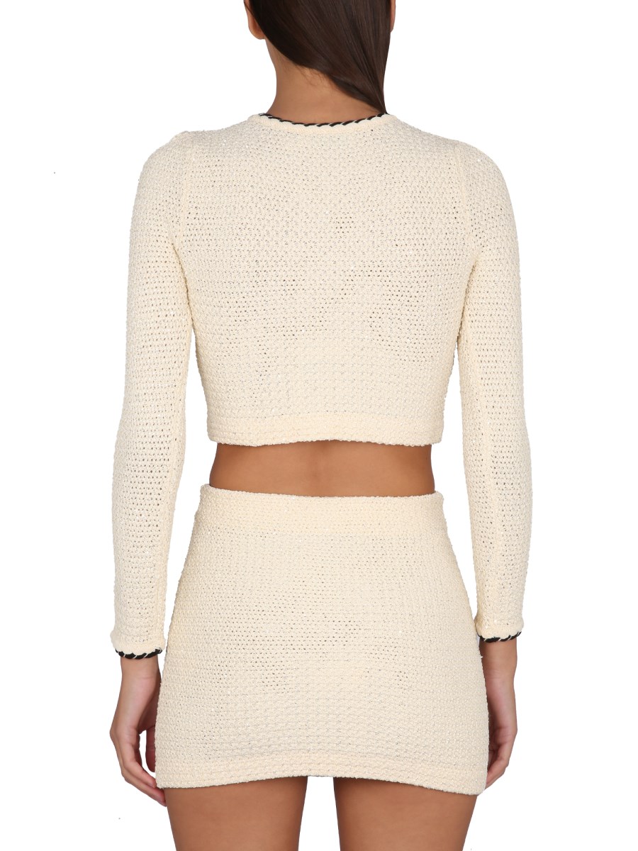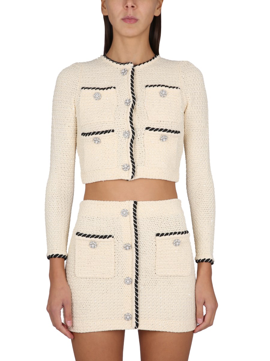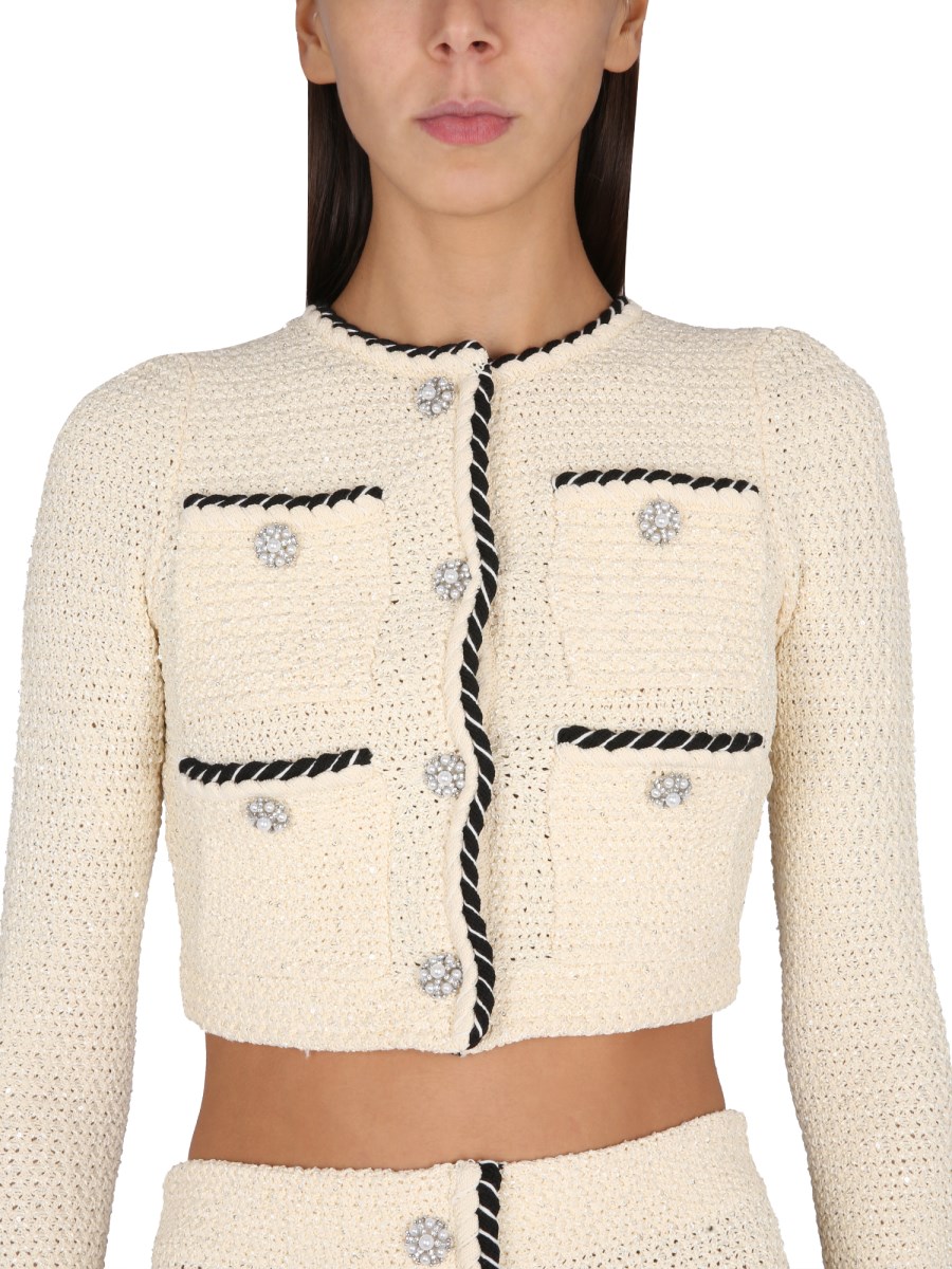 Cosa c'è di meglio di un cardigan elegante e senza tempo? Ecco la nostra risposta: un cardigan lavorato a maglia in tessuto di paillettes color crema per una maggiore lucentezza e una sensazione di sostanza. Questo capo, che vanta un taglio cropped, ha bordi intrecciati, bottoni con diamanti perlati e numerose tasche per tutti i vostri oggetti quotidiani. Indossatelo per ogni occasione, dalla colazione di lavoro all'appuntamento con la cena dopo il lavoro.