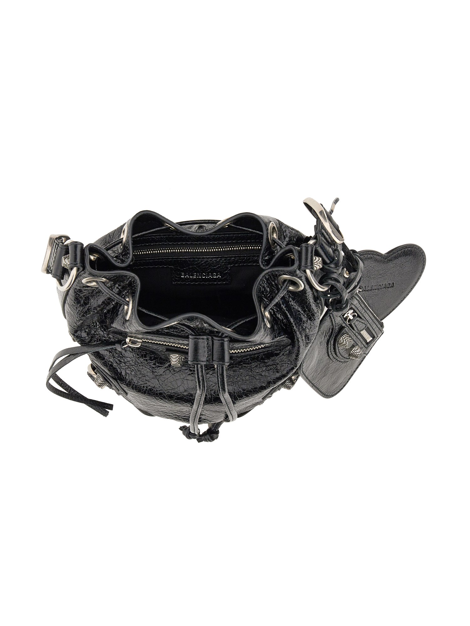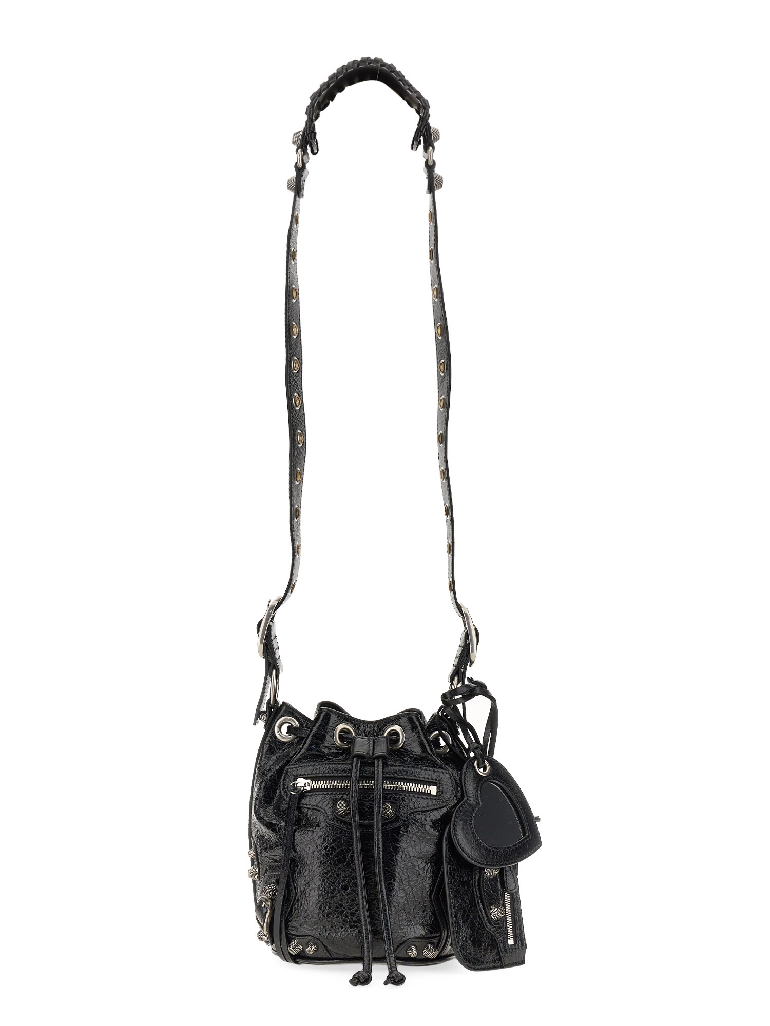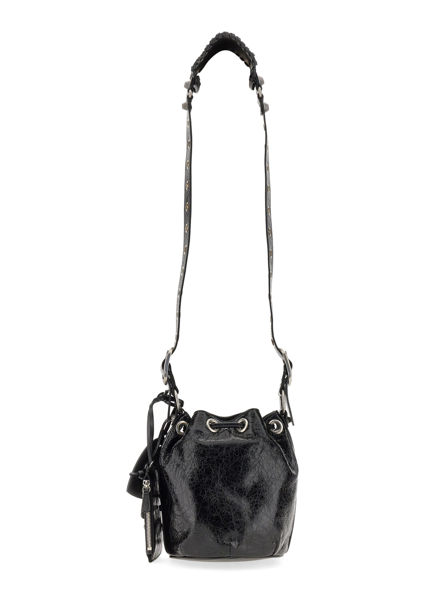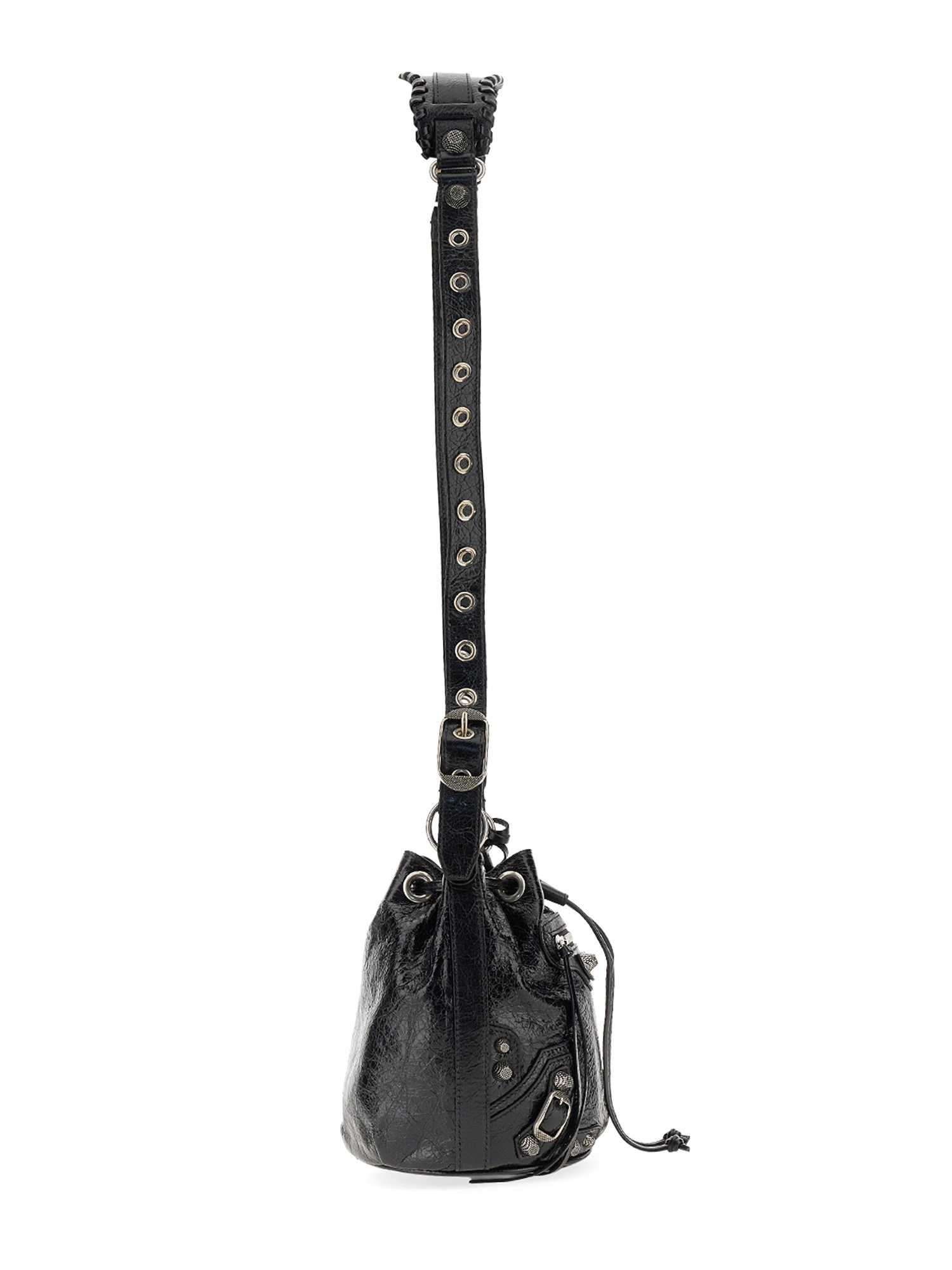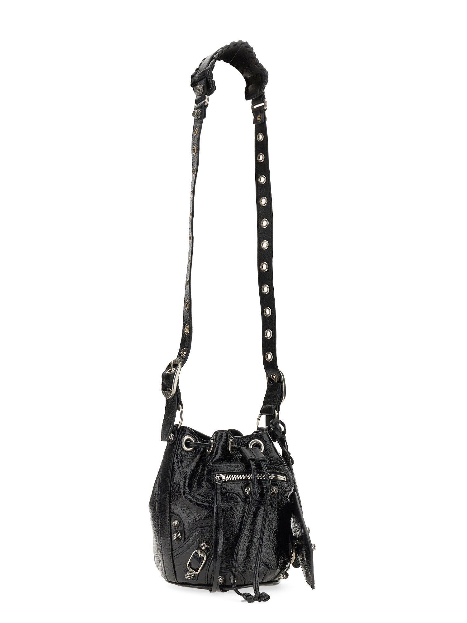 Con la sua pelle resistente e la sua texture ricca, questa borsa a secchiello Le Cagole XS di Balenciaga è un must-have per ogni donna attenta alla moda. Presenta una tracolla regolabile, un poggia spalle in pelle intrecciata, finiture in argento anticato, una tasca frontale con cerniera e tiretto in pelle annodato e una chiusura con coulisse. La borsa è dotata di una tasca interna con cerniera e di una custodia rimovibile con cerniera.