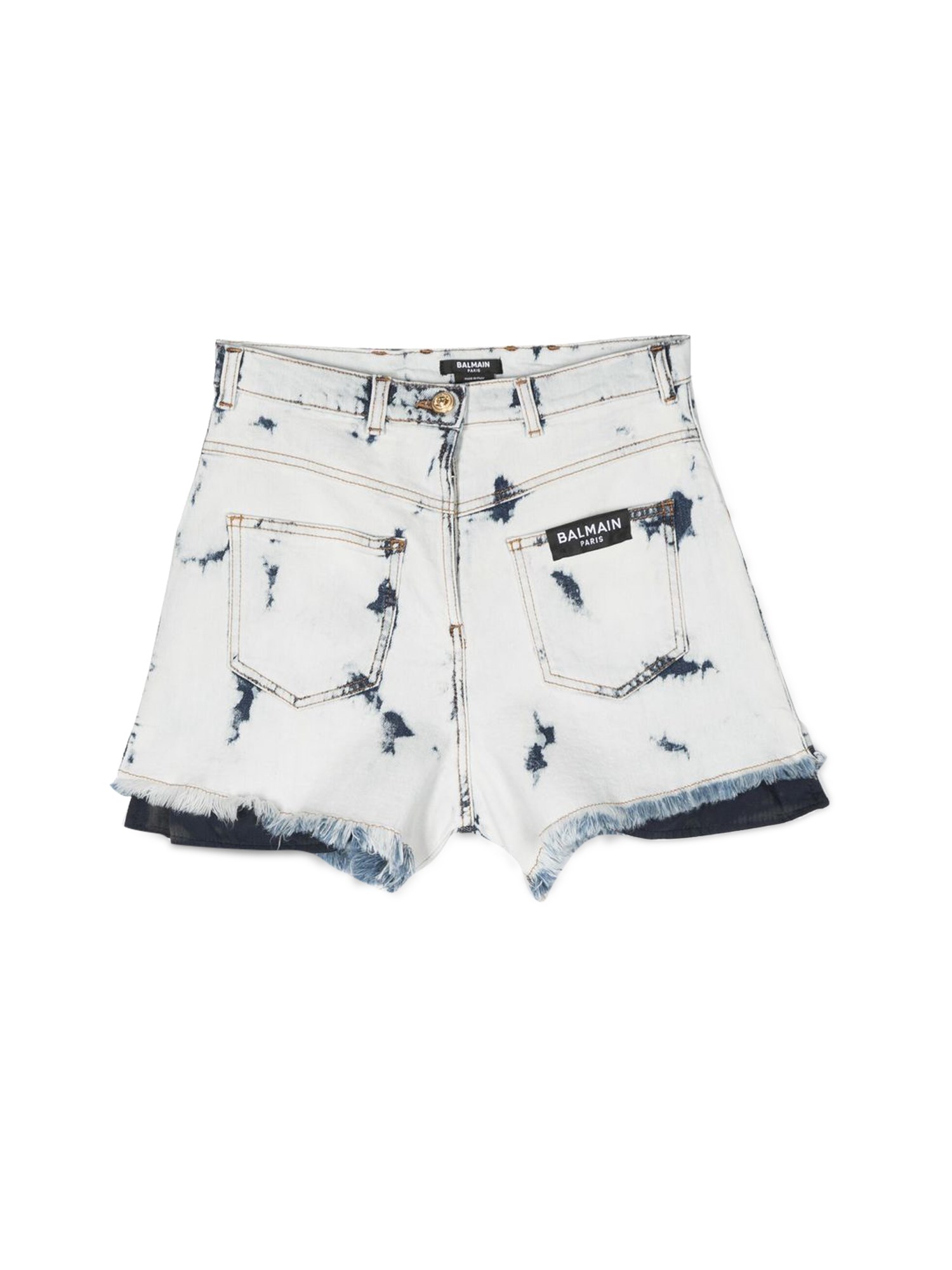 Questo paio di bermuda in denim di cotone ed elastan di Balmain sono pantaloncini casual con chiusura a bottone e cerniera, realizzati in cotone pregiato. I bermuda hanno una vita alta con coulisse per una vestibilità comoda. Questi pantaloncini sono perfetti per la spiaggia o per una giornata informale.