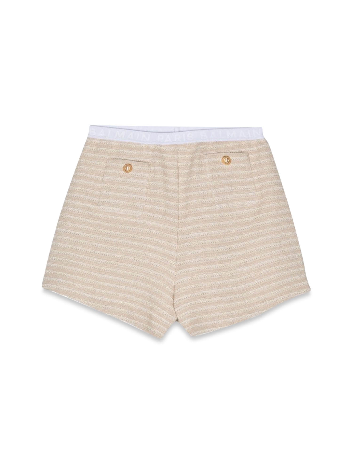 Questi eleganti pantaloncini in cotone a righe per bambini di Balmain sono l'aggiunta perfetta al guardaroba estivo di ogni bambino. Realizzati in cotone di alta qualità, questi pantaloncini non sono solo comodi ma anche resistenti per essere indossati tutto il giorno. Il classico design a righe aggiunge un tocco divertente e trendy a qualsiasi outfit, rendendoli versatili per diverse occasioni. Grazie all'elastico in vita per indossarli e toglierli facilmente, questi pantaloncini sono pratici e alla moda per i bambini attivi in movimento. Ideali per i giochi, le giornate in spiaggia o semplicemente per rilassarsi a casa, questi pantaloncini in cotone a righe sono un must-have per ogni bambino in questa stagione.