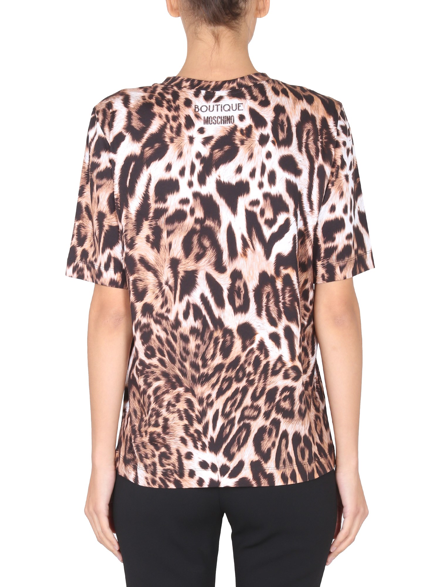Questa T-shirt di Boutique Moschino presenta un'elegante stampa animalier. La maglietta è realizzata in un morbido tessuto di cotone, un materiale comodo e leggero, perfetto da indossare nelle giornate più calde. Presenta una scollatura a girocollo, maniche lunghe e orlo dritto. La maglietta, in stile pull-on, ha una vestibilità oversize.